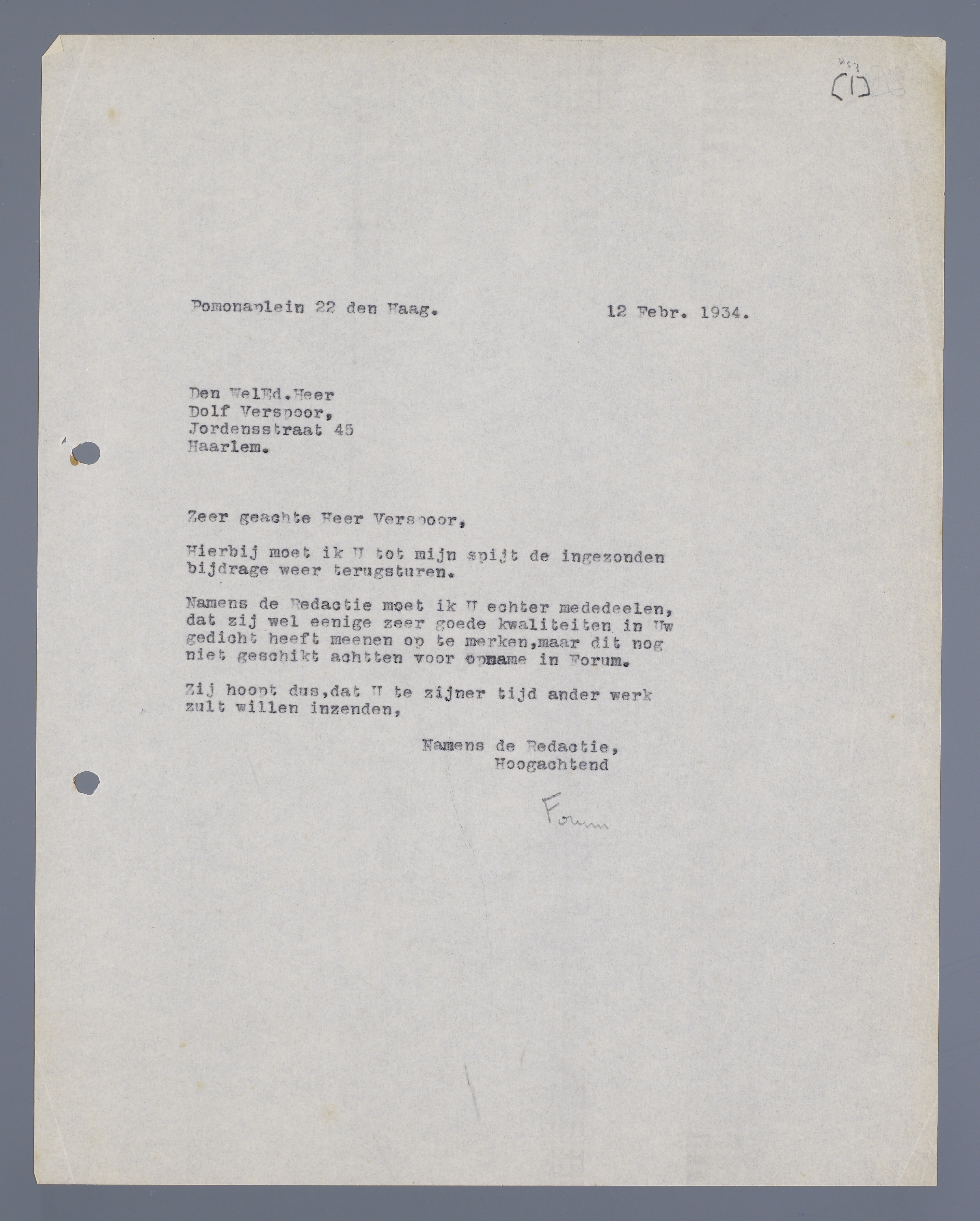 Namens de redactie moet ik U echter mededeelen, dat zij wel eenige zeer goede kwaliteiten in Uw gedicht heeft meenen op te merken, maar dat zij dit nog niet geschikt achtten voor opname in Forum