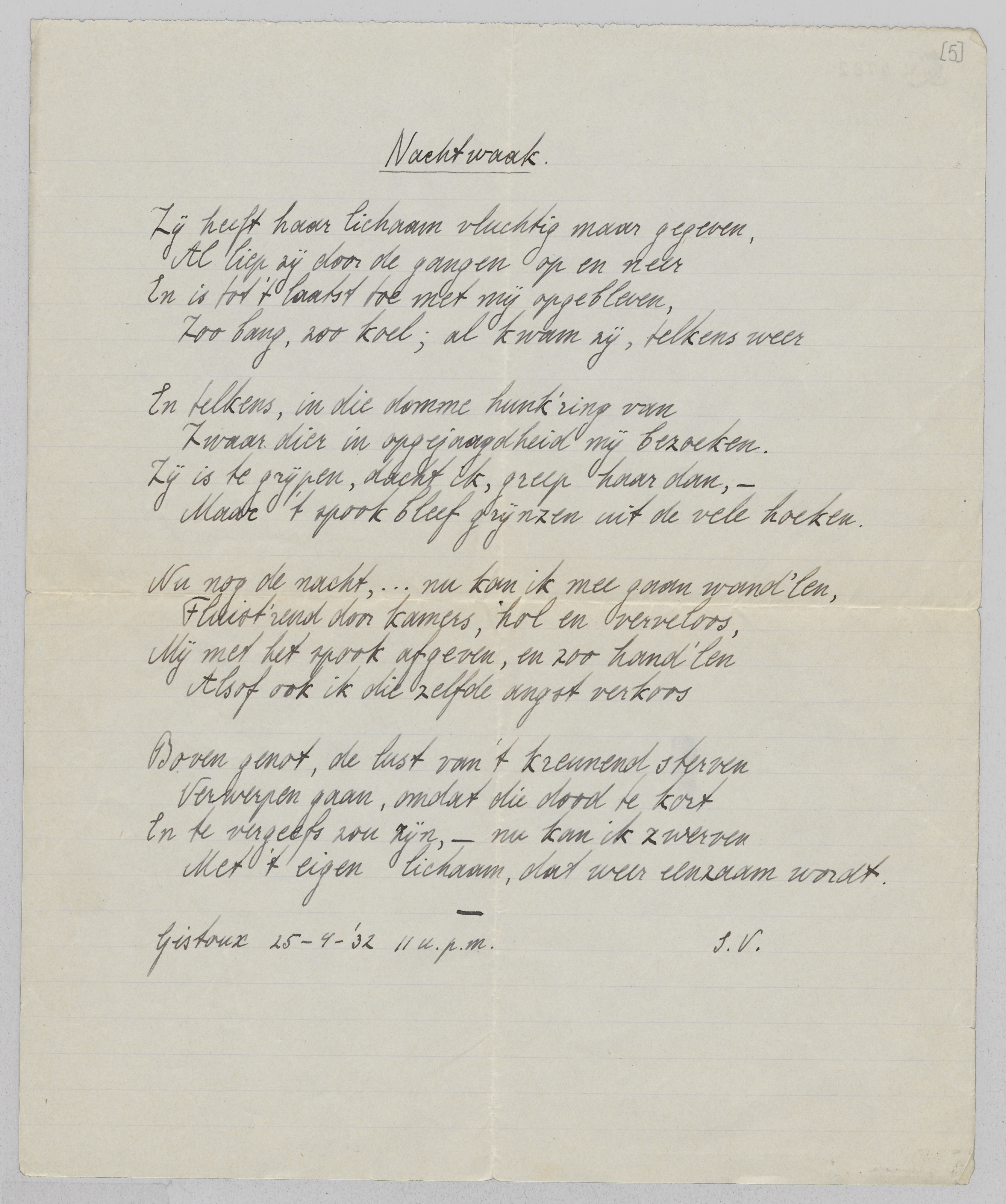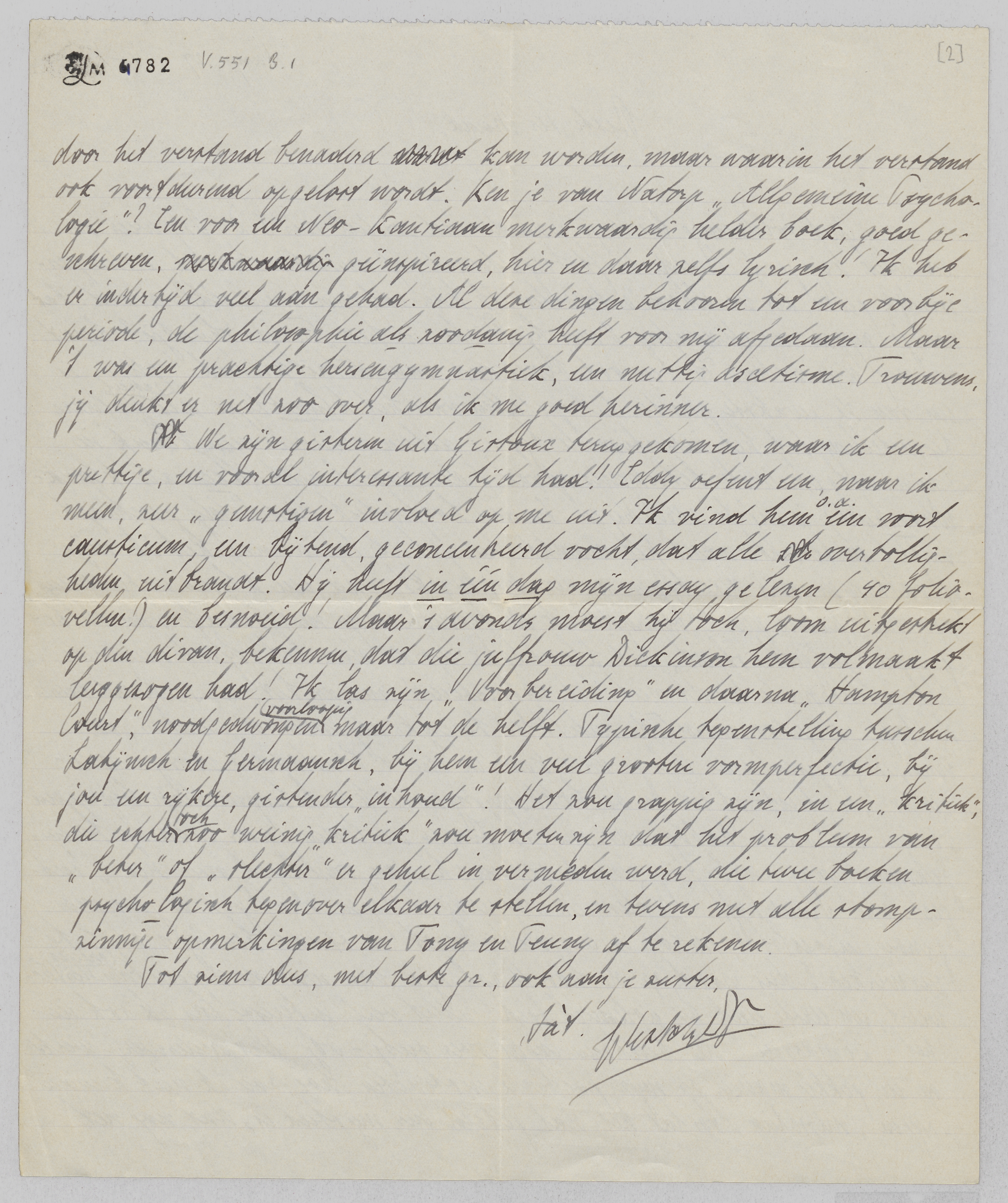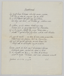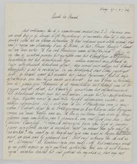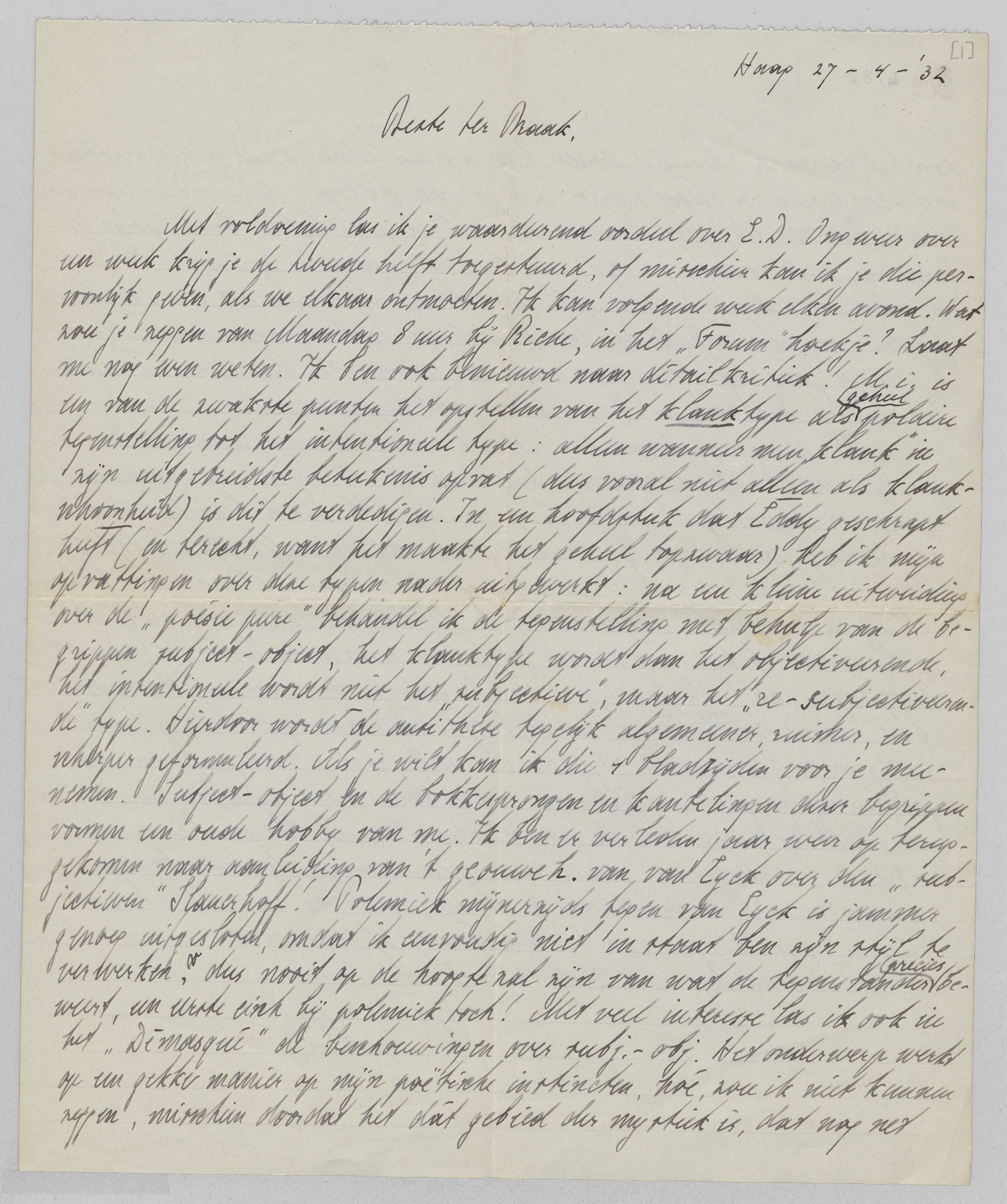 Met voldoening las ik je waardeerend oordeel over E.D. Ongeveer over een week krijg je de tweede helft toegestuurd, of misschien kan ik je die persoonlijk geven, als we elkaar ontmoeten. Ik kan volgende week elken avond. Wat zou je zeggen van Maandag 8 uur bij Riche, in het ‘Forum’ hoekje? Laat me nog even weten. Ik ben ook benieuwd naar détailkritiek! M.i. is een van de zwakste punten het opstellen van het klanktype als geheel polaire tegenstelling tot het intentioneele type: alleen wanneer men ‘klank’ in zijn uitgebreidste beteekenis opvat (dus vooral niet alleen als klankschoonheid) is dit te verdedigen. In een hoofdstuk dat Eddy geschrapt heeft (en terecht, want het maakte het geheel topzwaar) heb ik mijn opvattingen over deze typen nader uitgewerkt: na een kleine uitweiding over de ‘poésie pure’ behandel ik de tegenstelling met behulp van de begrippen subject-object, het klanktype wordt dan het objectiveerende, het intentioneele wordt niet het ‘subjectieve’, maar het ‘re-subjectiveerende’ type. Hierdoor wordt de antithese tegelijk algemeener, ruimer, en scherper geformuleerd. Als je wilt kan ik die 4 bladzijden voor je meenemen. Subject-object en de bokkesprongen en kantelingen dezer begrippen vormen een oude hobby van me. Ik ben er verleden jaar weer op terug gekomen naar aanleiding van 't geouweh. van van Eyck over den ‘subjectieven’ Slauerhoff! Polemiek mijnerzijds tegen van Eyck is jammer genoeg uitgesloten, omdat ik eenvoudig niet in staat ben zijn stijl te verwerken, dus nooit op de hoogte zal zijn van wat de tegenstander precies beweert, een eerste eisch bij polemiek toch! Met veel interesse las ik ook in het Démasqué de beschouwingen over subj.-obj. Het onderwerp werkt op een gekke manier op mijn poëtische instincten, hoé, zou ik niet kunnen zeggen, misschien doordat het dát gebied der mystiek is, dat nog net door het verstand benaderd kan worden, maar waarin het verstand ook voortdurend opgelost wordt. Ken je van Natorp Allgemeine Psychologie? Een voor een Neo-Kantiaan merkwaardig helder boek, goed geschreven, geïnspireerd, hier en daar zelfs lyrisch! Ik heb er indertijd veel aan gehad. Al deze dingen behooren tot een voorbije periode, de philosophie als zoodanig heeft voor mij afgedaan. Maar 't was een prachtige hersengymnastiek, een nuttig ascetisme. Trouwens jij denkt er net zoo over, als ik me goed herinner.