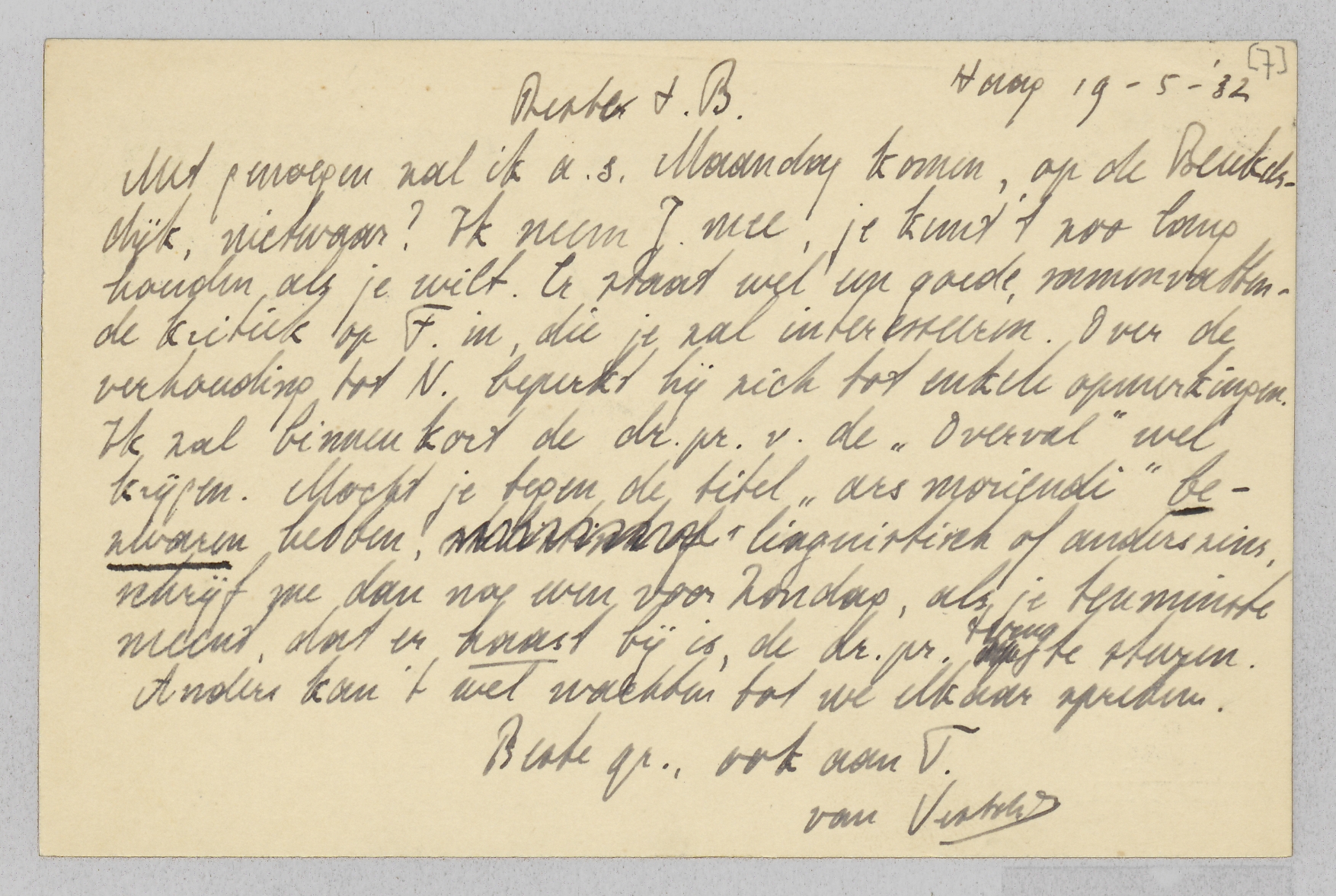 Met genoegen zal ik a.s. Maandag komen, op de Beukelsdijk, nietwaar? Ik neem J. mee, je kunt 't zoo lang houden als je wilt. Er staat wel een goede, samenvattende kritiek op F. in, die je zal interesseeren. Over de verhouding tot N. beperkt hij zich tot enkele opmerkingen. Ik zal binnenkort de dr.pr. v. de ‘Overval’ wel krijgen. Mocht je tegen de titel ‘ars moriendi’ bezwaren hebben, linguistisch of anderszins, schrijf me dan nog even voor Zondag, als je tenminste meent, dat er haast bij is, de dr.pr. terug te sturen. Anders kan 't wel wachten tot we elkaar spreken.