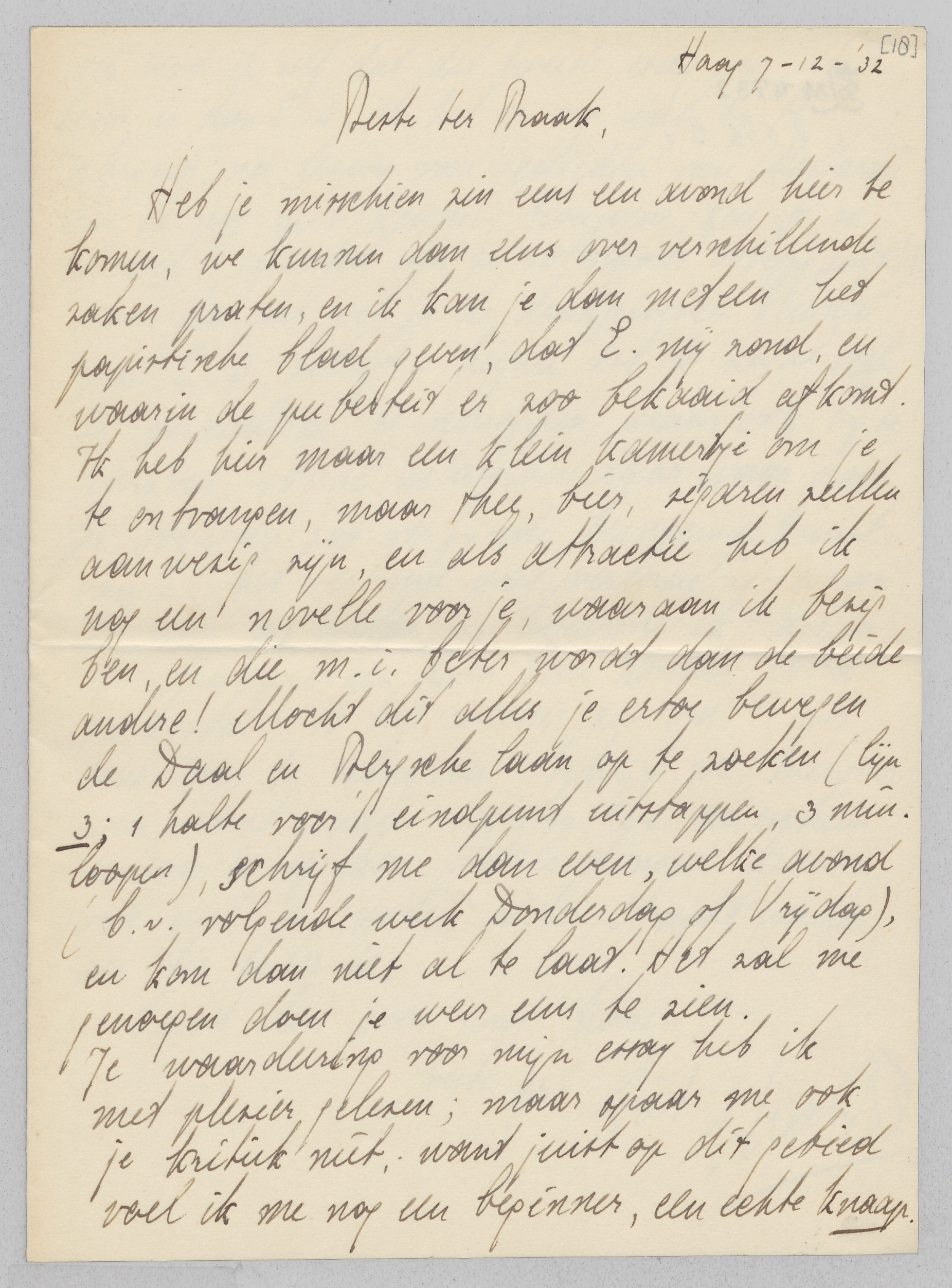 Heb je misschien zin eens een avond hier te komen, we kunnen dan eens over verschillende zaken praten, en ik kan je dan meteen het papistische blad geven, dat E. mij zond, en waarin de puberteit er zoo bekaaid afkomt. Ik heb hier maar een klein kamertje om je te ontvangen, maar thee, bier, sigaren zullen aanwezig zijn, en als attractie heb ik nog een novelle voor je, waaraan ik bezig ben, en die m.i. beter wordt dan de beide andere! Mocht dit alles je ertoe bewegen de Daal en Bergsche laan op te zoeken (lijn 3; 1 halte voor 't eindpunt uitstappen, 3 min. loopen), schrijf me dan even, welke avond (b.v. volgende week Donderdag of Vrijdag), en kom dan niet al te laat. Het zal me genoegen doen je weer eens te zien. Je waardeering voor mijn essay heb ik met plezier gelezen; maar spaar me ook je kritiek niet, want juist op dit gebied voel ik me nog een beginner, een echte knaap.