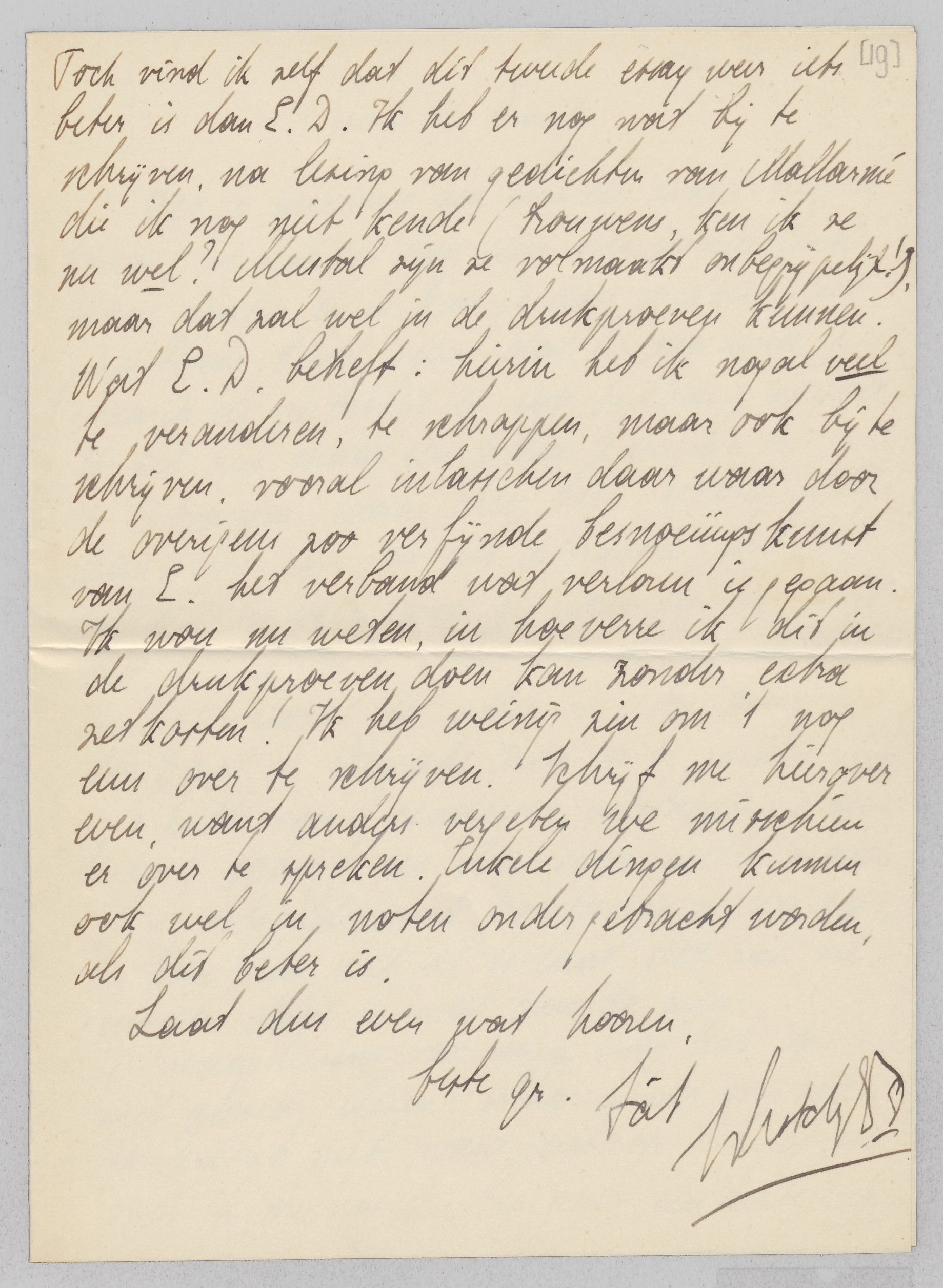 Toch vind ik zelf dat dit tweede essay weer iets beter is dan E.D. Ik heb er nog wat bij te schrijven, na lezing van gedichten van Mallarmé die ik nog niet kende (trouwens, ken ik ze nu wel? Meestal zijn ze volmaakt onbegrijpelijk!), maar dat zal wel in de drukproeven kunnen. Wat E.D. betreft: hierin heb ik nogal veel te veranderen, te schrappen, maar ook bij te schrijven, vooral inlasschen daar waar door de overigens zoo verfijnde besnoeiingskunst van E. het verband wat verloren is gegaan. Ik wou nu weten, in hoeverre ik dit in de drukproeven doen kan zonder extra zetkosten! Ik heb weinig zin om 't nog eens over te schrijven. Schrijf me hierover even, want anders vergeten we misschien er over te spreken. Enkele dingen kunnen ook wel in noten ondergebracht worden, als dit beter is.