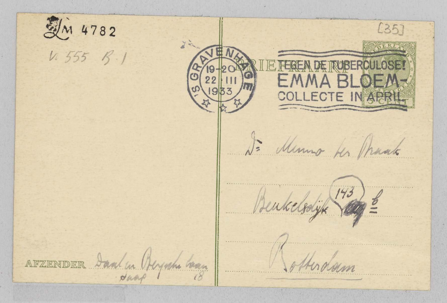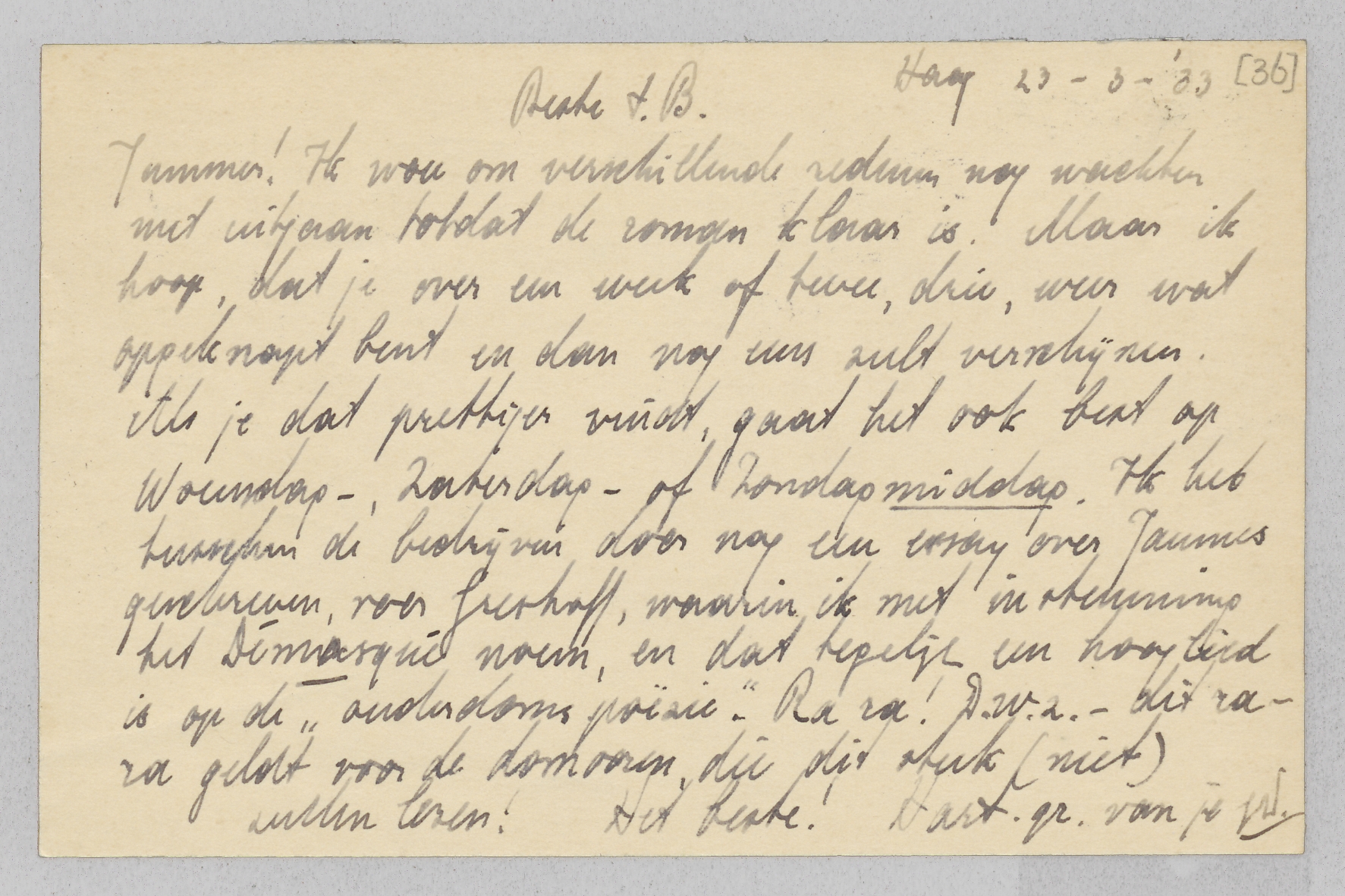 Jammer! Ik wou om verschillende redenen nog wachten met uitgaan totdat de roman klaar is. Maar ik hoop, dat je over een week of twee, drie, weer wat opgeknapt bent en dan nog eens zult verschijnen. Als je dat prettiger vindt, gaat het ook best op Woensdag-, Zaterdag-, of Zondagmiddag. Ik heb tusschen de bedrijven door nog een essay over Jammes geschreven, voor Greshoff, waarin ik met instemming het Démasqué noem, en dat tegelijk een hooglied is op de ‘ouderdoms poëzie’. Ra ra! D.w.z. -dit ra ra geldt voor de domooren, die dit stuk niet willen lezen! Het beste!