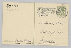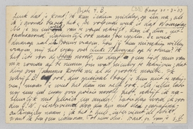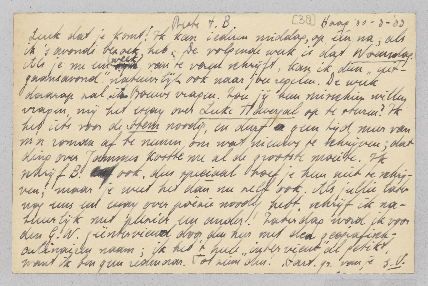 Leuk dat je komt! Ik kan iederen middag, op één na, als ik 's avonds bezoek heb. De volgende week is dat Woensdag Als je nu een week van te voren schrijft, kan ik dien ‘uitgaansavond’ natuurlijk ook naar jou regelen. De week daarop zal ik Bouws vragen. Zou jij hem misschien willen vragen, mij het essay over Luke Havergal op te sturen? Ik heb iets voor de Stem noodig, en durf geen tijd meer van m'n roman af te nemen om wat nieuws te schrijven; dat ding over Jammes kostte me al de grootste moeite. Ik schrijf B. ook, dus speciaal hoef je hem niet te schrijven; maar je weet het dan nu zelf ook. Als jullie later nog eens een essay over poëzie noodig hebt, schrijf ik natuurlijk met plezier een ander! Zaterdag word ik voor den G.W. geïnterviewd door den heer met [geografisch]-culinairen naam; ik heb 't heele ‘interview’ al getikt, want ik ben geen redenaar. Tot ziens dus.