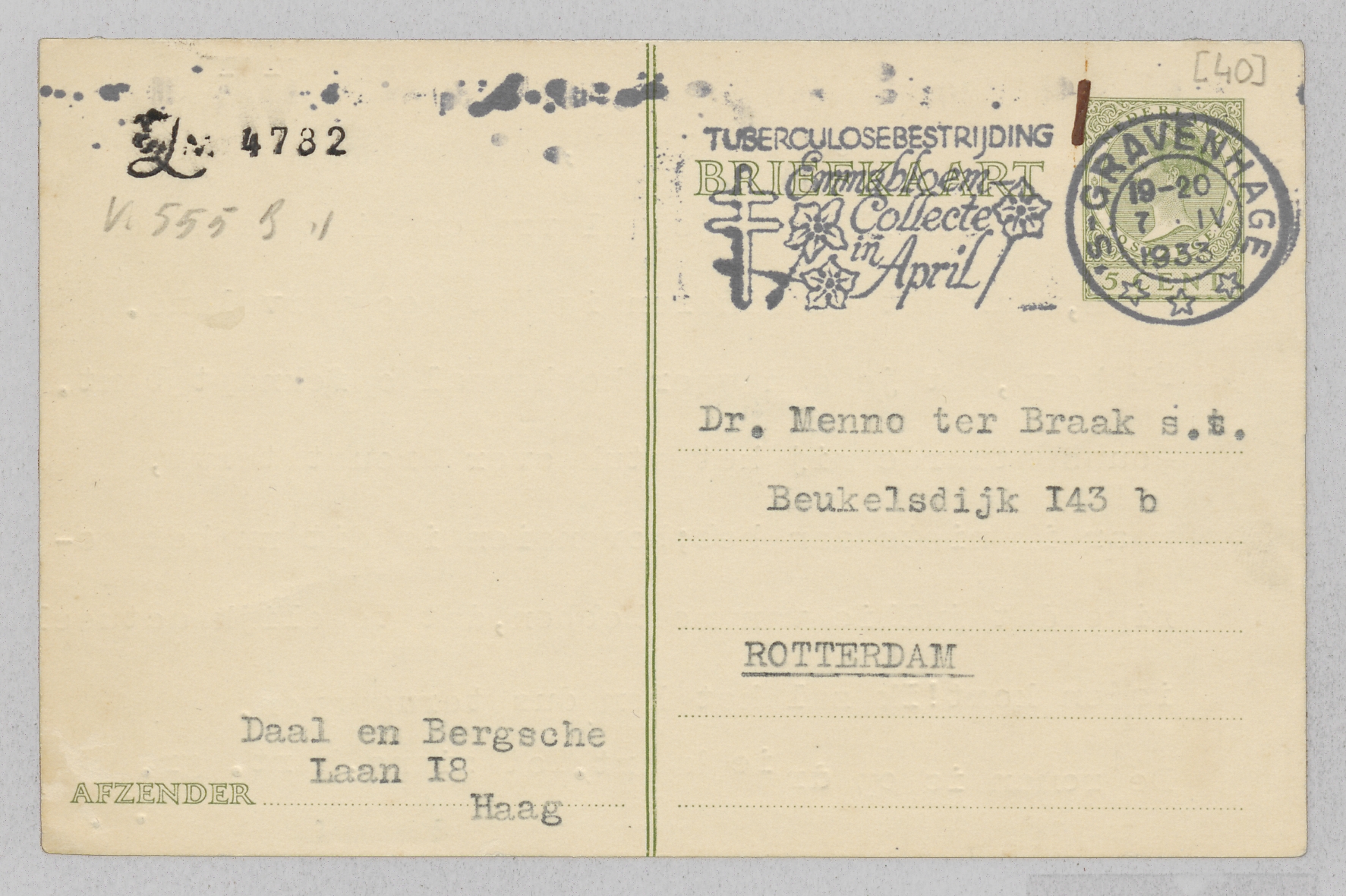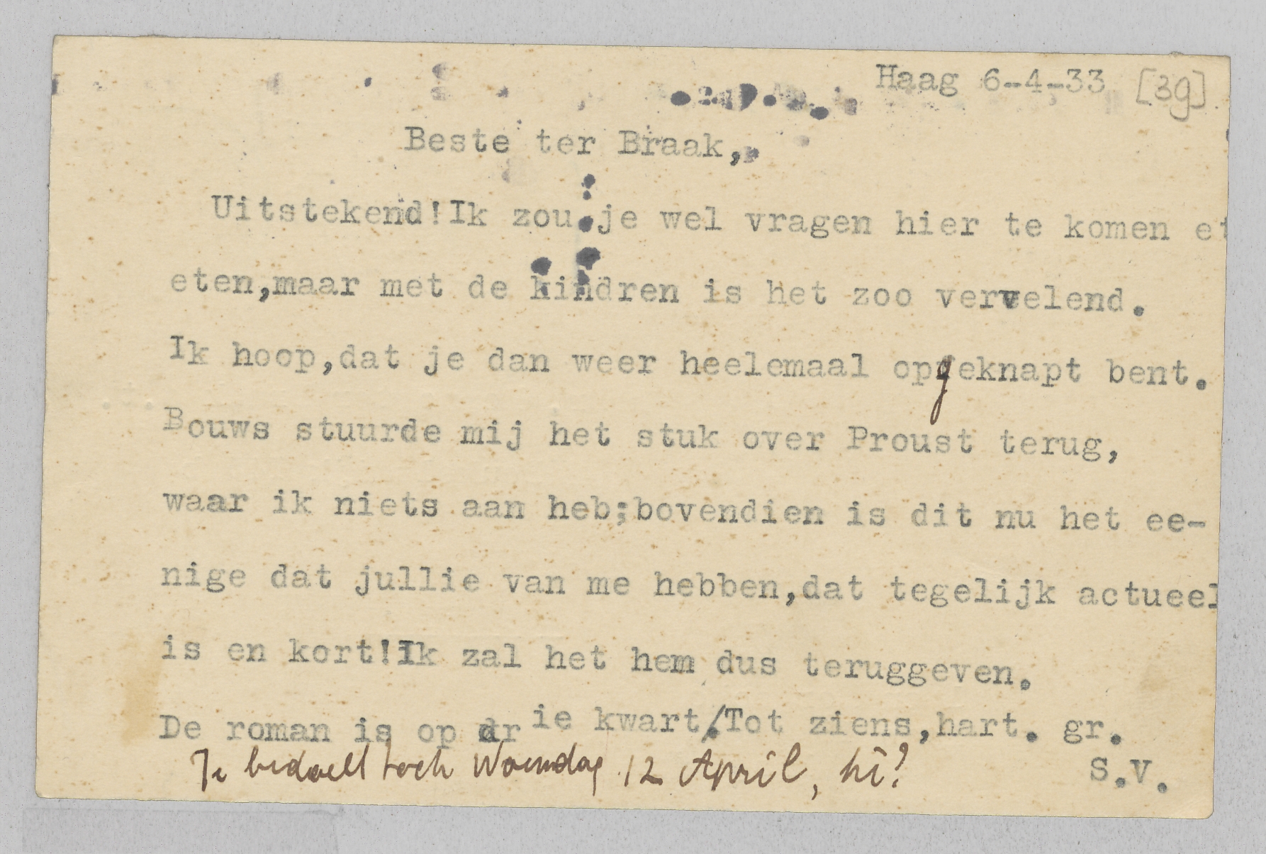 Uitstekend! Ik zou je wel vragen hier te komen [en] eten, maar met de kinderen is het zoo vervelend. Ik hoop, dat je dan weer heelemaal opgeknapt bent. Bouws stuurde mij het stuk over Proust terug, waar ik niets aan heb; bovendien is dit nu het eenige dat jullie van me hebben, dat tegelijk actueel is en kort! Ik zal het hem dus teruggeven. De roman is op drie kwart.