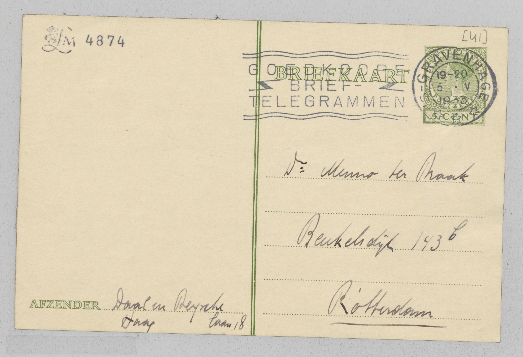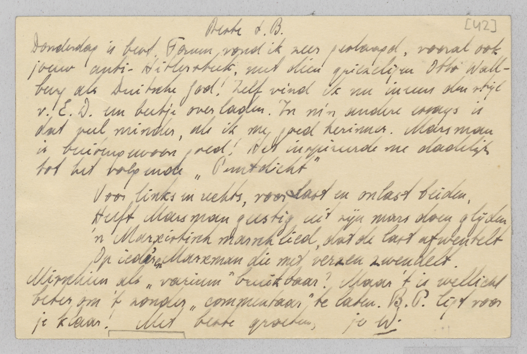 Donderdag is best. Forum vond ik zeer geslaagd, vooral ook jouw anti-Hitlerstuk, met dien griezeligen Otto Wallburg als Duitsche Jood! Zelf vind ik nu ineens den stijl v. E.D. een beetje overladen. In m'n andere essays is dat veel minder, als ik me goed herinner. Marsman is buitengewoon goed! Het inspireerde me dadelijk tot het volgende ‘Puntdicht’: