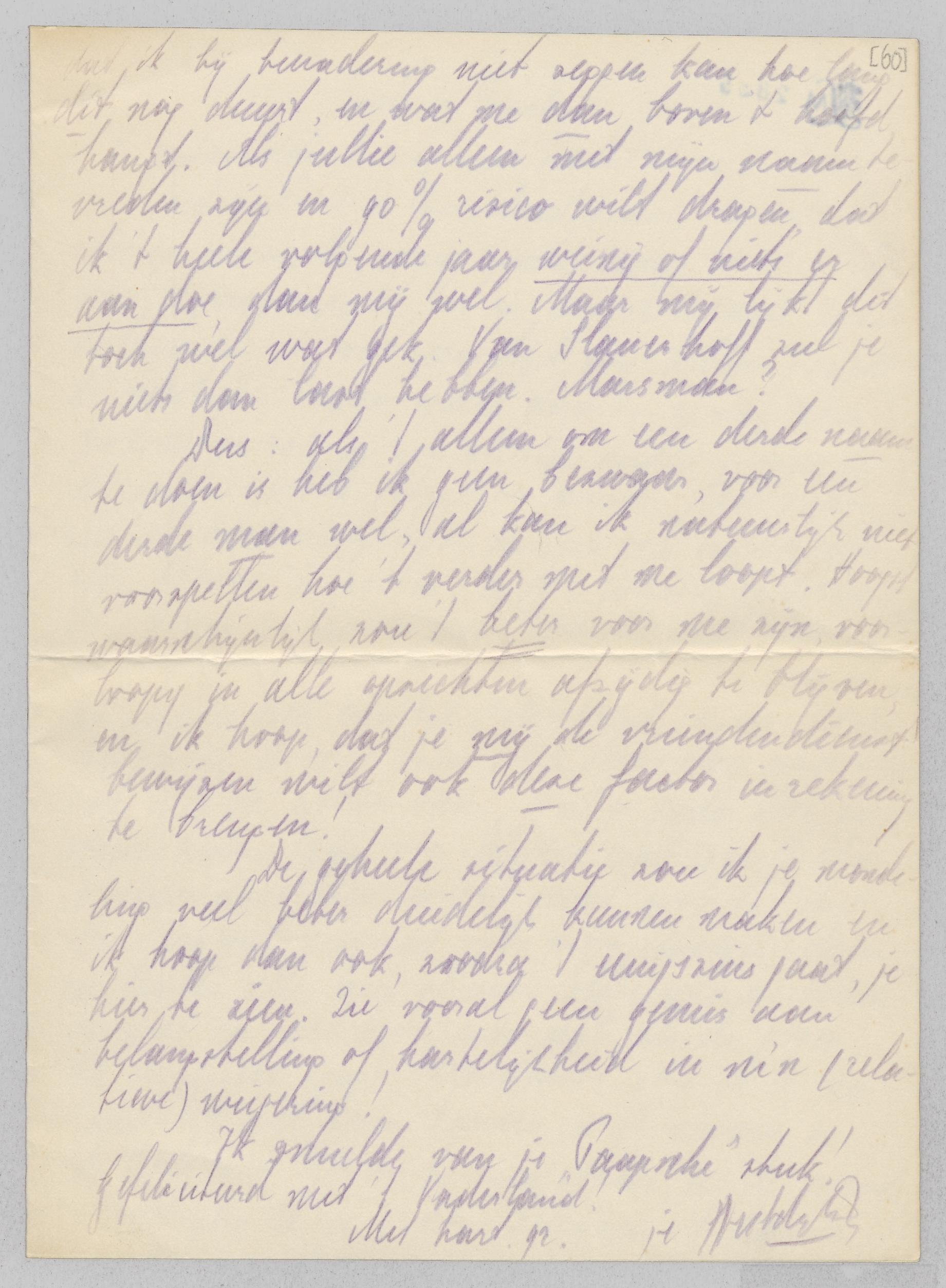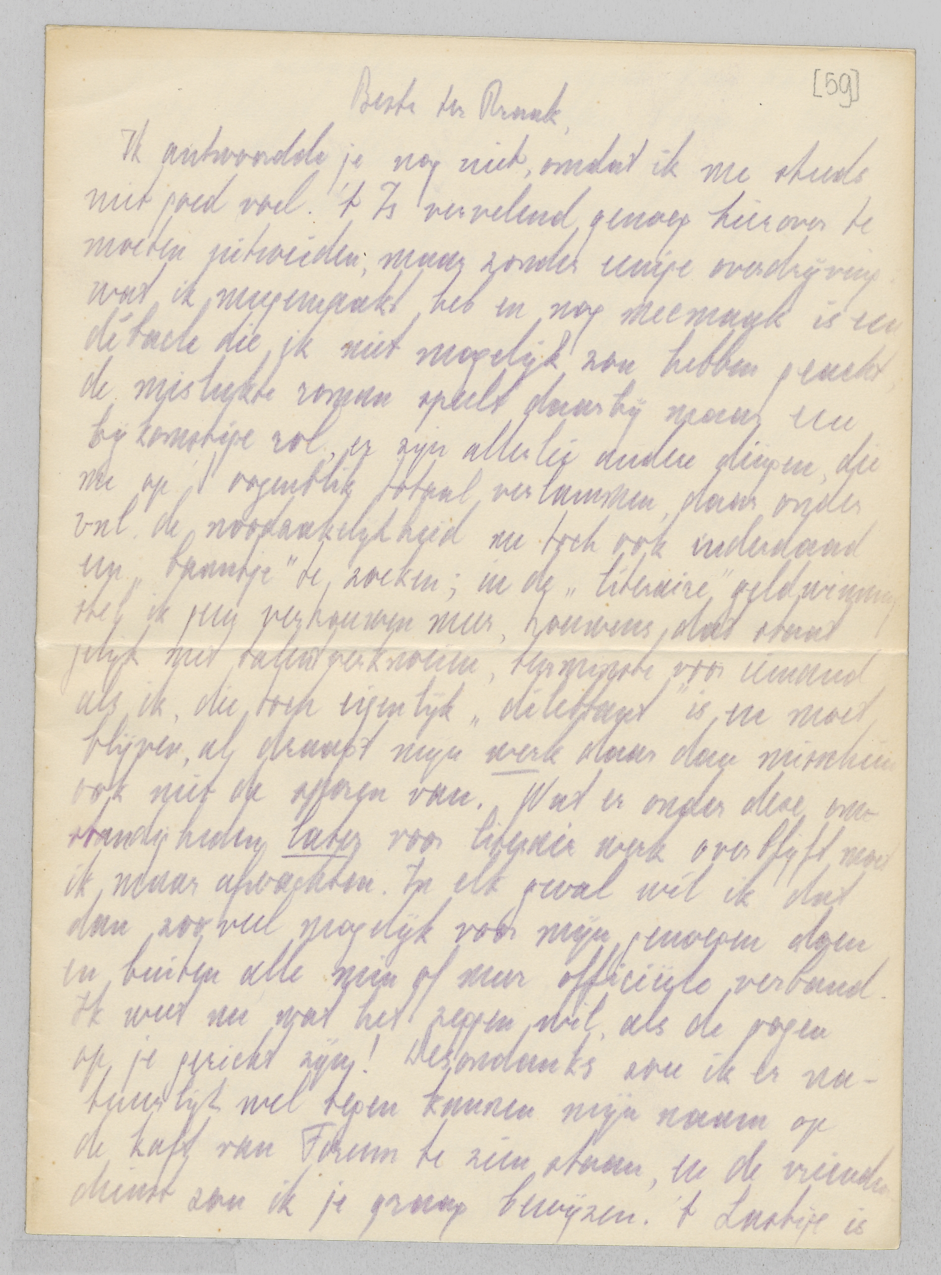 De geheele situatie zou ik je mondeling veel beter duidelijk kunnen maken en ik hoop dan ook, zoodra 't eenigszins gaat, je hier te zien. Zie vooral geen gemis aan belangstelling of hartelijkheid in m'n (relatieve) weigering!