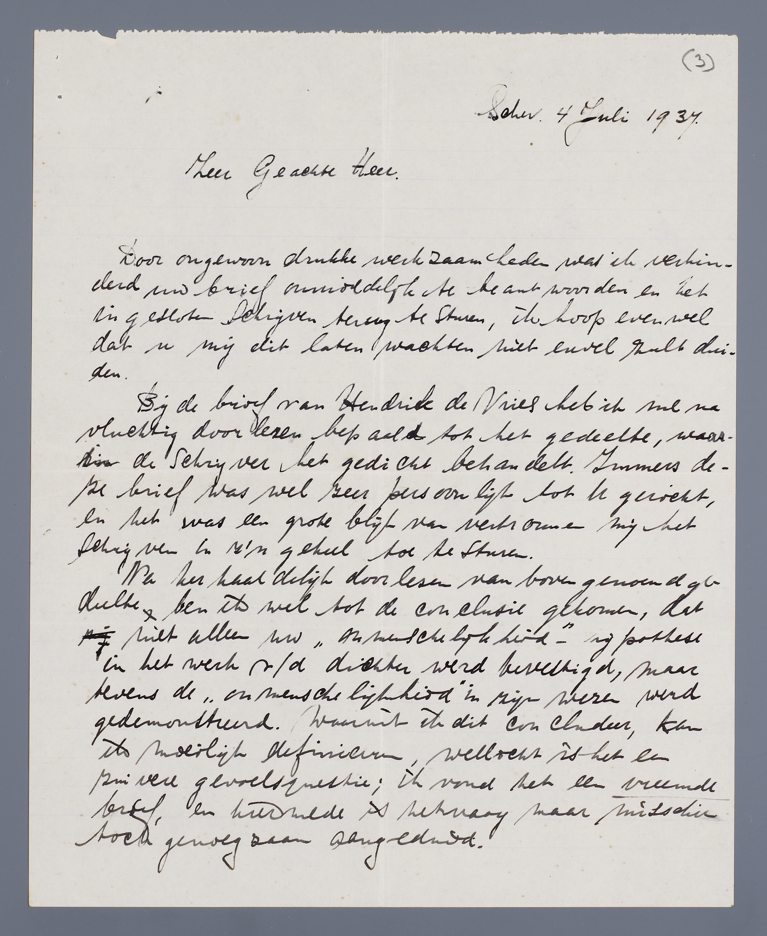 Na herhaaldelijk doorlezen van bovengenoemd gedeelte, ben ik wel tot de conclusie gekomen, dat niet alleen uw ‘onmenschelijkheid’-hypothese in het werk v/d dichter werd bevestigd, maar tevens de ‘onmenschelijkheid’ in zijn wezen werd gedemonstreerd. Waaruit ik dit concludeer, kan ik moeilijk definieeren, wellicht is het een zuivere gevoelskwestie; ik vond het een vreemde brief, en hiermede is het vaag maar misschien toch genoegzaam aangeduid.