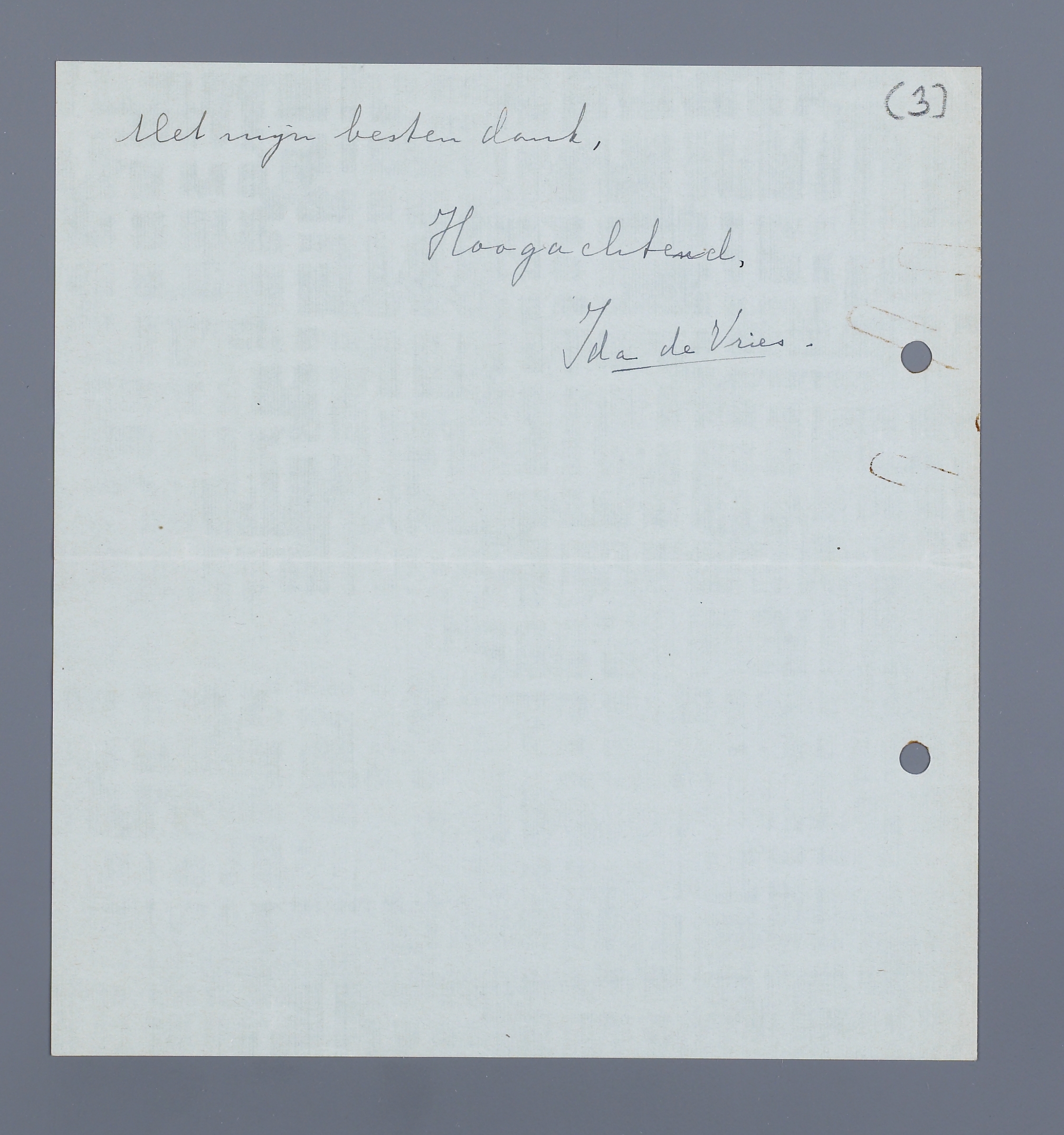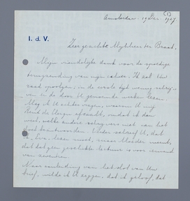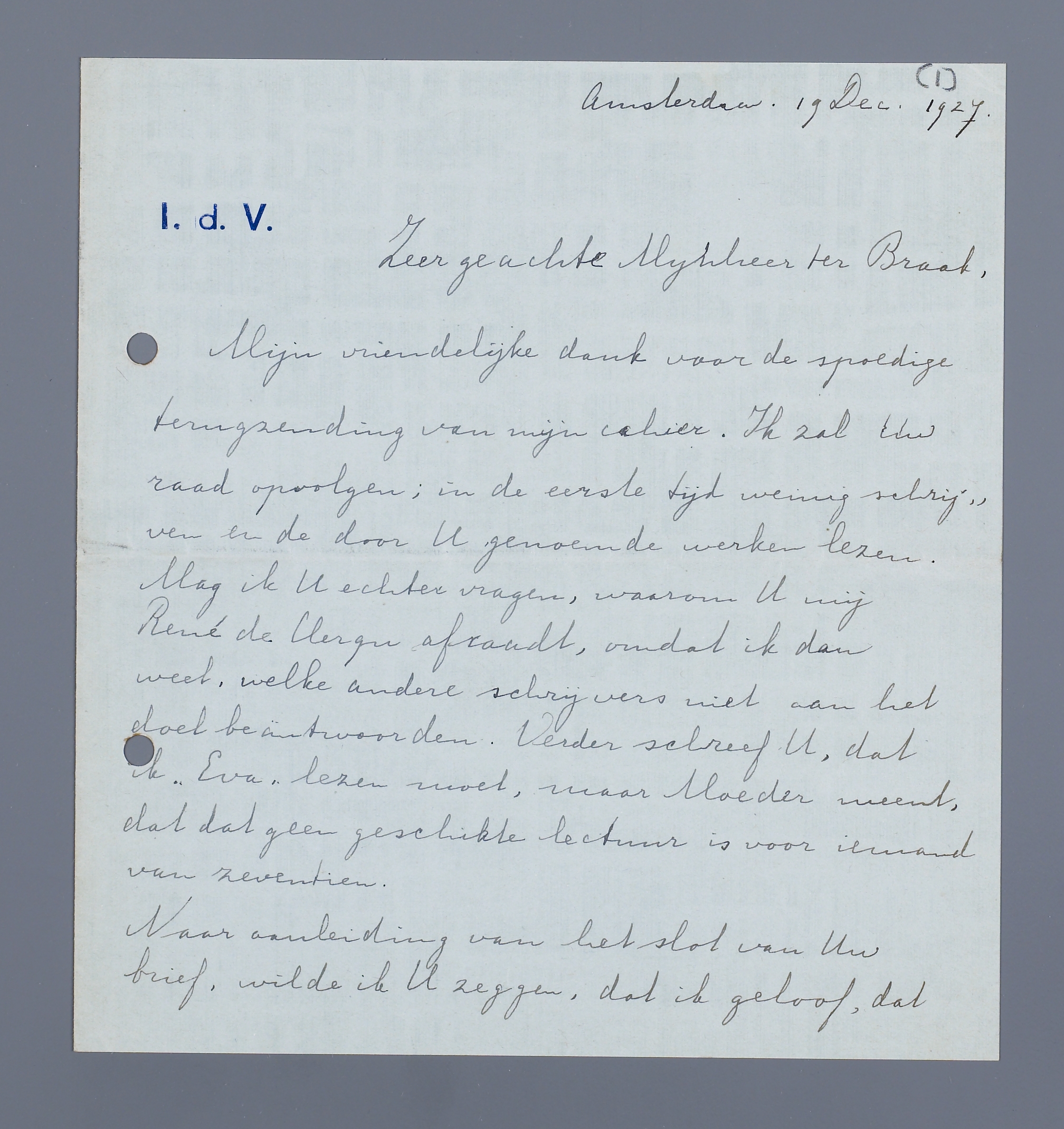 Mijn vriendelijke dank voor de spoedige terugzending van mijn cahier. Ik zal Uw raad opvolgen; in de eerste tijd weinig schrijven en de door U genoemde werken lezen. Mag ik U echter vragen, waarom U mij René de Clercq afraadt, omdat ik dan weet, welke andere schrijvers niet aan het doel beantwoorden. Verder schreef U, dat ik ‘Eva’ lezen moet, maar Moeder meent, dat dat geen geschikte lectuur is voor iemand van zeventien.