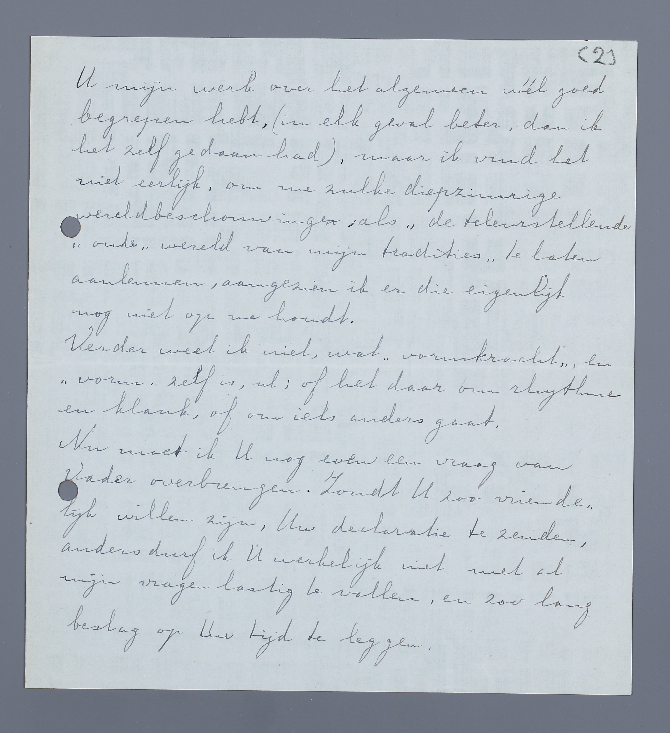 Naar aanleiding van het slot van Uw brief, wilde ik U zeggen, dat ik geloof, dat U mijn werk over het algemeen wél goed begrepen hebt (in elk geval beter, dan ik het zelf gedaan had), maar ik vind het niet eerlijk, om me zulke diepzinnige wereldbeschouwingen als ‘de teleurstellende “oude” wereld van mijn tradities’ te laten aanleunen, aangezien ik er die eigenlijk nog niet op na houdt.