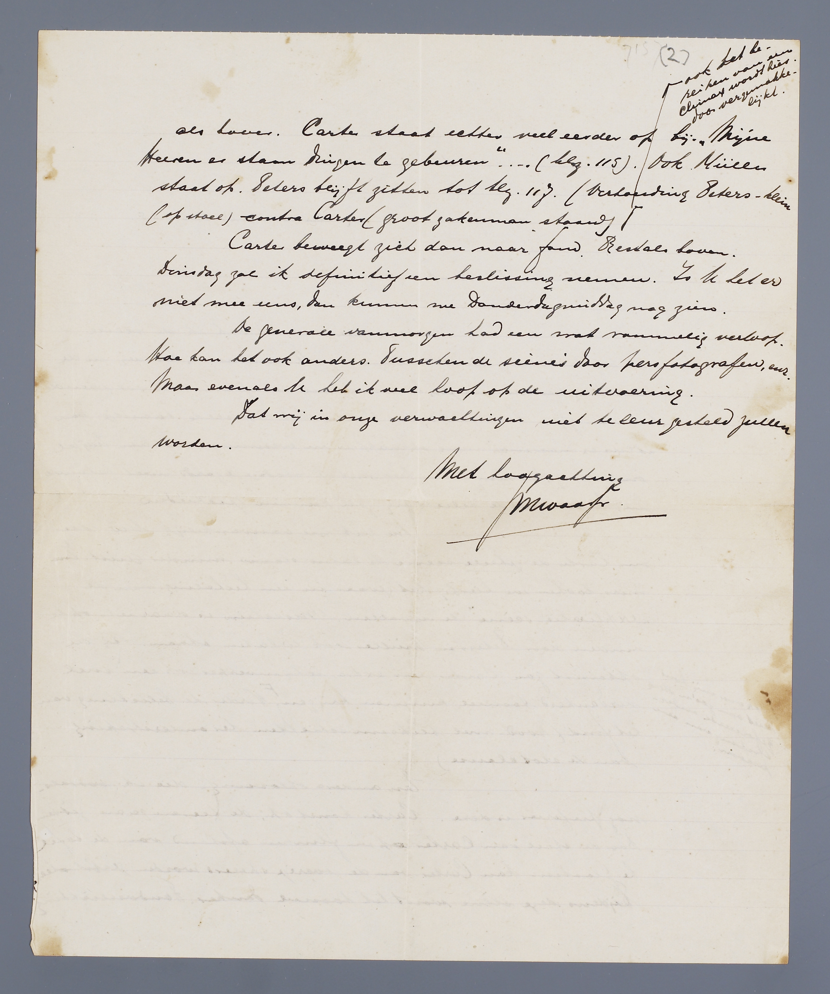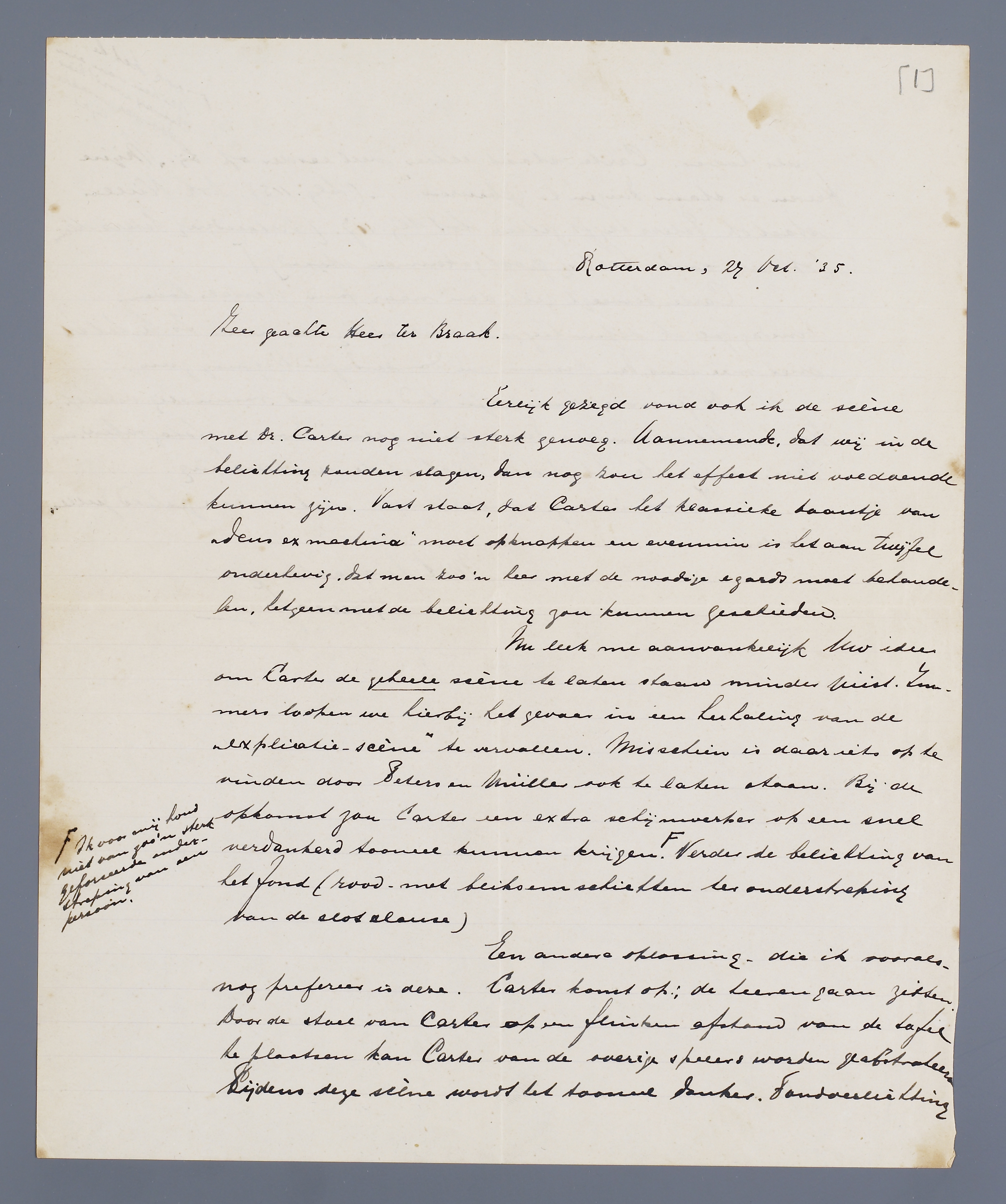Nu leek me aanvankelijk Uw idee om Carter de geheele scène te laten staan minder juist. Immers loopen we hierbij het gevaar in een herhaling van de ‘explicatie-scène’ te vervallen. Misschien is daar iets op te vinden door Peters en Müller ook te laten staan. Bij de opkomst zou Carter een extra schijnwerper op een snel verdonkerd tooneel kunnen krijgen. Ik voor mij houd niet van zoo'n sterk geforceerde onderstreping van een persoon. Verder de belichting van het fond ( rood met bliksemschichten ter onderstreping van de slotclause).