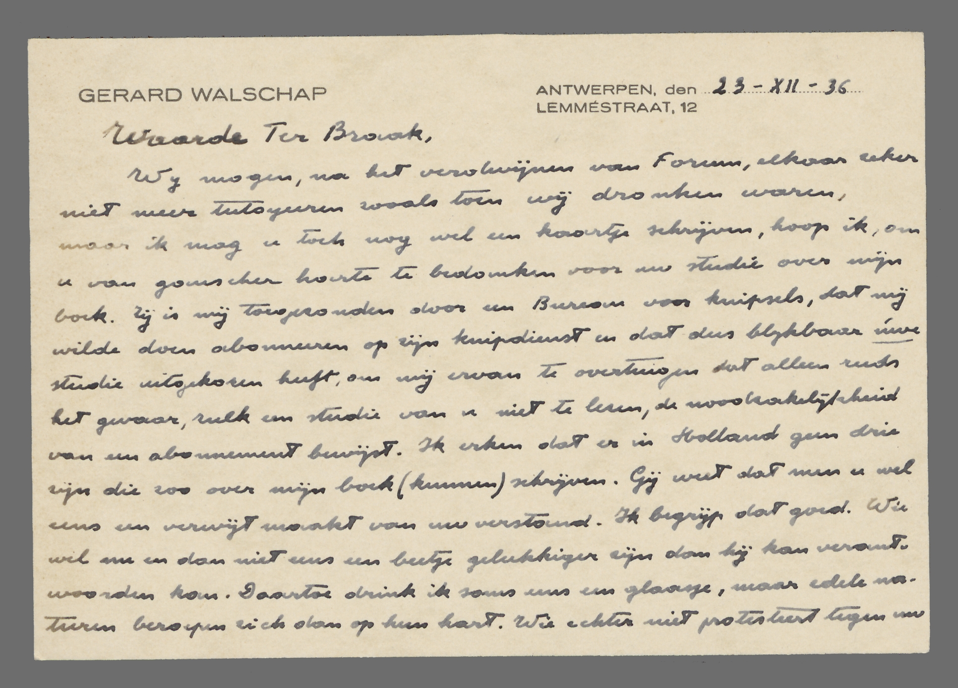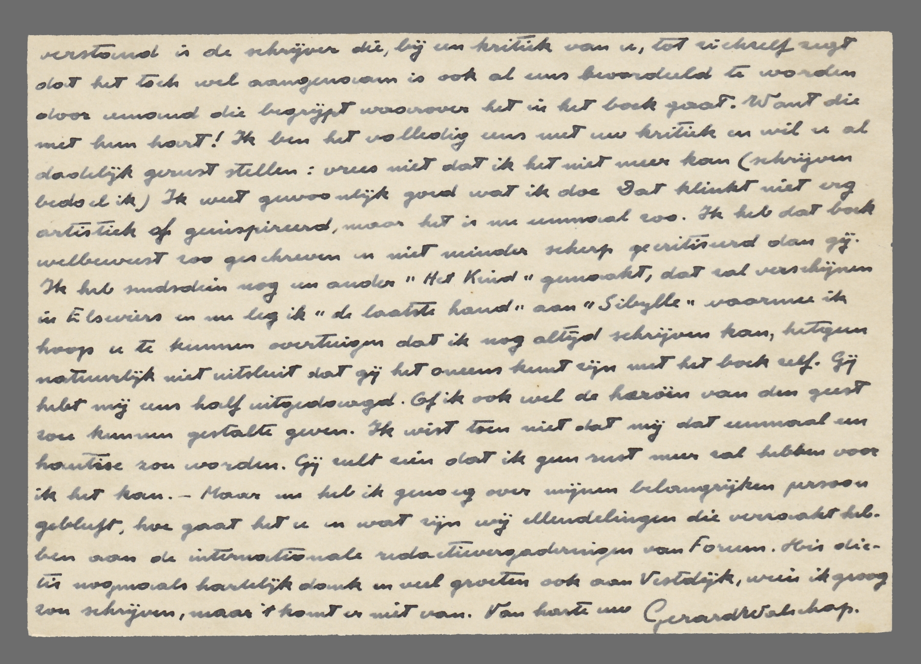 Wij mogen, na het verdwijnen van Forum, elkaar zeker niet meer tutoyeeren zooals toen wij dronken waren, maar ik mag u toch nog wel een kaartje schrijven, hoop ik, om u van ganscher harte te bedanken voor uw studie over mijn boek. Zij is mij toegezonden door een Bureau voor knipsels, dat mij wilde doen abonneeren op zijn knipdienst en dat dus blijkbaar úwe studie uitgekozen heeft, om mij ervan te overtuigen dat alleen reeds het gevaar, zulk een studie van u niet te lezen, de noodzakelijkheid van een abonnement bewijst. Ik erken dat er in Holland geen drie zijn die zoo over mijn boek (kunnen) schrijven. Gij weet dat men u wel eens een verwijt maakt van uw verstand. Ik begrijp dat goed. Wie wil nu en dan niet eens een beetje gelukkiger zijn dan hij kan verantwoorden kan. Daartoe drink ik soms eens een glaasje, maar edele naturen beroepen zich dan op hun hart. Wie echter niet protesteert tegen uw verstand is de schrijver die, bij een kritiek van u, tot zichzelf zegt dat het toch wel aangenaam is ook al eens beoordeeld te worden door iemand die begrijpt waarover het in het boek gaat. Want die met hun hoort! Ik ben het volledig eens met uw kritiek en wil u al dadelijk geruststellen: vrees niet dat ik het niet meer kan (schrijven bedoel ik) Ik weet gewoonlijk goed wat ik doe. Dat klinkt niet erg artistiek of geïnspireerd, maar het is nu eemaal zoo. Ik heb dat boek welbewust zoo geschreven en niet minder scherp gecritiseerd dan gij. Ik heb sindsdien nog een ander ‘Het Kind’ gemaakt, dat zal verschijnen in Elseviers en nu leg ik ‘de laatste hand’ aan ‘Sibylle’ waarmee ik hoop u te kunnen overtuigen dat ik nog altíjd schrijven kan, hetgeen natuurlijk niet uitsluit dat gij het oneens kunt zijn met het boek zelf. Gij hebt mij eens half uitgedaagd. Of ik ook wel de heroën van den geest zou kunnen gestalte geven. Ik wist toen niet dat mij dat eenmaal een hantise zou worden. Gij zult zien dat ik geen rust meer zal hebben voor ik het kan. – Maar nu heb ik genoeg over mijnen belangrijken persoon gebluft, hoe gaat het u en wat zijn wij ellendelingen die verzaakt hebben aan de internationale redactievergaderingen van Forum. His dictis nogmaals hartelijk dank en veel groeten ook aan Vestdijk, wien ik graag zou schrijven, maar ’t komt er niet van.