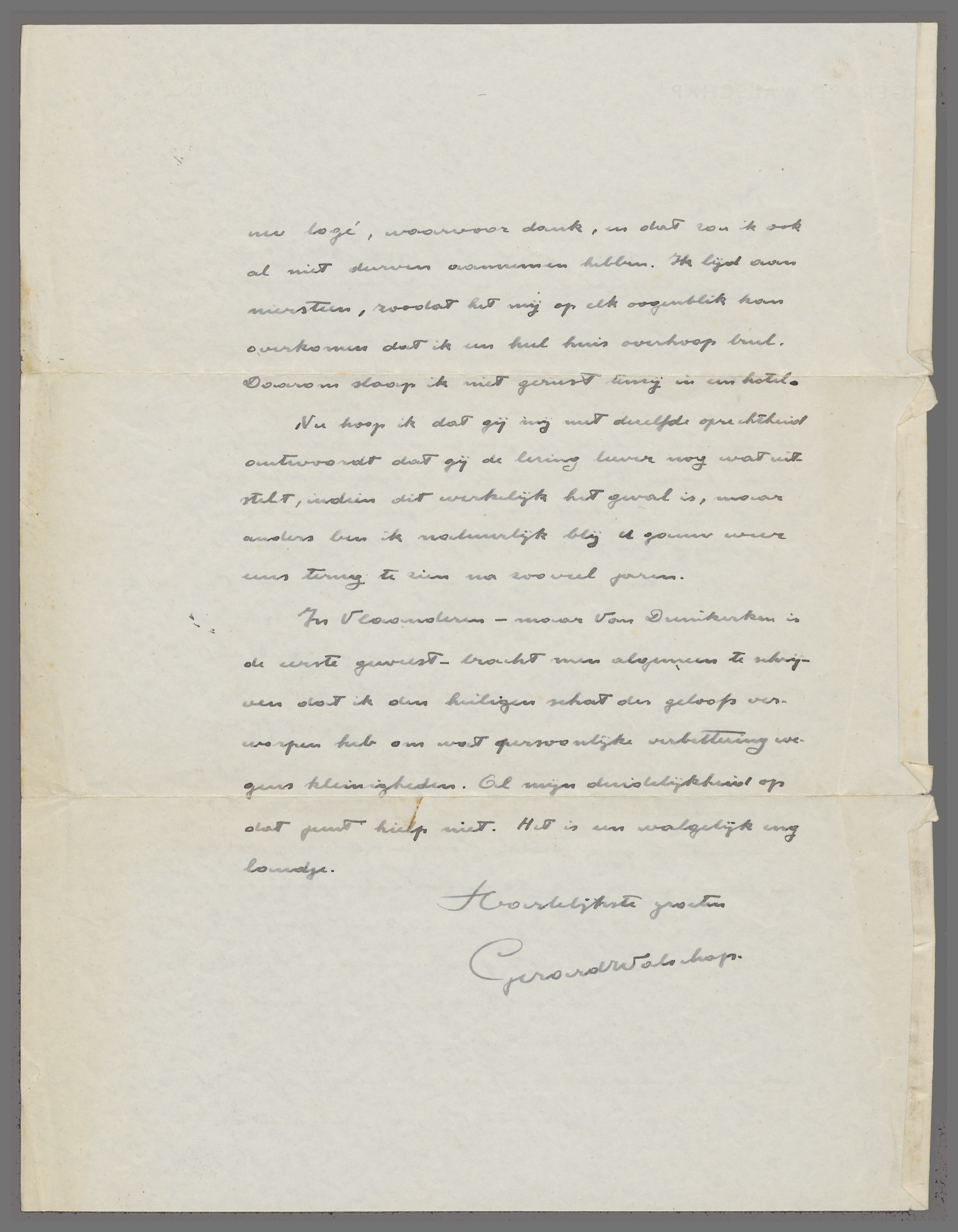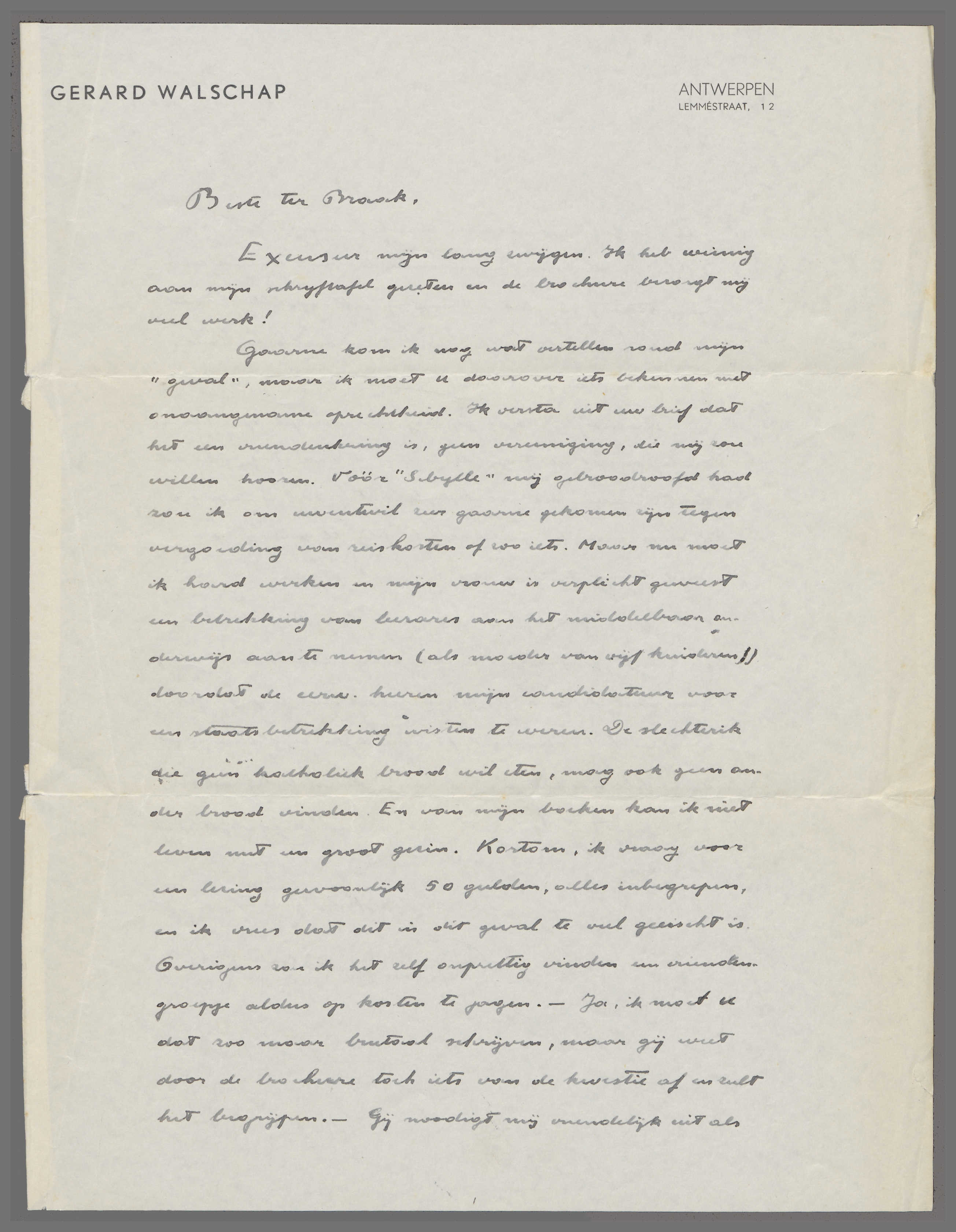 Gaarne kom ik nog wat vertellen rond mijn ‘geval’, maar ik moet u daarover iets bekennen met onaangename oprechtheid. Ik versta uit uw brief dat het een vriendenkring is, geen vereeniging, die mij zou willen hooren. Vóór ‘Sibylle’ mij gebroodroofd had zou ik om uwentwil zeer gaarne gekomen zijn tegen vergoeding van reiskosten of zoo iets. Maar nu moet ik hard werken en mijn vrouw is verplicht geweest een betrekking van lerares aan het middelbaar onderwijs aan te nemen (als moeder van vijf kinderen!) doordat de eerw. heeren mijn candidatuur voor een staatsbetrekking wisten te weren. De slechterik die geen katholiek brood wil eten, mag ook geen ander brood vinden. En van mijn boeken kan ik niet leven met een groot gezin. Kortom, ik vraag voor een lezing gewoonlijk 50 gulden, alles inbegrepen, en ik vrees dat dit in dit geval te veel geeischt is. Overigens zou ik het zelf onprettig vinden een vriendengroepje aldus op kosten te jagen. – Ja, ik moet U dat zoo maar brutaal schrijven, maar gij weet door de brochure toch iets van de kwestie af en zult het begrijpen.- Gij noodigt mij vriendelijk uit als uw logé, waarvoor dank, en dat zou ik ook al niet durven aannemen hebben. Ik lijd aan niersteen, zoodat het mij op elk moment kan overkomen dat ik een heel huis overhoop brul. Daarom slaap ik niet gerust tenzij in een hotel.
