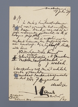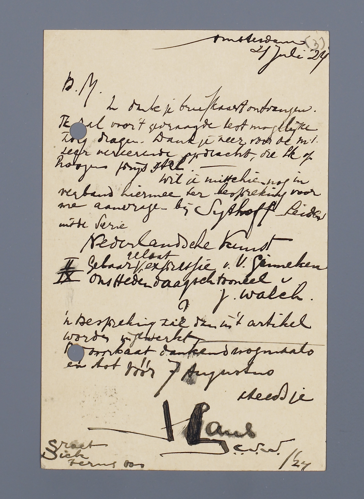 In dank je briefkaart ontvangen. Ik zal voor 't gevraagde best mogelijke zorg dragen. Dank je zeer voor de m.i. zeer vereerende opdracht, die ik op hoogen prijs stel. -