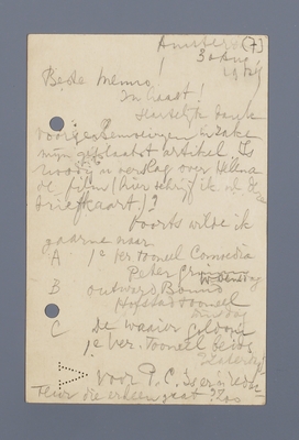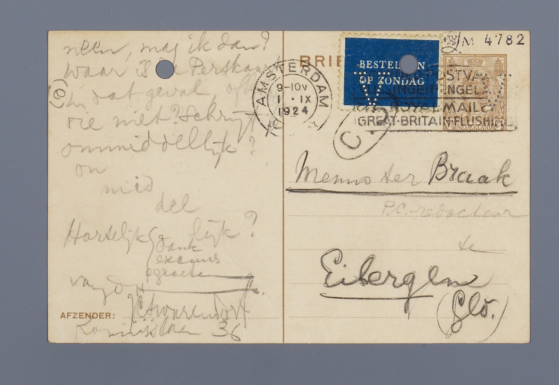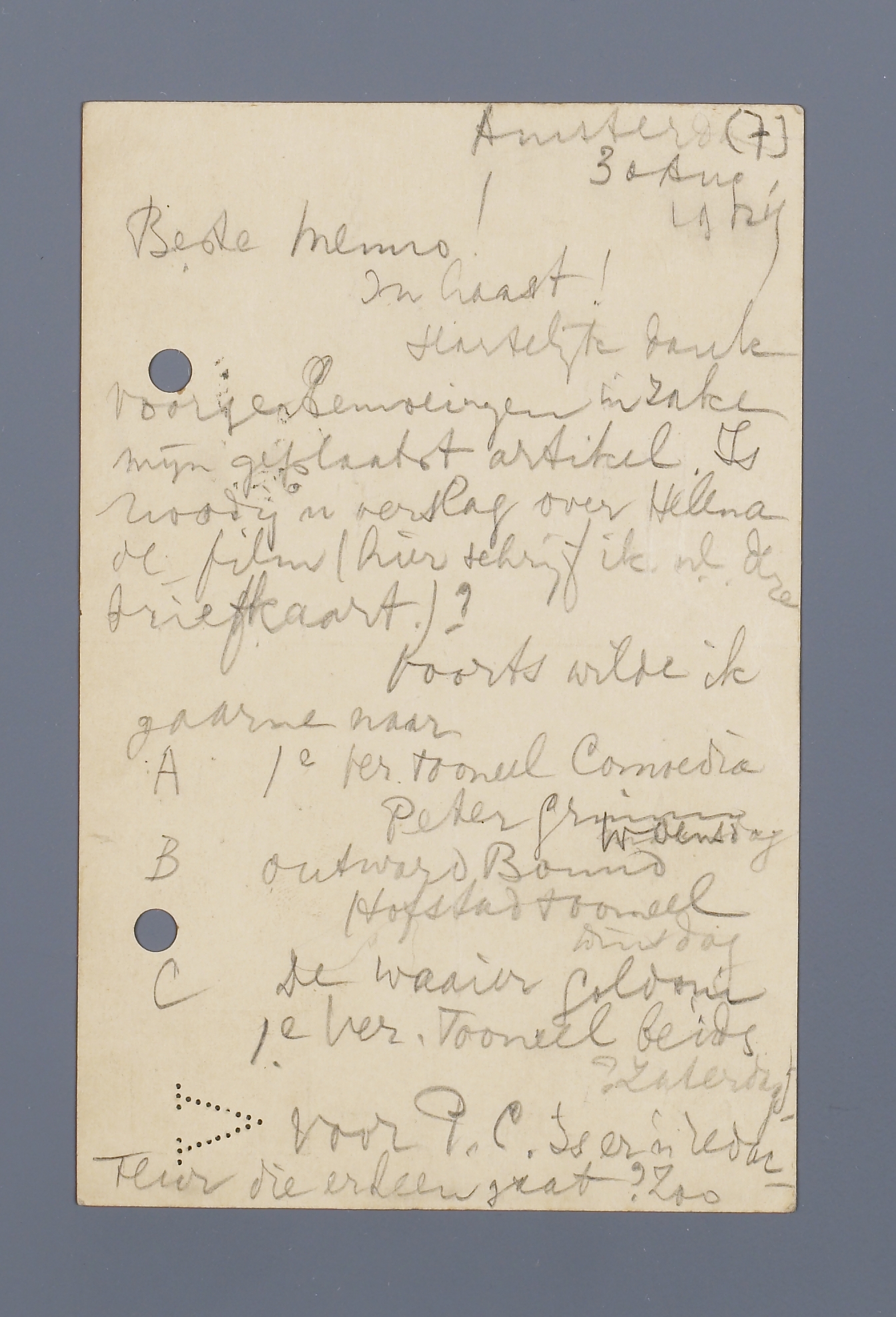 Voor P.C. Is er 'n redacteur die erheen gaat? Zoo neen, mag ik dan? Waar is de Perskaart in dat geval, of hoeft die niet? Schrijf je onmiddellijk?