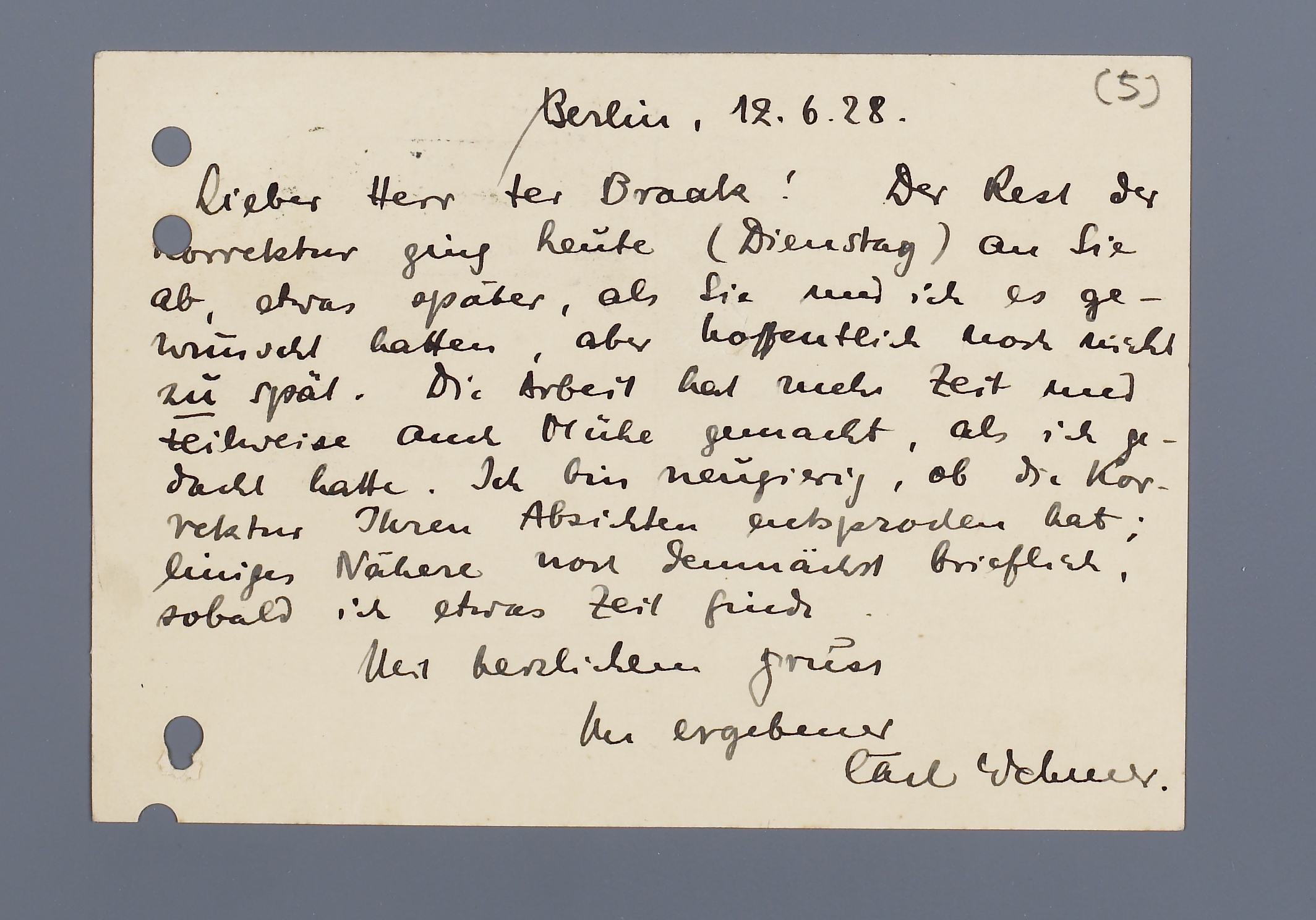 Der Rest der Korrektur ging heute (Dienstag) an Sie ab, etwas später, als Sie und ich es gewünscht hatten, aber hoffentlich noch nicht zu spät. Die Arbeit hat mehr Zeit und teilweise auch Mühe gemacht, als ich gedacht hatte. Ich bin neugierig, ob die Korrektur Ihren Absichten entsprochen hat; einiges Nähere noch demnächst brieflich, sobald ich etwas Zeit finde.