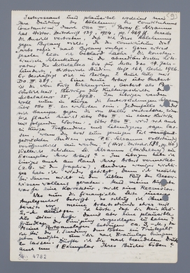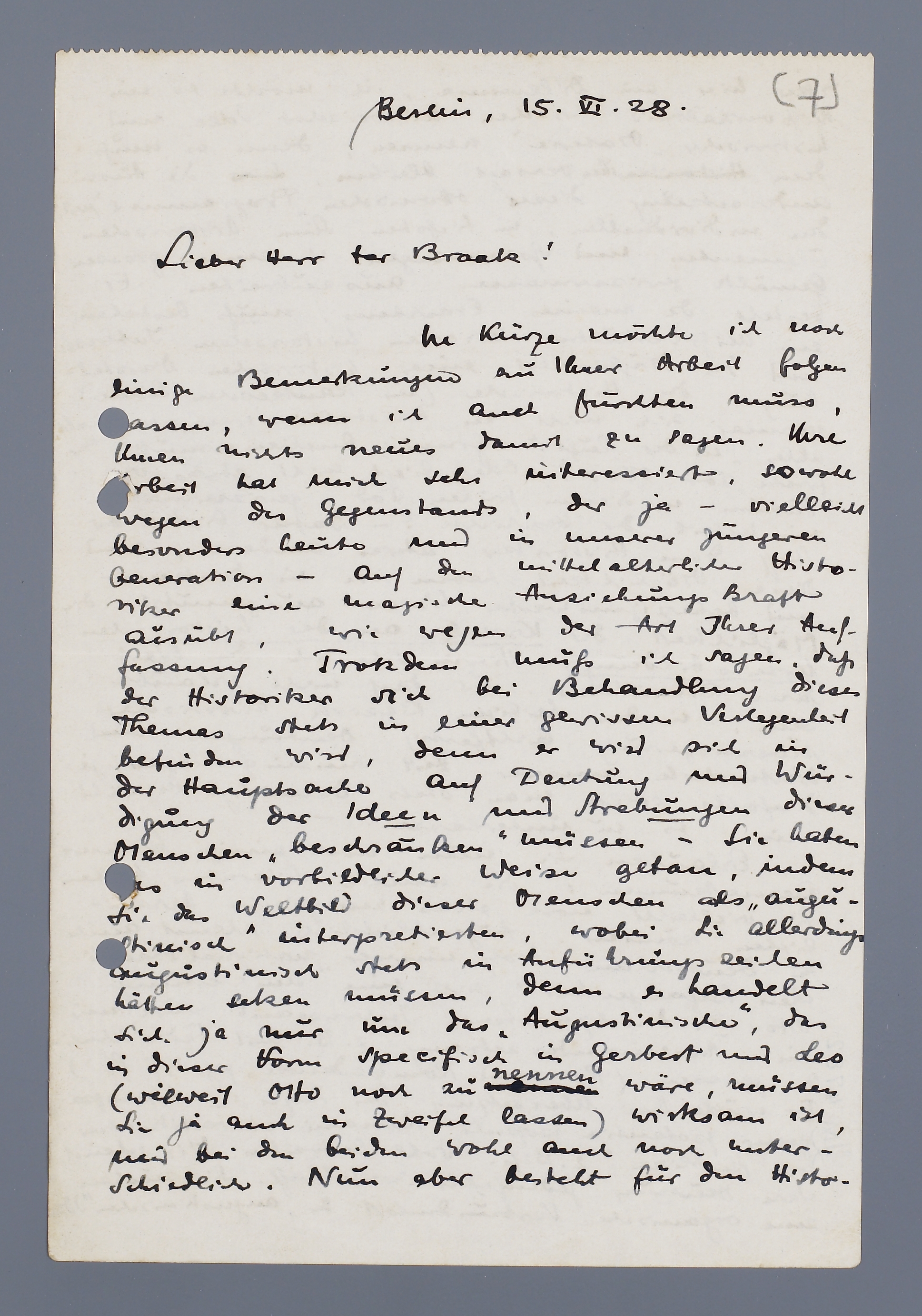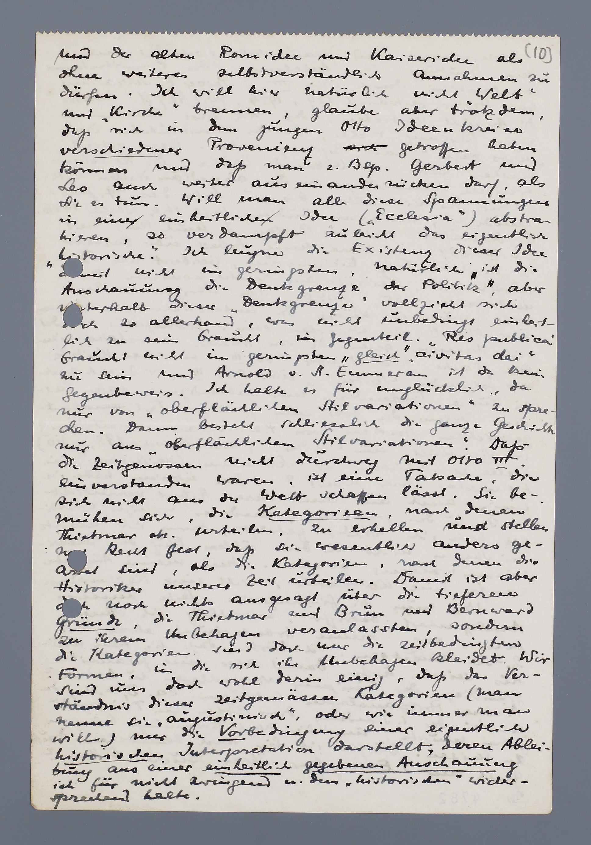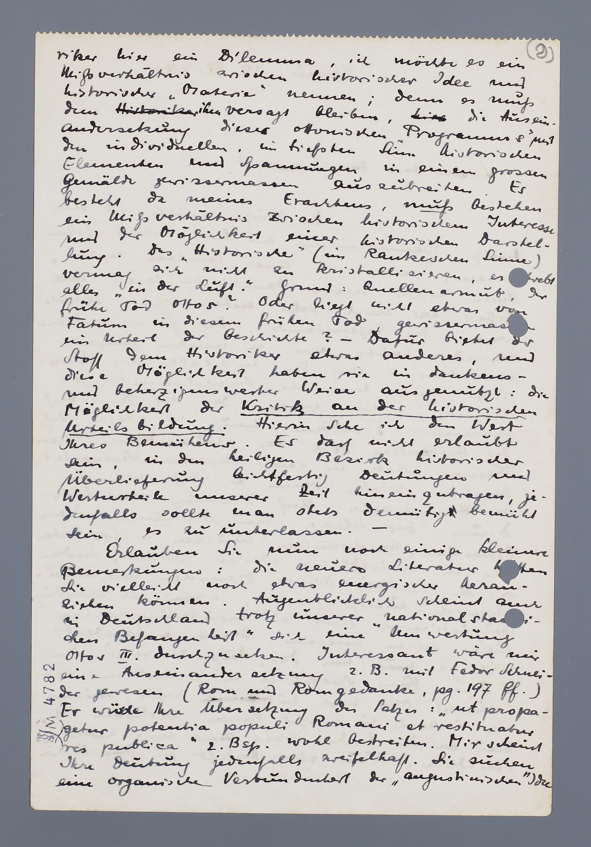 Im Kürze möchte ich noch einige Bemerkungen zu Ihrer Arbeit folgen lassen, wenn ich auch fürchten muss, Ihnen nichts neues damit zu sagen. Ihre Arbeit hat mich sehr interessiert, sowohl wegen des Gegenstands, der ja - vielleicht besonderes heute und in unseres jüngeren Generation - auf den mittelalterlich Historiker eine magische [onleesbaar]kraft ausubt, wie wegen der Art Ihrer Auffassung. Trotzdem muss ich sagen, dass der Historiker sich bei Behandlung dieses Themas stets in einer gewissen Verlegenheit befinden wird, denn er wird sich in der Hauptsache auf Deutung und Würdigung der Ideen und Strebungen dieses Menschen, ‘beschränken’ müssen - Sie haben das in vorbildlicher Weise getan, indem Sie das Weltliche dieser Menschen als ‘augustinisch’ interpretierten, wobei Sie allerdings augustinisch stets in Anführungsteilen hatten sehen müssen, denn es handelt sich ja nur um das ‘Augustianische’, das in dieser Form specifisch in Gerbert und des (wieweit Otto noch zu nennen wäre, zwischen die ja auch in Zweifel lassen) wirksam ist, und bei den Beiden wohl auch [onleesbaar] unterscheidlich. Nun aber besteht für den Historiker hier ein Dilemma, ich möchte es ein Hilfsverhältnis zwischen historischer Idee und historischer ‘Oraterie’ nennen; denn es muss [onleesbaar] ihnen versagt bleiben, die Auseinandersetzung dieses ottonischen Programms und Elementen und Spanningen, in einem grossen Gemälde gewissermassen auszubreiten. Es besteht da meines [onleesbaar] , [onleesbaar] bestehen ein [onleesbaar] verhältnis zwischen historischem Interesse und der Möglichheit einer historischen Darstellung. Das ‘Historische’ (im Rankeschen Sinne) vermag sich nicht zu kristallisieren, es hebt alles ‘in der Luft’. Grund: Quellen armut, der frühe Tod Ottos. Oder liegt nicht etwas von Fatum in diesem frühen Tod, gewissermassen - ein Urteil der Geschichte? - Dafür licht der Stoff dem Historiker etwas anderes, und diese Möglichheit haben Sie in [onleesbaar] - und beherzigenswertes Weise ausgenützt: die Möglichkeit der Kritik an der historischen Urteilsbildung. Hierin suche ich den Wert Ihres Bemühens. Es darf nicht erlaubt sein, in den heiligen Bezirk historischer Überlieferung leichtfestig Deutungen und Werturteile unserer Zeit hineinzutragen, jedenfalls sollte man [stets] demütig bemüht sein, es zu unterfassen. -