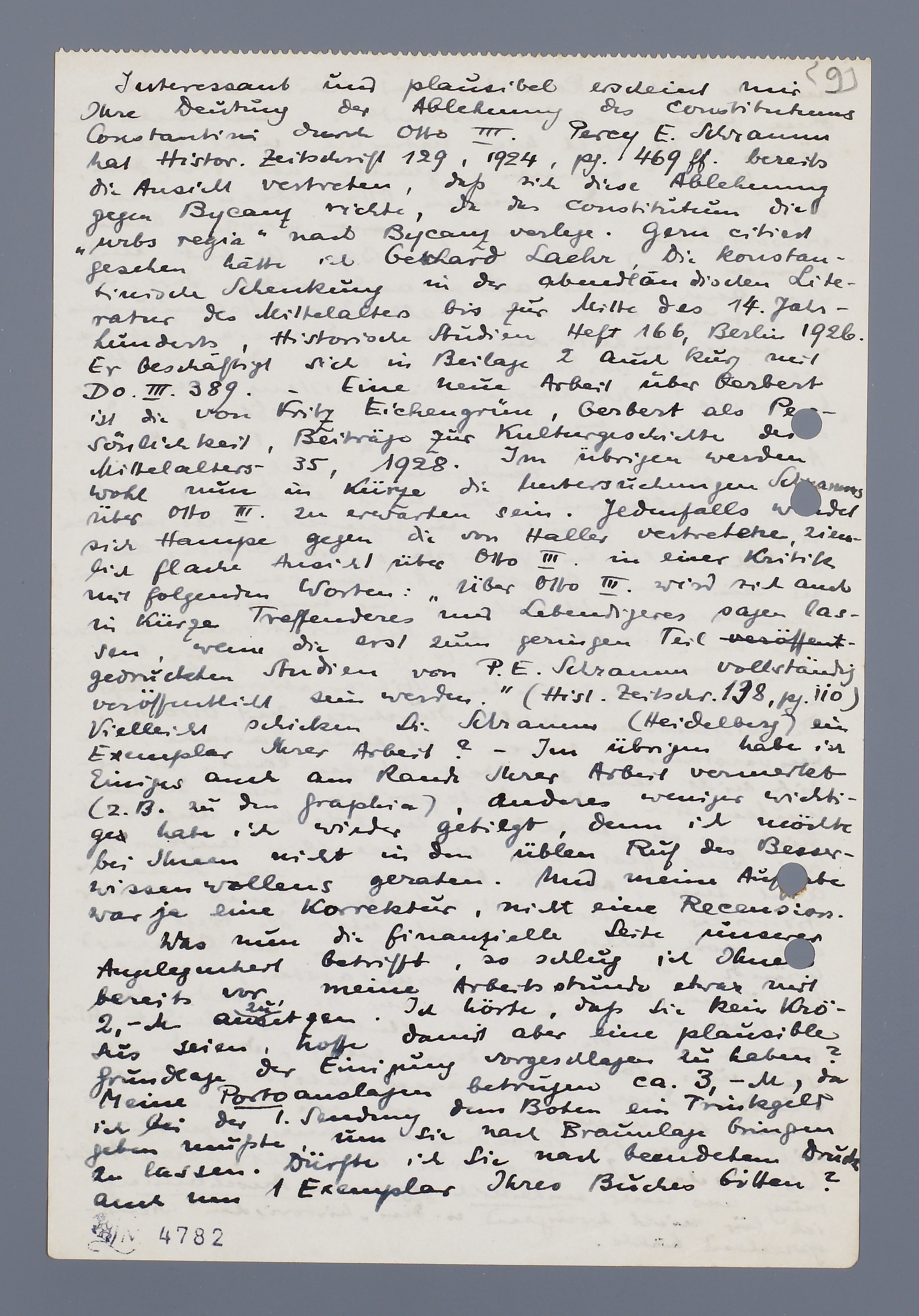 Interessant und plausibel erscheint mir Ihre Deutung der Ablehnung des Constitutum Constantini durch Otto III. Percy E. Schramm hat Histor. Zeitschrift 129, 1924, pg. 469 ff. bereits die Ansicht vertreten, dass sich diese Ablehnung gegen Bycanz richte, das Constitutum die ‘urbs regia’ nach Bycanz verlege. Gern citiert gesehen hätte ich Gerhard Laehr, Die konstantinische Schenkung in der abendländischen Literatur des Mittelalters bis zur Mitte des 14. Jahrhunderts, Historische Studien Heft 166, Berlin 1926. Er beschäftigt sich in Beilage 2 auch kurz mit Do. III 389. Eine neue Arbeit über Gerbert ist die von Fritz Eichengrün, Gerbert als Persönlichkeit, Beitrage zur Kulturgeschichten des Mittelalters 35, 1928. Im übrigen werden wohl nun in Kürze, die Untersuchungen Schramms über Otto III. zu erwarten sein. Jedenfalls [onleesbaar] sich [onleesbaar] gegen die von Halles vertretene, ziemlich flache [onleesbaar] über Otto III. in einer Kritik mit folgenden Worten: ‘über Otto III. wird sich auch in Kürze Treffenderes und Lebendigeres sagen lassen, wenn die erst zum geringen Teil gedruckten Studien von P.E. Schramm vollständig veröffentlicht sein werden.’ (Hist. Zeitschr. 138, pg. iio) Vielleicht schicken Sie Schramm (Heidelberg) ein Exemplar Ihrer Arbeit? - Im übrigen habe ich Einiges auch am [onleesbaar] Ihrer Arbeit verwertet (z.B. zu den [onleesbaar]). Anderes weniges wichtiges habe ich wieder gebilgt, denn ich möchte bei Ihnen nicht in den üblen Ruf des Besser-wissen wollens geraten. Mit meine Aufgabe war ja eine Korrektur, nicht eine Recension.