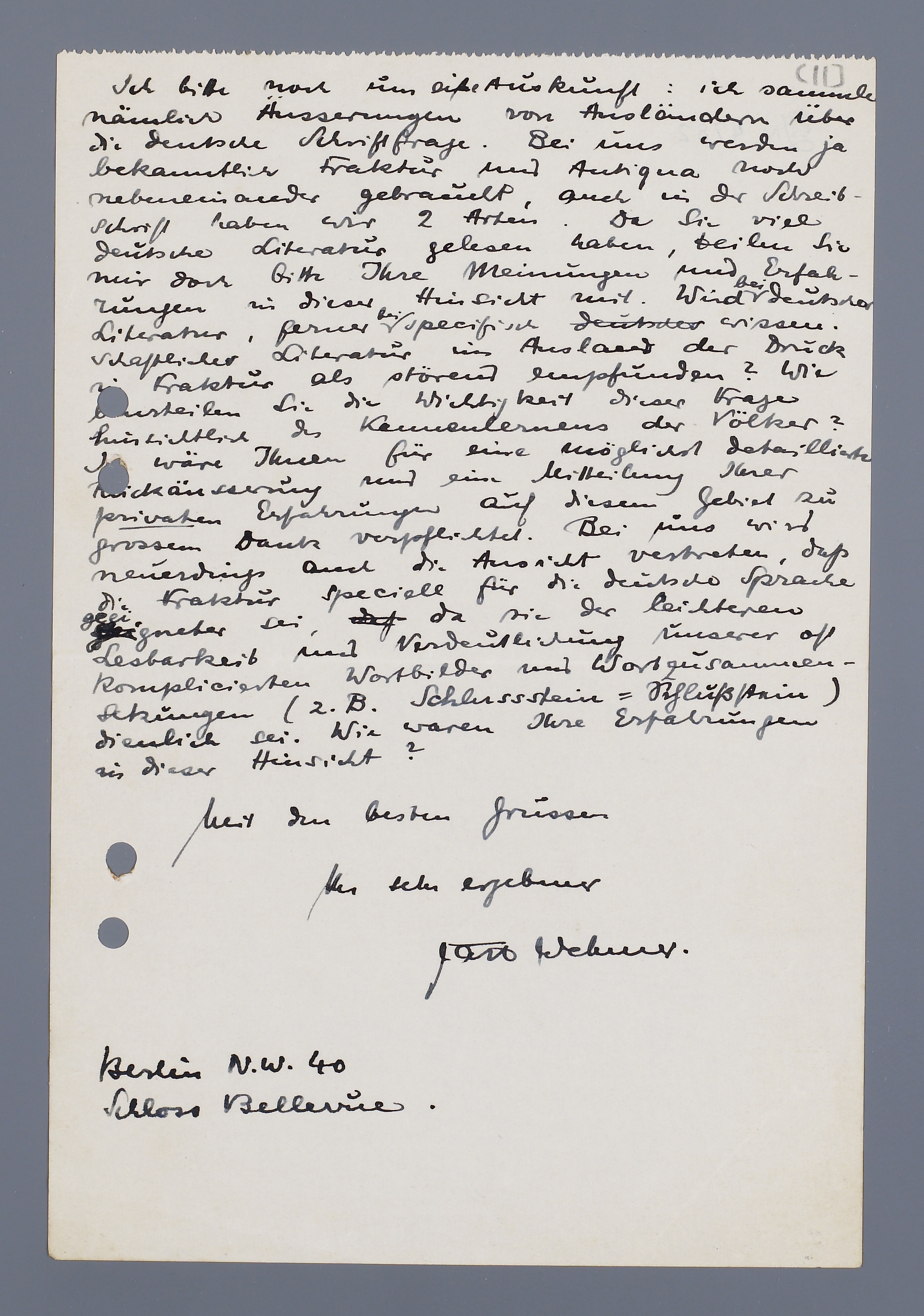 Ich bitte noch um eine Auskunft: ich sammle nämlich Äusserungen von Auslandern über die deutsche Schriftfrage. Bei uns werden ja bekanntlich Fraktur und Antiqua noch nebeneinander gebraucht, auch in der Schreibschrift haben wir 2 Arten. Da Sie viel deutsche Literatur gelesen haben, teilen Sie mir doch bitte Ihre Meinungen und Erfahrungen in dieser Hinsicht mit. Wird bei deutscher Literatur, genauer bei specifisch wissenschaftlicher Literatur ins Ausland der Druck in Fraktur als störend empfinden? Wie beurteilen Sie die Wichtigkeit dieser Frage hinsichtlich des Kennenlernens der Völker? Ich wäre Ihren für eine möglichst detaillierte [onleesbaar] und eine Mitteilung Ihrer privaten Erfahrungen auf diesem Gebiet zu grossem Dank verpflichtet. Bei uns wird neuerdings auch die Ansich vertreten, dass die Fraktur speciall für die deutsche Sprache geeignetes sei, da sie der leichteren lesbarkeit und Verdeutlichung unserer oft komplicierten Wortbilder und Wortzusammensetzungen (z.B. Schlussstein = [onleesbaar]) dienlich sei. Wie waren Ihre Erfahrungen in dieser Hinsicht?