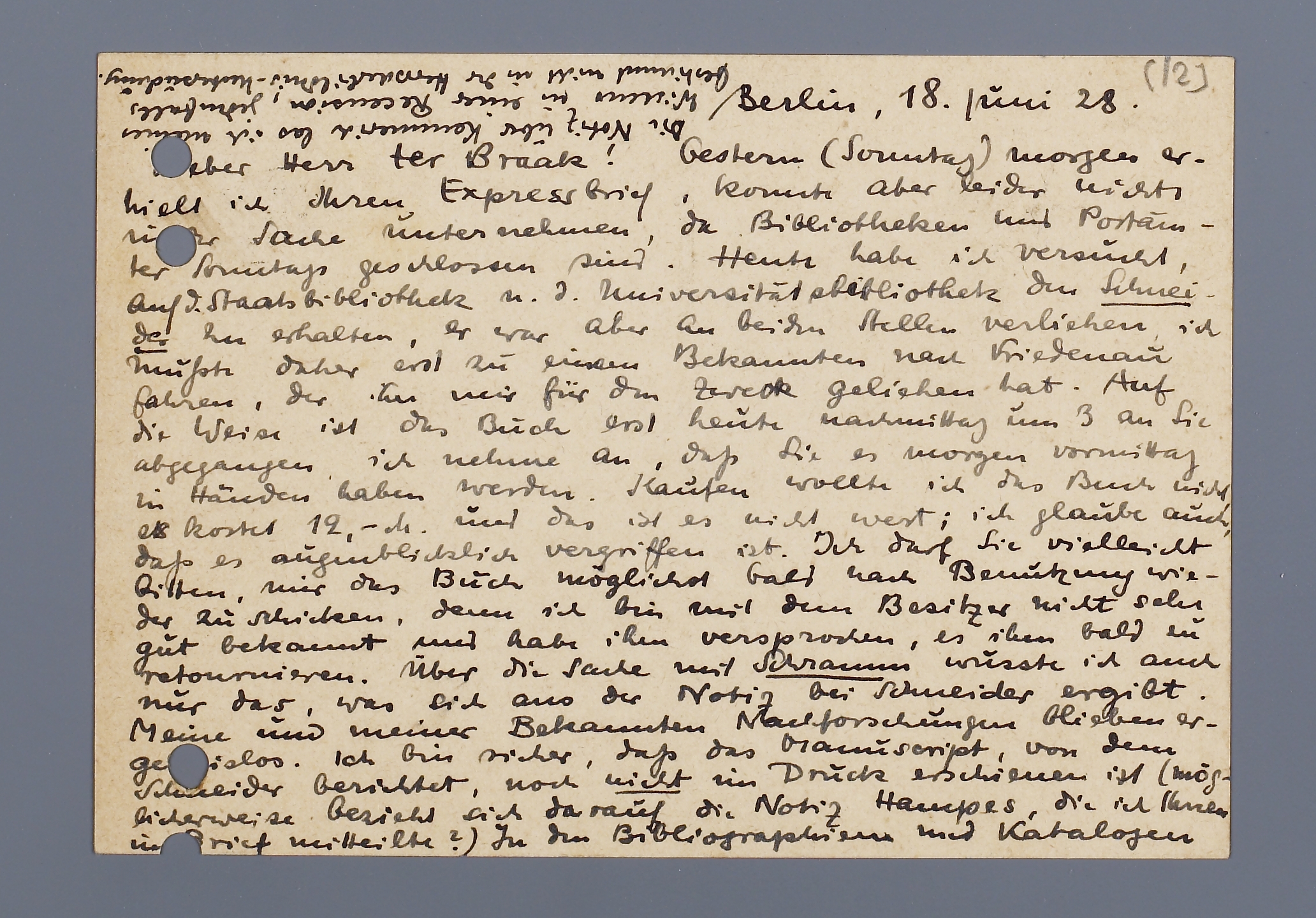 Gestern (Sonntag) morgen erhielt ich Ihren Expressbrief, konnte aber leider nichts [onleesbaar] Sache unternehmen, da Bibliotheken und Postamter Sonntags geschlossen sind. Heute habe ich versucht, auf d. Staatsbibliothek n.d. Universitätsbibliothek den Schneider zu erhalten, es war aber an beider Stellen verliehen, ich musste daher erst zu einem Bekannten nach Friedenau fahren, der ihn mir für den Zweck geliehen hat. Auf die Weise ist das Buch erst heute nachmittag um 3 an Sie abgegangen, ich nehme an, dass Sie es morgen vormittag in Händen haben werden. Kaufen wollte ich das Buch nicht es kostet 12,-M und das ist es nicht wert; ich glaube auch, dass es augenblicklich vergriffen ist. Ich darf Sie vielleicht bitten, mir das Buch möglichtst bald nach Benutzung wieder zu schicken, denn ich bin mit denn Besitzer nicht sehr gut bekannt und habe ihm versprochen, es ihm bald zu retournieren. Über die Sache mit Schramm wusste ich auch nur das, was sich aus der Notiz bei Schneider ergibt. Meine und meiner Bekannten Nachforschungen blieben ergebnislos. Ich bin sicher dass das Manuscript, von dem Schneider berichtet, noch nicht im Druck erschienen ist (möglicherweise bezieht sich darauf die Notiz Hampes, die ich Ihnen im Brief mitteilte?) In Ihr Bibliographien und Katalogen war nichts Entsprechendes zu finden und wir sind sicher, dass es uns nicht entgangen wäre, dass es erschienen wäre.