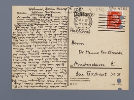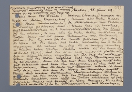 Es tut mir leid Ihnen in der Schramm-Sache keinen konkreteren Bescheid geben zu können; wenn Sie noch etwas Zeit hätten, würde ich Ihnen geraten haben, mit Schramm selbst über die Frage zu korrespondieren. Seine Adresse ist mir unbekannt, adressieren Sie einfach: Heidelberg, Universität (Sie finden die Adresse wohl in der ‘Minerva, Jahrbuch der [onleesbaar] Welt’ fällt mir gerade ein!). Ihre Karte erhielt ich heute, ich finde, dass Sie mit 100,-M meine Arbeit sehr reichlich bezahlen; wollen Sie darum aber bitte davon absehen, meine erwährten Porto auslagen sowie meine heutigen Ausgaben noch extra zu bezahlen.