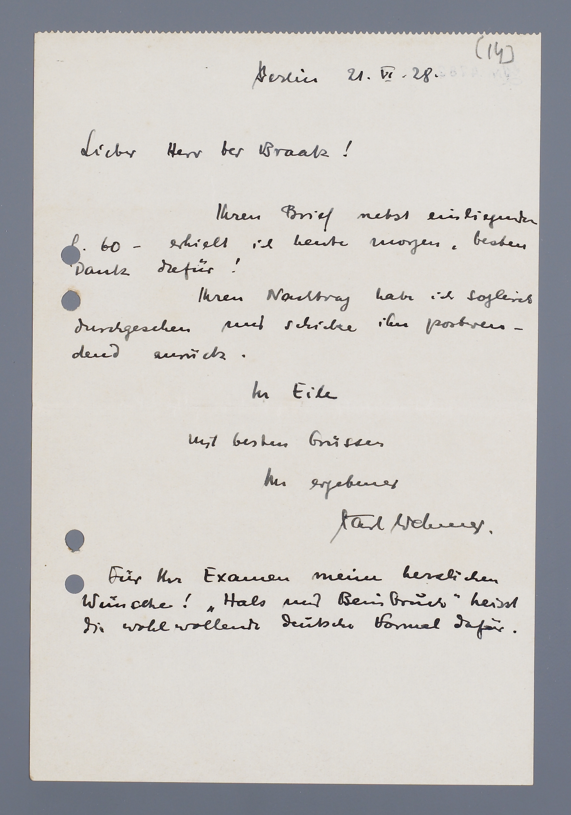 Ihren Brief nebst einliegender [f] -60 erhielt ich heute morgen, besten Dank dafür!