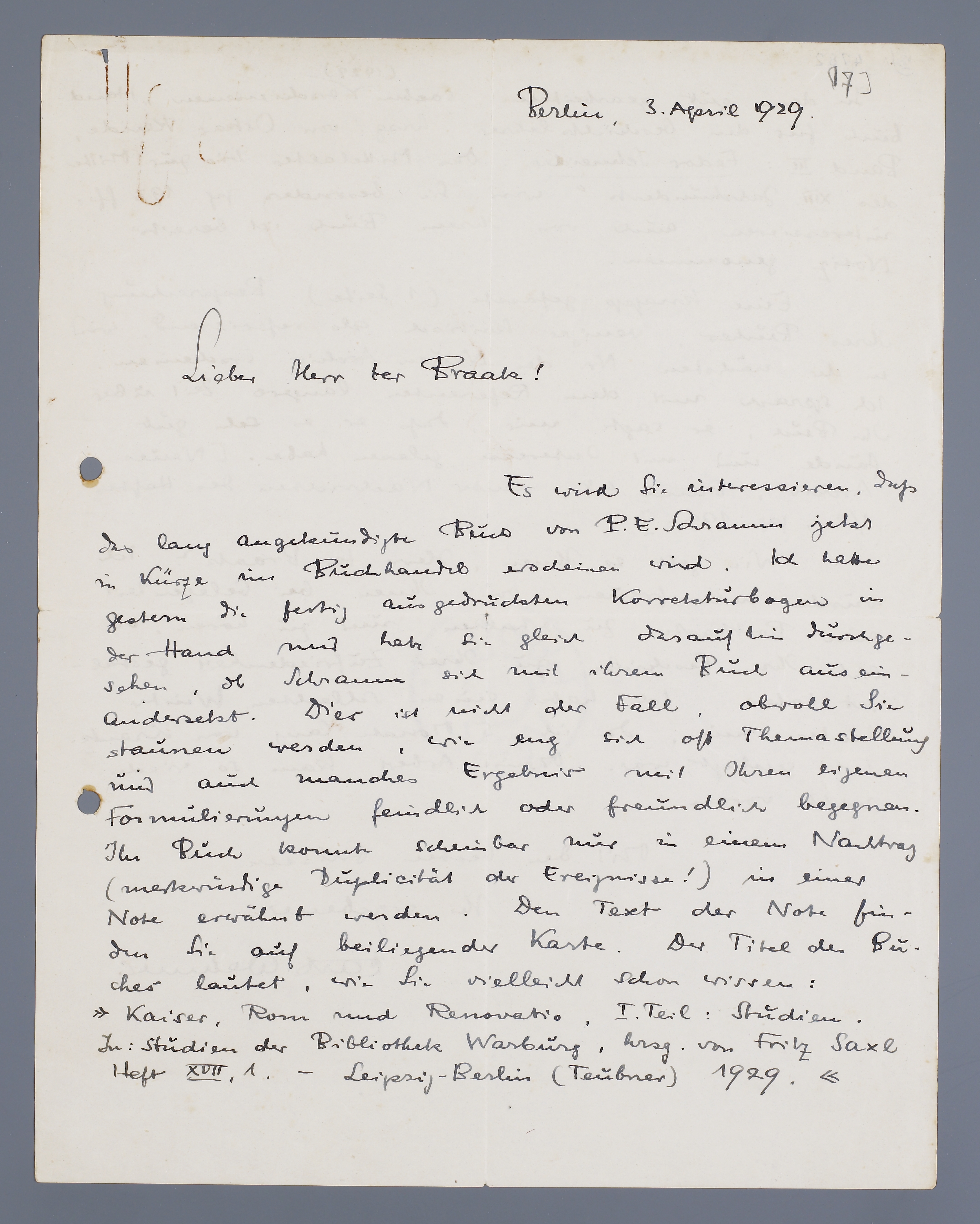Es wird Sie interessieren dass das lang angekündigte Buch von P.E. Schramm jetzt in Kürze im Buchhandel erscheinen wird. Ich hatte gestern die fertig ausgedruckten Korrekturbogen in der Hand und habe Sie gleich daraufhin durchgesehen, ob Schramm sich mit ihrem Buch auseinandersetzt. Dies ist nicht der Fall, obwolhl Sie staunen werden, wie eng sich oft Themastellung und auch manches Ergebnis mit Ihren eigenen Formulierungen feindlich oder freundlich begegnen. Ihr Buch konnte scheinbar nur in einem Nachtrag (merkwürdige Duplicität der Ereignisse!) in einer Note erwähnt werden. Den Text der note finden Sie auf beiliegender karte. Der Titel des Buches lautet, wie Sie vielleicht schon wissen: