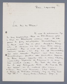 Wie geht es Ihnen, Herr ter Braak? Ich würde mich freuen von Ihnen bei Gelegenheit eine Postkart zu erhalten und zu hören, ob sich Ihre Geschicke zu Ihrer Zufriedenheit gestaltet haben. Ich habe einen schlechten Winter hinter mir, da ich 5 Monate lang von Krankheit geplagt war. Meine Arbeit kam so wieder nicht voran.
