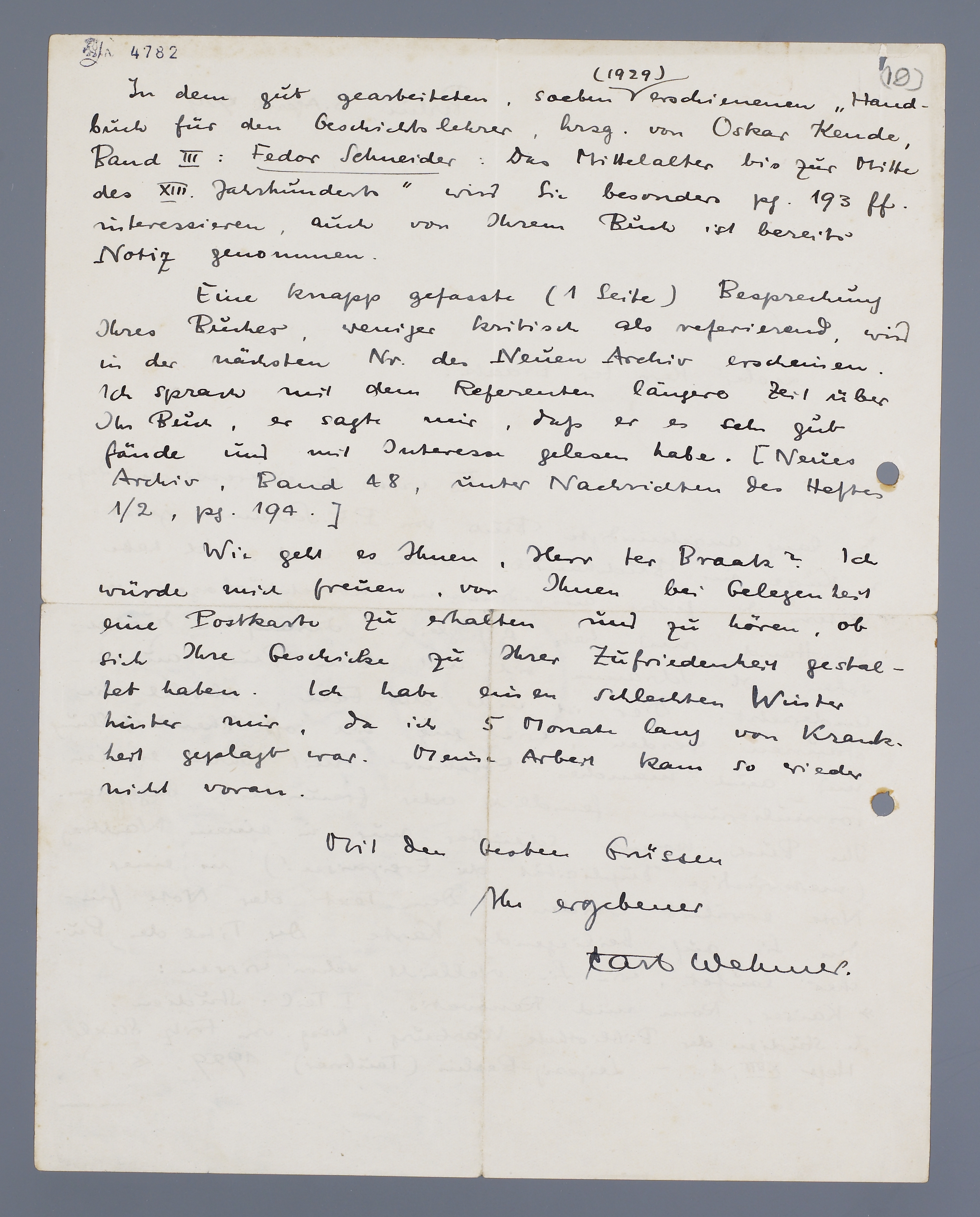 In dem gut gearbeiteten, soeben (1929) erschienenen ‘Handbuch für den Geschichtslehrer, hrsg. von Oskar Kende, Band III: Fedor Schneider: Das Mittelalter bis zur Mitte des XIII. Jahrhunderts’ wird Sie besonders pg. 193 ff. interessieren, auch von Ihrem Buch ist bereits Notiz genommen.