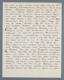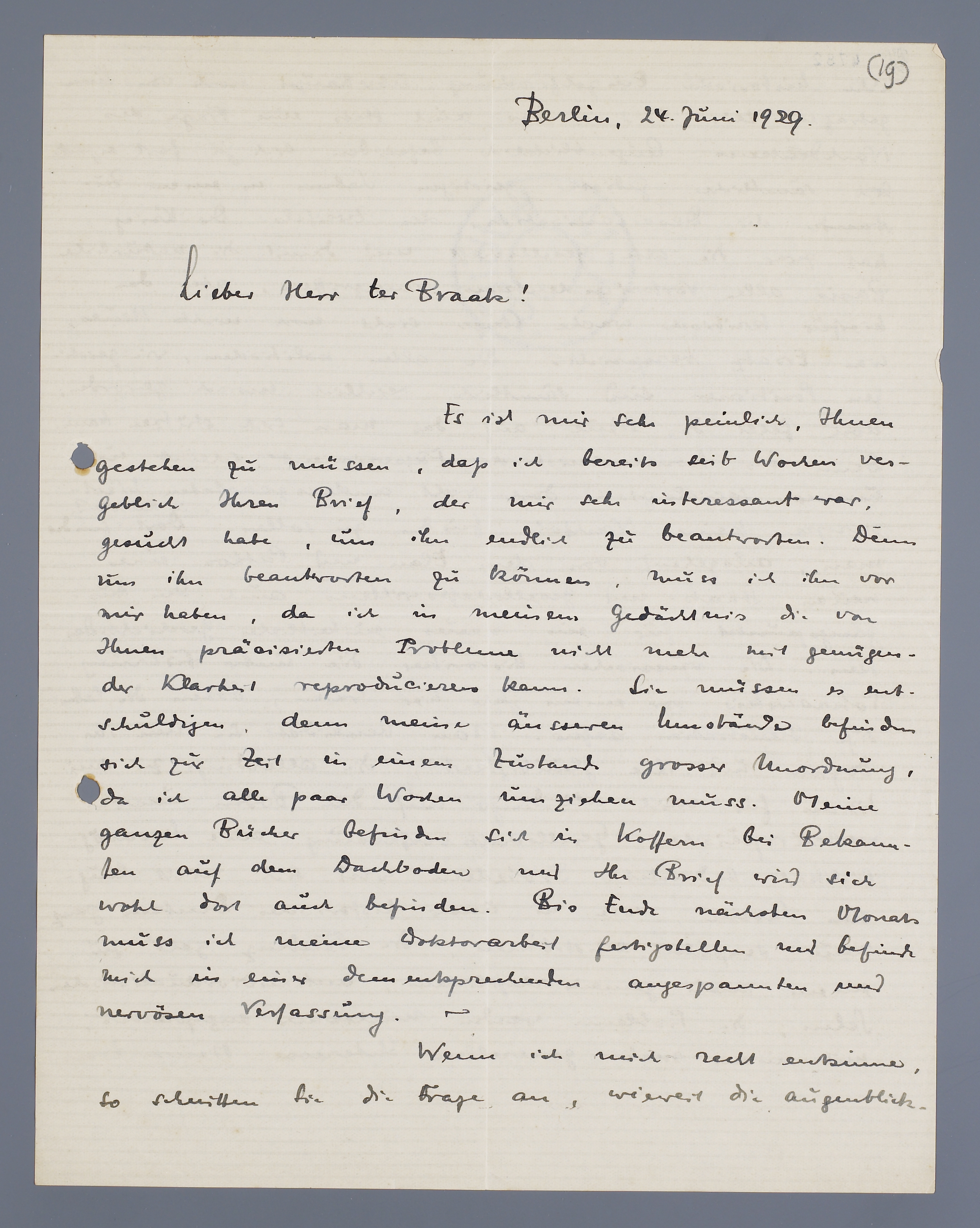 Es ist mir sehr peinlich, Ihnen gestehen zu müssen, dass ich bereits seit Wochen vergeblich Ihren Brief, der mir sehr interessant war, gesucht habe, um ihn endlich zu beantworten. Denn um ihn beantworten zu können, muss ich ihn vor mir haben, da ich in meinem Gedächtnis die von Ihnen präcisierten Probleme nicht mehr mit genügender Klarheit reproducieren kann. Sie müssen es entschuldigen, denn meine äusseren Umstände befinden sich zur Zeit in einem Zustand grosser Unordnung, da ich alle paar Wochen umziehen muss. Meine ganzen Bücher befinden sich in Koffern bei Bekannten auf dem Dachboden und Ihr Brief wird sich wohl dort auch befinden. Bis Ende nächsten Monats muss ich meine Doktorarbeit fertigstellen und befinde mich in einer dem entsprechenden angespannten und nervösen Verfassung.