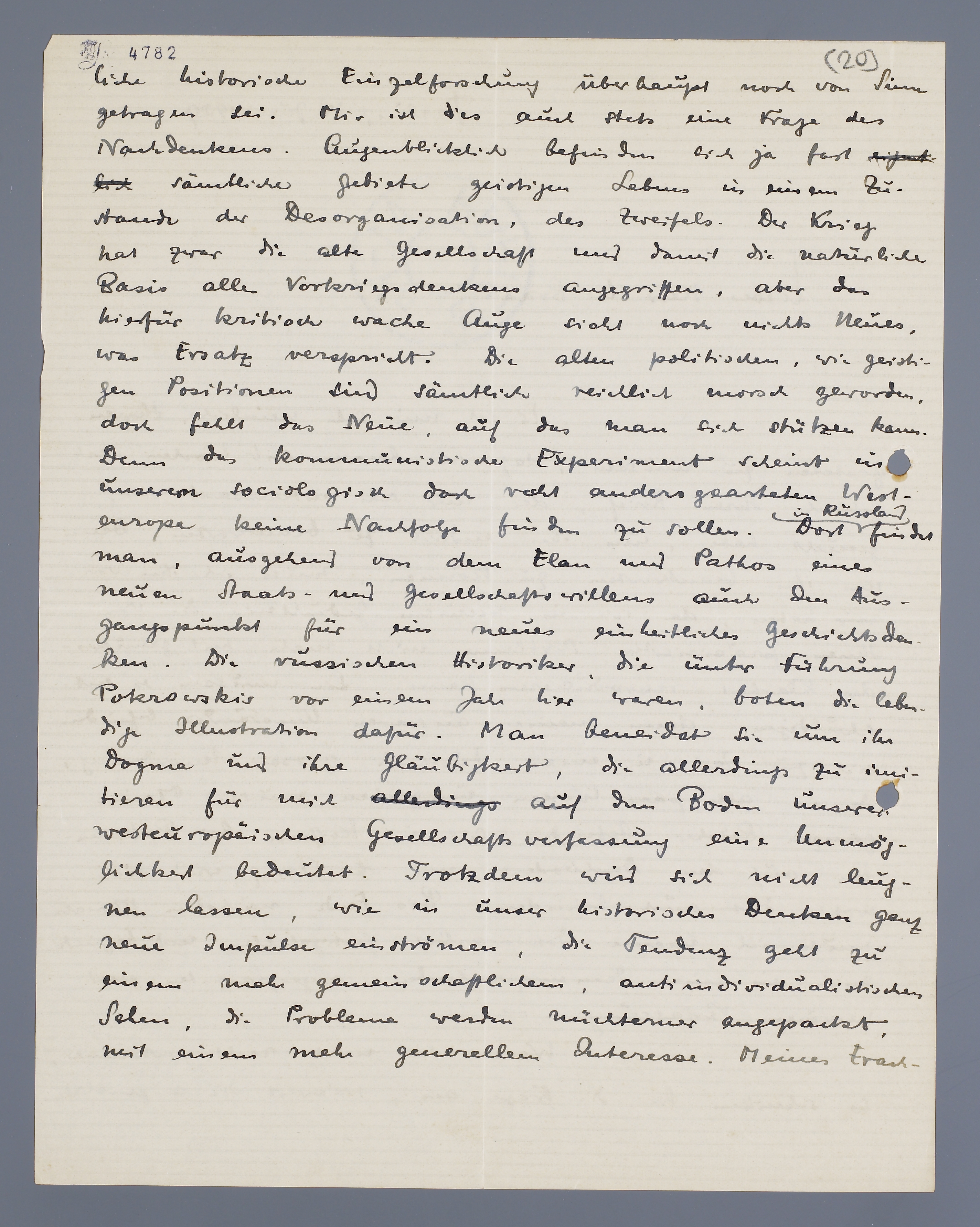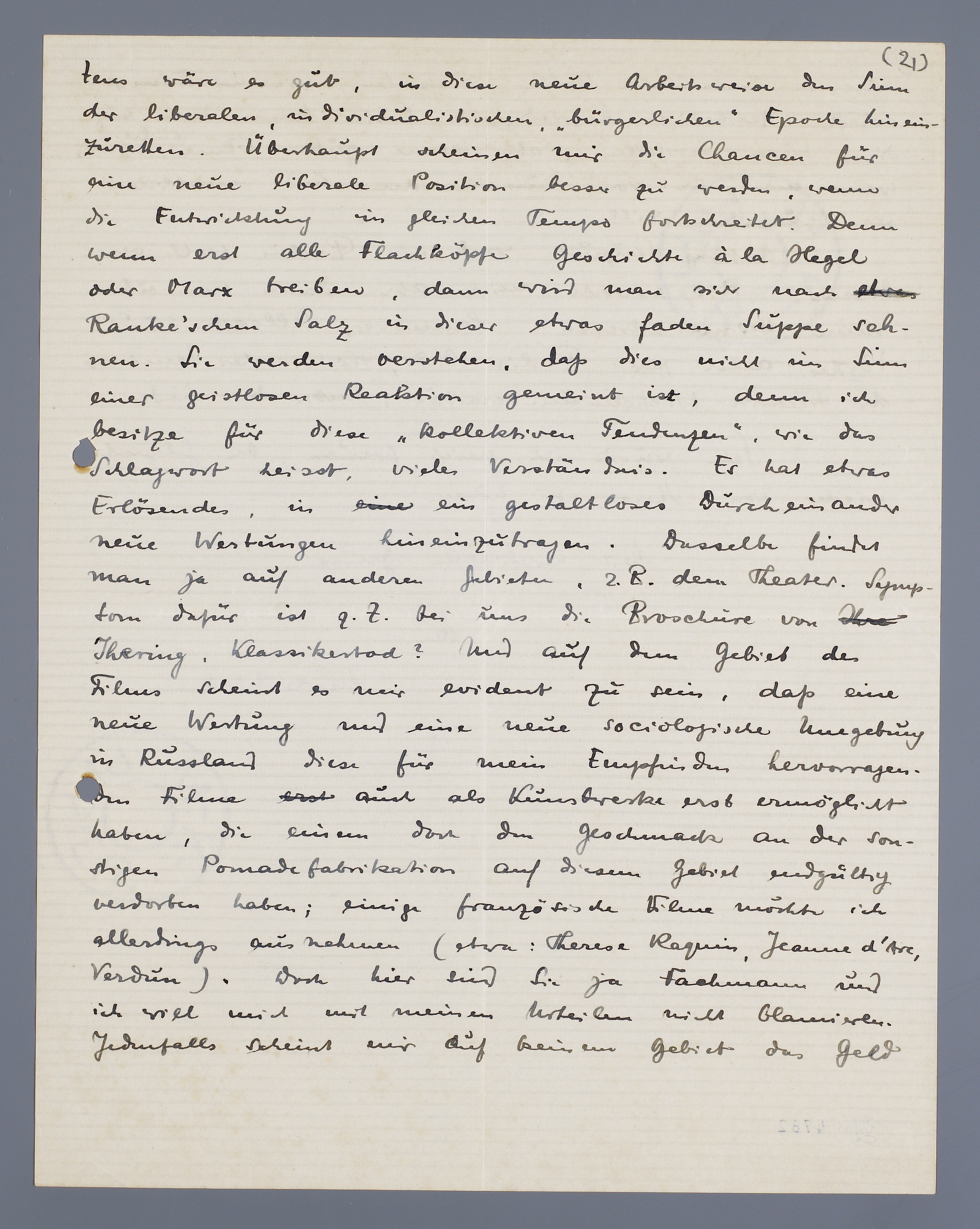 Wenn ich mich recht entsinne, so schnitten Sie die Frage an, wieweit die augenblickliche historische Einzelforschung überhaupt noch von Sinn getragen sei. Mir ist dies auch stets eine Frage des Nachdenkens. Augenblicklich befinden sich ja fast sämtliche Gebiete geistigen Lebens in einem Zustande der Desorganisation, des Zweifels. Der Krieg hat zwar die alte Gesellschaft und damit die natürliche Basis allen Vorkriegsdenkens angegriffen, aber das hierfür kritisch wache Auge sieht noch nichts Neues, was Ersatz verspricht. Die alten politischen, wie geistigen Positionen sind samtlich vielleicht [onleesbaar] geworden, doch fehlt das Neue, auf das man sich stützen kann. Denn das kommunistische Experiment scheint in unserem sociologisch doch recht anders gearteten Westeuropa keine Nachfolge finden zu sollen. Dort in Rüssland findet man, augehend von dem Elan und Pathos eines neuen Staats- und Gesellschaftwillens auch den Ausgangspunkt für ein neues einheitliches Geschichtsdenken. Die russischen Historiker, die unter Führung Pokrowakis vor einem Jahr hier waren, boten die Lebendige Illustration dafür. Man beneidet Sie um ihr Dogma und ihre Glaübigkeit, die allerdings zu imitieren für mich auf den Boden unserer westeuropaischen Gesellschaftsverfassung eine Unmöglichkeit bedeutet. Trotzdem wird sich nicht leugnen lassen, wie in unser historisches Denken ganz neue Impulse einströmen, die Tendenz geht zu einem mehr gemeinschaftlichem, anti individualistischen Sehen, die Probleme werden nüchterner angepackt, mit einem mehr generellen Interesse. Meines Erachtens wäre es gut, in dieser neue Arbeitsweise den Sinn der liberalen, individualistischen, ‘bürgerlichen’ Epoche heneinzuretten. Uberhaupt scheinen mir die Chancen für eine neue liberale Position besser zu werden, wenn die Entwicklung in gleichen Tempos fortschreitet. Denn wenn erst alle Flachköpfe Geschichte à la Hegel oder Marx treiben, dann wird man sich nach Rankischen Salz in dieser etwas faden Suppe sehnen. Sie werden verstehen, dass dies nicht im Sinn einer geistlosen Reaktion gemeint ist, denn ich besitze fur diese ‘kollektiven Tendenzen’, wie das Schlagwort heisst, vieles Verständnis. Es hat etwas Erlösendes, in ein gestaltloses Durcheinander neue Wertungen hineinzutragen. Dasselbe findet man ja auf anderen Gebieten, z.B. dem Theater. Symptom dafür ist [onleesbaar] bei uns die Broschüre von Ihering, Klassikertod? Und auf dem Gebiet des Films scheint es mir evident zu sein, dass eine neue Wertung und eine neue sociologische Umgebung in Russland dieser für mein Empfinden hervorsagender Filme auch als Kunstwerke erst ermöglicht haben, die einem doch dem Geschmack an der sonnstigen Pomadefabrikation auf diesem Gebiet endgultig verdorben haben; einige französische Filme möchte ich allerdings ausnehmen (etwa: Therese Raquin, Jeanne d'Arc, Verdun). Doch hier sind Sie ja Fachmann und ich will mich mit meinen Urteilen nich blamieren. Jedenfalls scheint mir auf keinem Gebiet das Geld eine so unheilvolle Rolle su spielen, wie im Filmgeschäft. Aesthetisch befriedigender Autos kann man auf diese Weise herstellen, aber keine guten Filme; nämlich gut, wenn man Sie vom künstlerischen und wesentlichen beurteilen will.