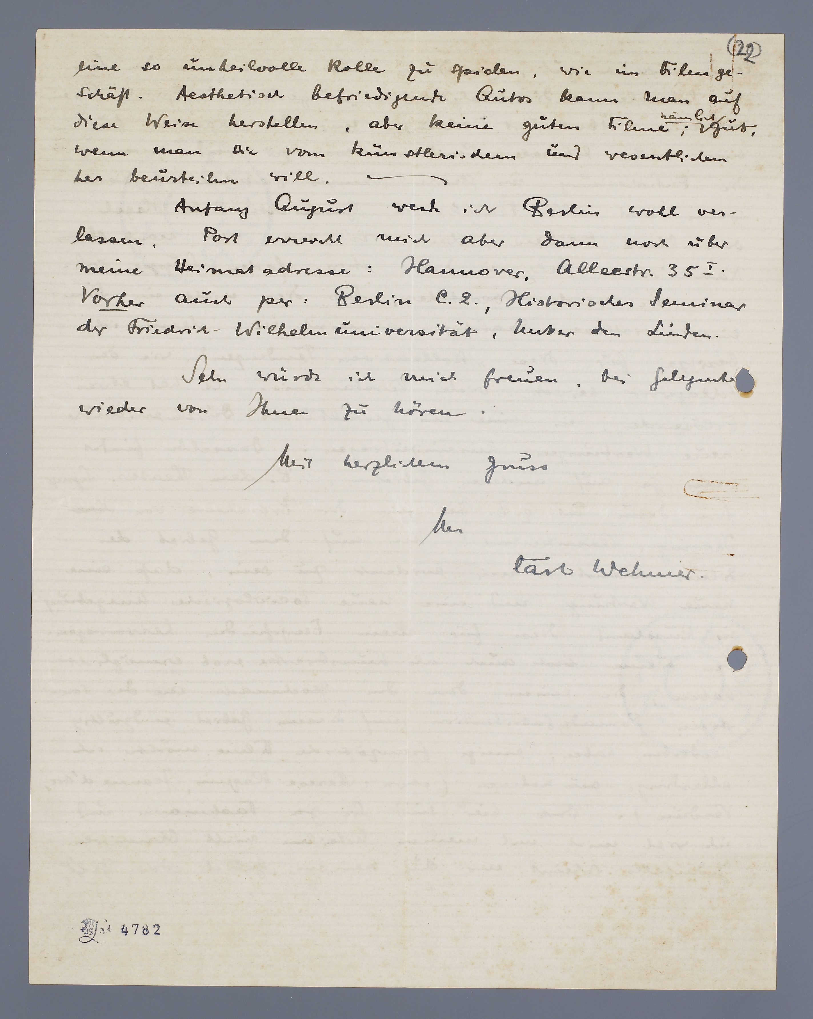 Anfang August wirde ich Berlin wohl verlassen. Post erreicht mich aber dann noch über meine Heimatadresse: Hannover, Alleestr. 35 I. Vorher auch per: Berlin C.2., Historisches Seminar der Friedrich- Wilhelmuniversität, Unter den Linden.