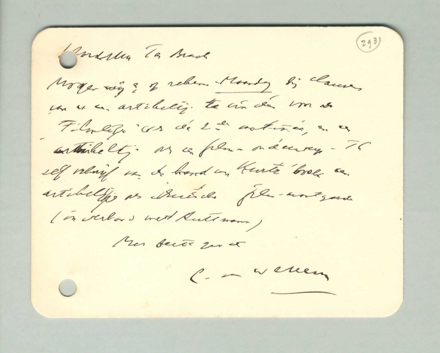 Mogen wij er op rekenen Maandag bij Clausen van u een artikeltje te vinden voor de Filmliga over de 2de matinée, en een artikeltje over een film-onderwerp. Ik zelf schrijf aan de hand van Kurtz' boek een artikeltje over Duitsche film-avantgarde (in verband met Ruttmann)
