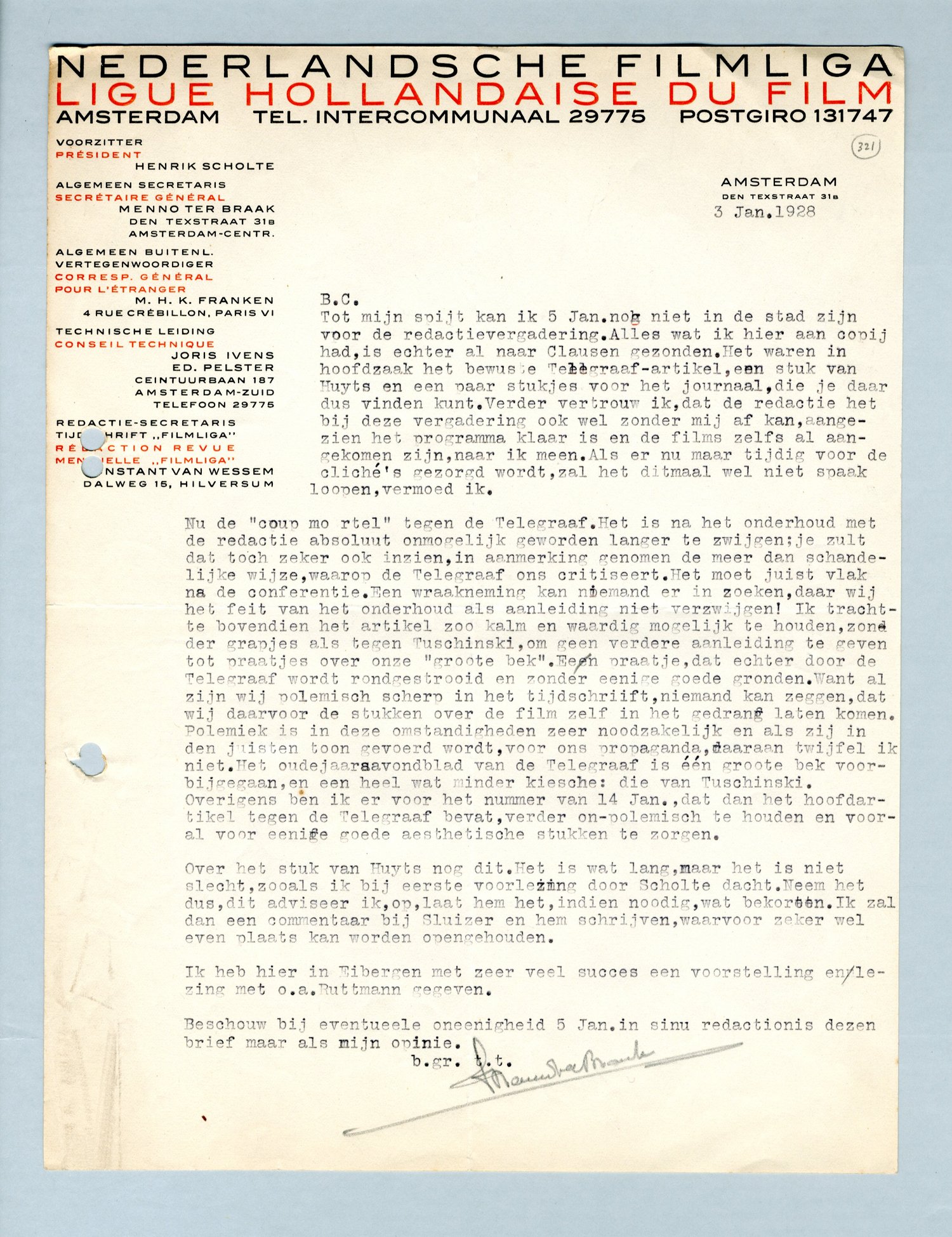 Nu de ‘coup mortel’ tegen de Telegraaf. Het is na het onderhoud met de redactie absoluut onmogelijk geworden langer te zwijgen; je zult dat toch ook inzien, in aanmerking genomen de meer dan schandelijke wijze, waarop de Telegraaf ons critiseert. Het moet juist vlak na de conferentie. Een wraakneming kan niemand er in zoeken, daar wij het feit van het onderhoud als aanleiding niet verzwijgen! Ik trachtte bovendien het artikel zoo kalm en waardig mogelijk te houden, zonder grapjes als tegen Tuschinski, om geen verdere aanleiding te geven tot praatjes over onze ‘groote bek’. Een praatje, dat echter door de Telegraaf wordt rondgestrooid en zonder eenige goede gronden. Want al zijn wij polemisch scherp in het tijdschrift, niemand kan zeggen, dat wij daarvoor de stukken over de film zelf in het gedrang laten komen. Polemiek is in deze omstandigheden zeer noodzakelijk en als zij in den juisten toon gevoerd wordt, voor ons propaganda, daaraan twijfel ik niet. Het oudejaars avondblad van de Telegraaf is één groote bek voorbijgegaan, en een heel wat minder kiesche: die van Tuschinski.
