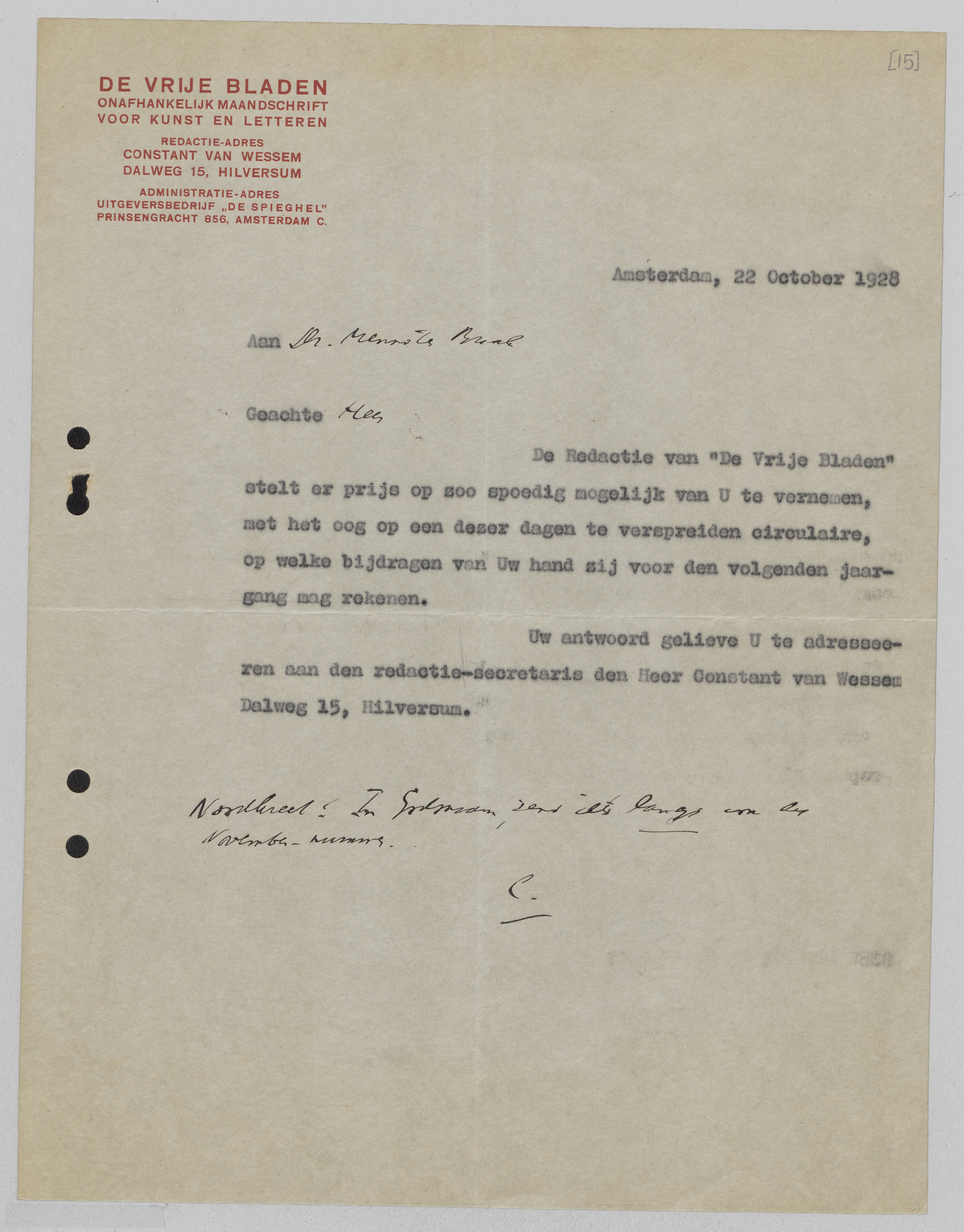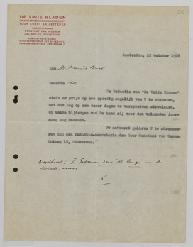 De redactie van De Vrije Bladen stelt er prijs op zoo spoedig mogelijk van U te vernemen, met het oog op een dezer dagen te verspreiden circulaire, op welke bijdragen van Uw hand zij voor den volgenden jaargang mag rekenen.