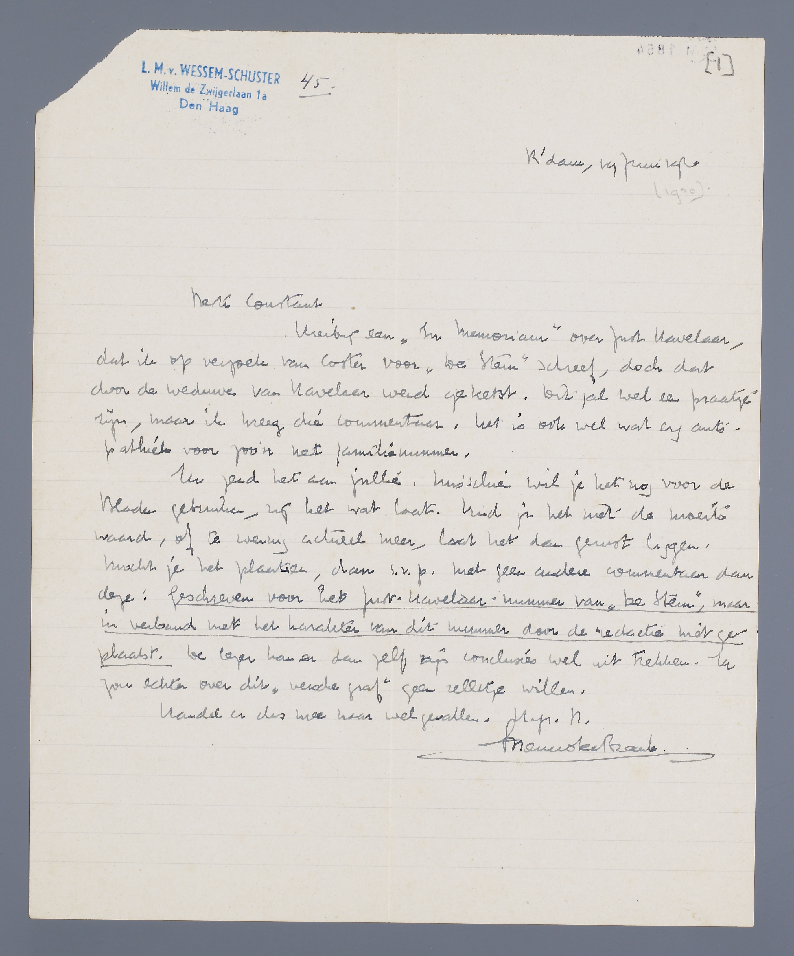 Hierbij een ‘In Memoriam’ over Just Havelaar, dat ik op verzoek van Coster voor De Stem schreef, doch dat door de weduwe van Havelaar werd geketst. Dit zal wel een praatje zijn, maar ik kreeg die commentaar, het is ook wel wat erg antipathiek voor zoo'n net familienummer.