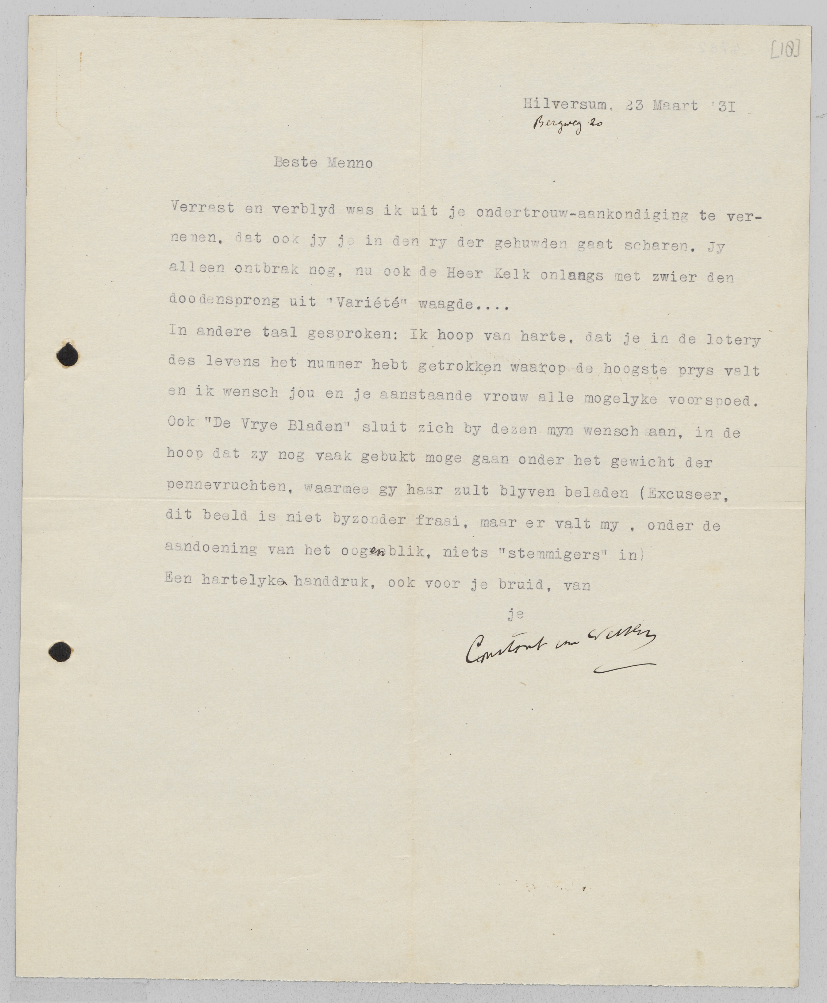 Verrast en verblijd was ik uit je ondertrouw-aankondiging te vernemen, dat ook jij je in den rij der gehuwden gaat scharen. Jij alleen ontbrak nog, nu ook de Heer Kelk onlangs met zwier den doodensprong uit ‘Variété’ waagde...
