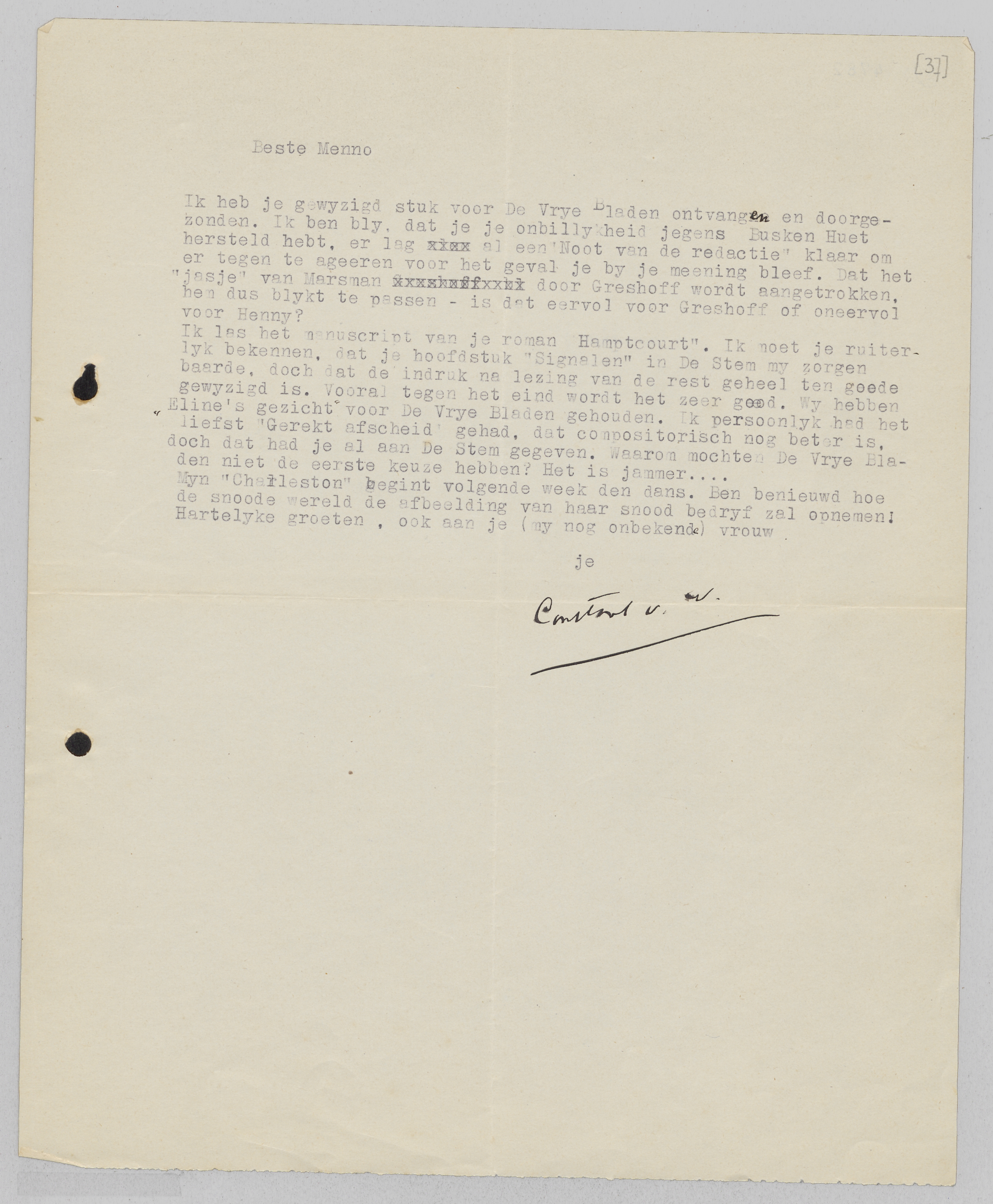 Ik las het manuscript van je roman Hampton Court. Ik moet je ruiterlijk bekennen, dat je hoofdstuk ‘Signalen’ in De Stem mij zorgen baarde, doch dat de indruk na lezing van de rest geheel ten goede gewijzigd is. Vooral tegen het eind wordt het zeer goed. Wij hebben ‘Eline's gezicht’ voor De Vrije Bladen gehouden. Ik persoonlijk had het liefst ‘Gerekt afscheid’ gehad, dat compositorisch nog beter is, doch dat had je al aan De Stem gegeven. Waarom mochten De Vrije Bladen niet de eerste keuze hebben? Het is jammer...