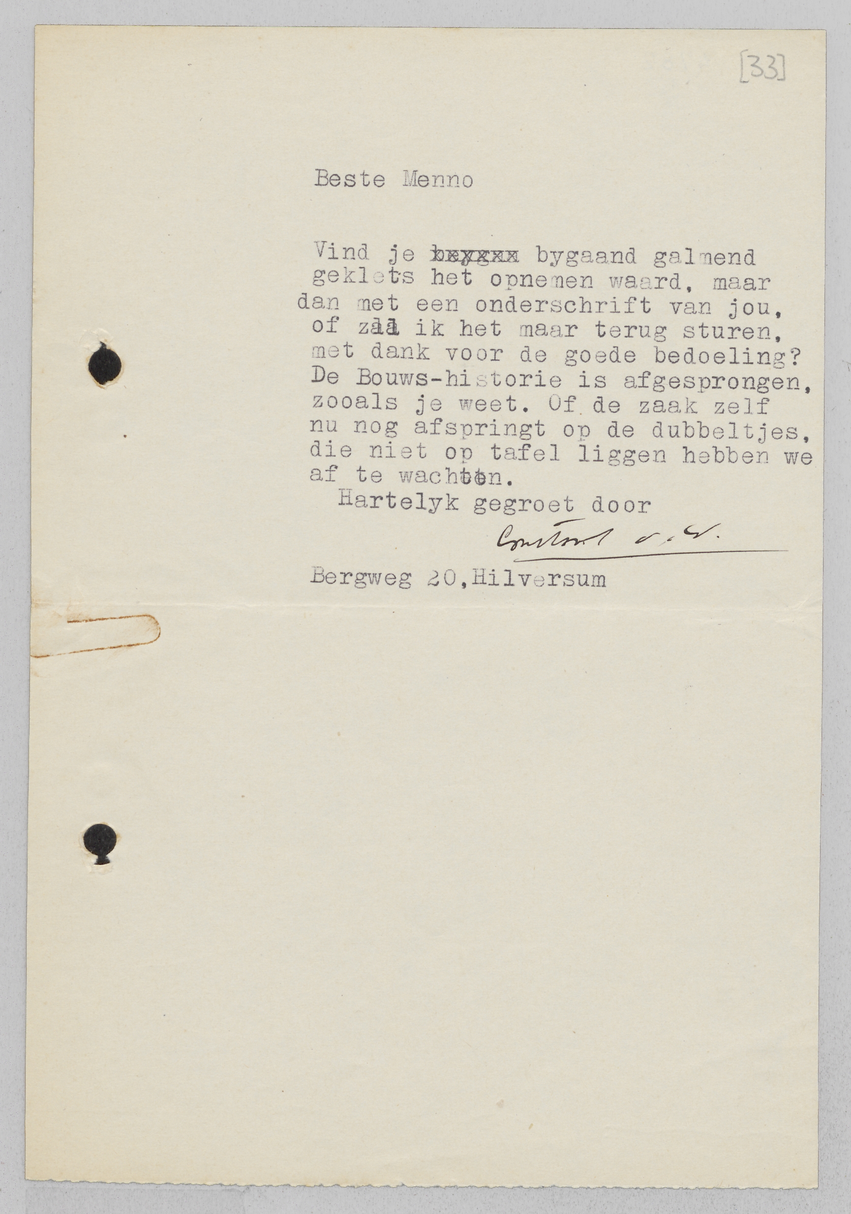 Vind je bijgaand galmend geklets het opnemen waard, maar dan met een onderschrift van jou, of zal ik het maar terug sturen, met dank voor de goede bedoeling? De Bouws-historie is afgesprongen zooals je weet. Of de zaak zelf nu nog afspringt op de dubbeltjes, die niet op tafel liggen hebben we af te wachten.