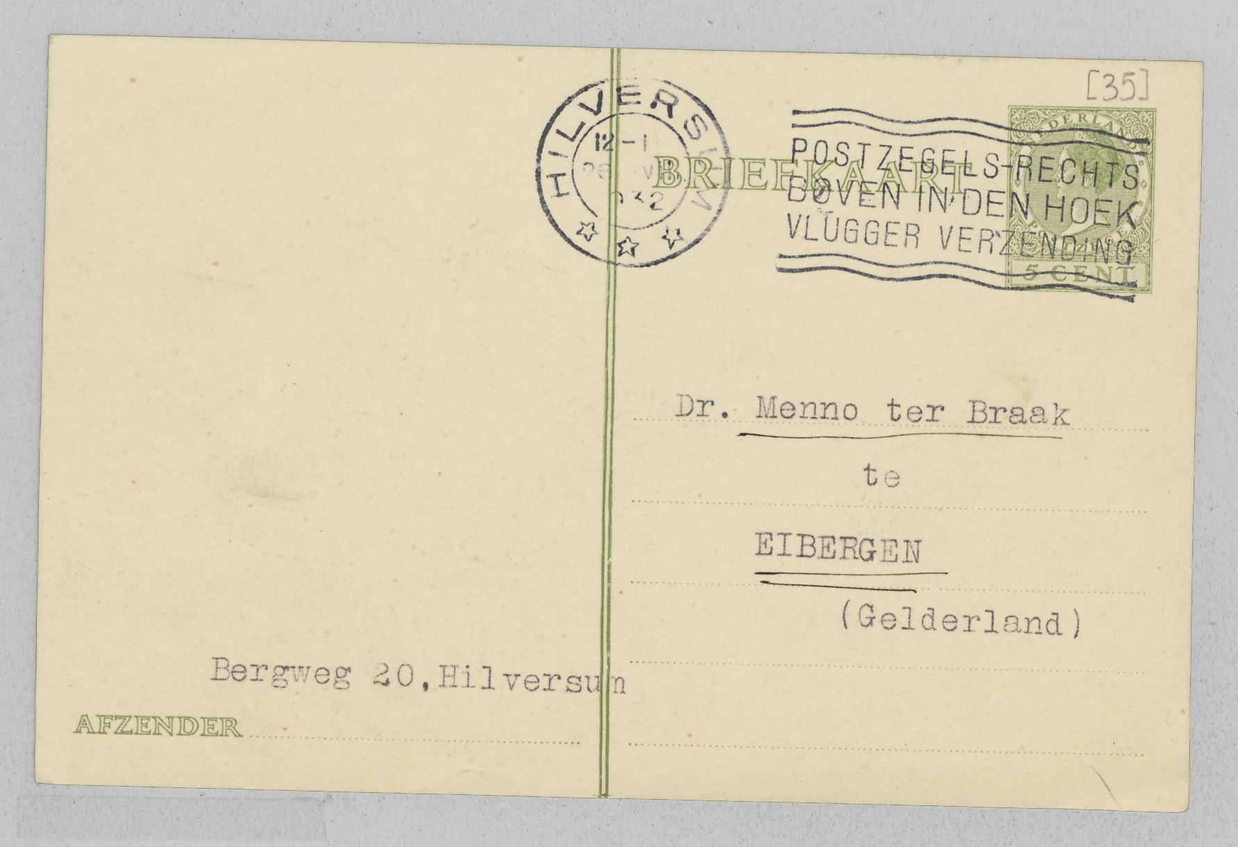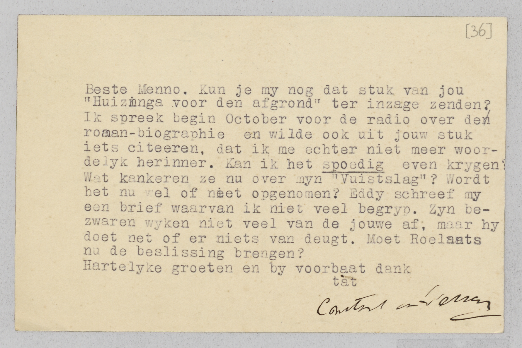 Kun je mij nog dat stuk van jou ‘Huizinga voor den afgrond’ ter inzage zenden? Ik spreek begin October voor de radio over de roman-biographie en wilde ook uit jouw stuk iets citeeren, dat ik me echter niet meer woordelijk herinner. Kan ik het spoedig even krijgen?