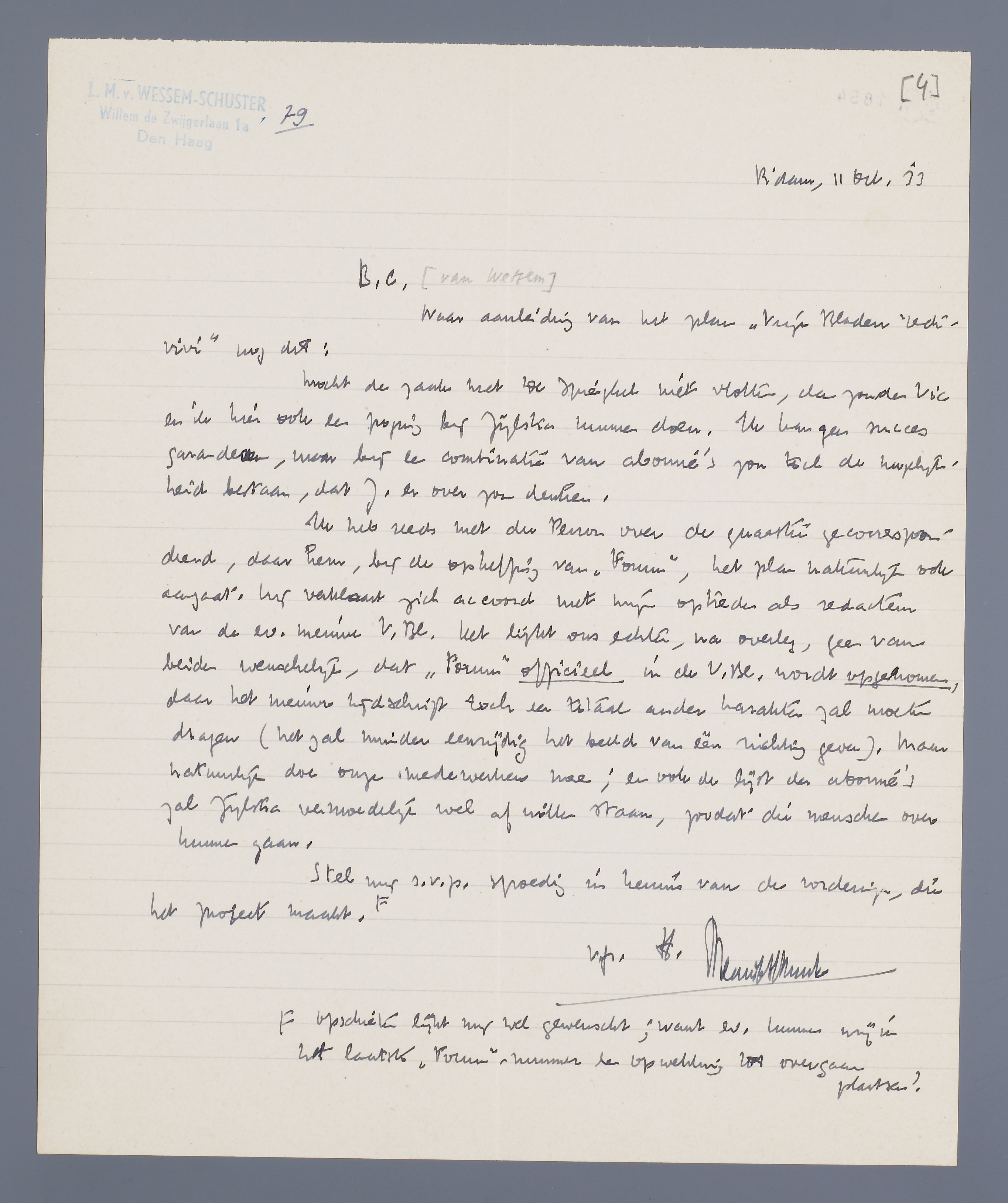 Stel mij s.v.p. spoedig in kennis van de vorderingen, die het project maakt. Opschieten lijkt mij wel gewenscht; want ev. kunnen wij in het laatste Forum-nummer [een] opwekking tot overgaan plaatsen?