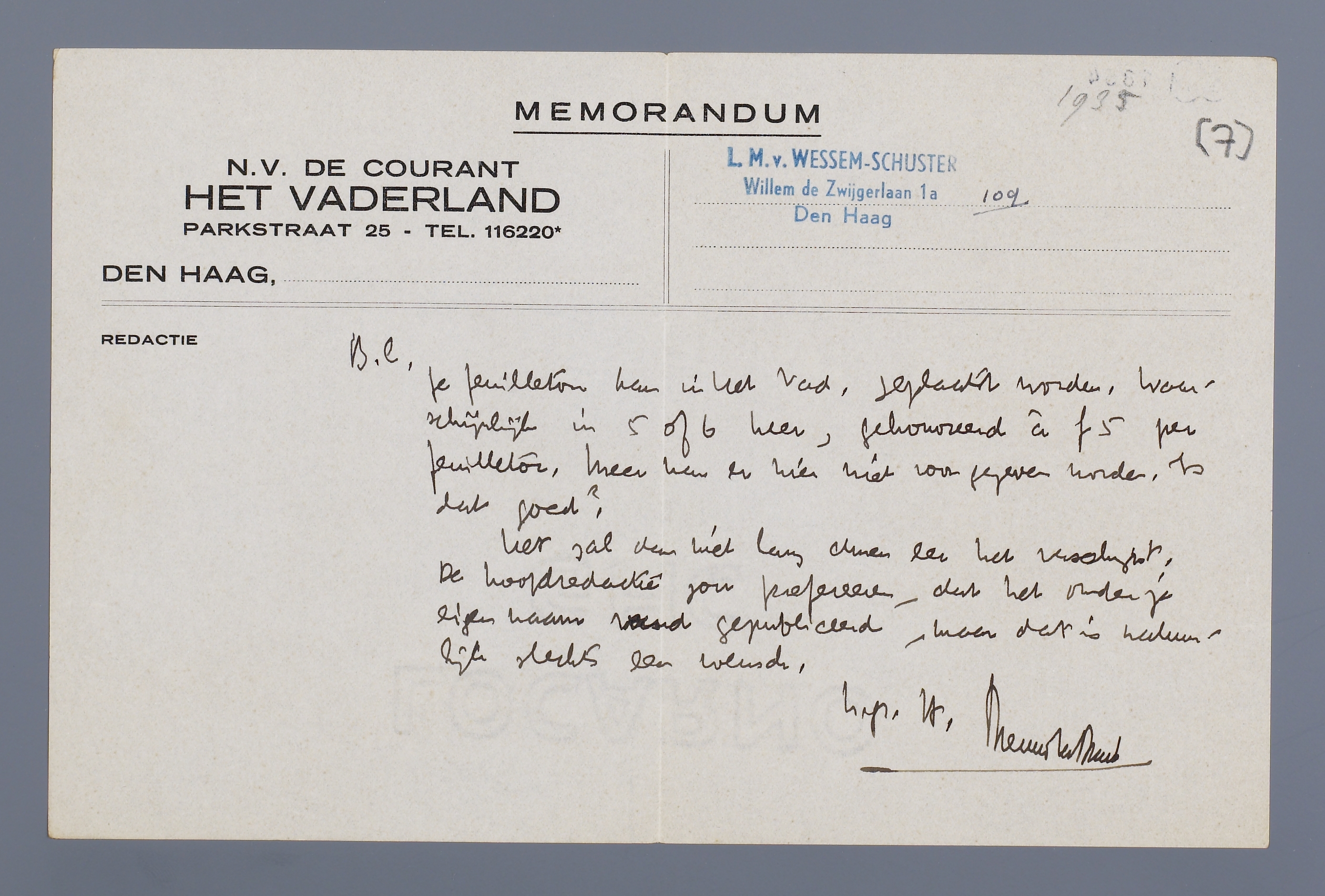 Je feuilleton kan in het Vad. geplaatst worden. Waarschijnlijk in 5 of 6 keer, gehonoreerd à f 5 per feuilleton, meer kan er hier niet voor gegeven worden. Is dat goed?