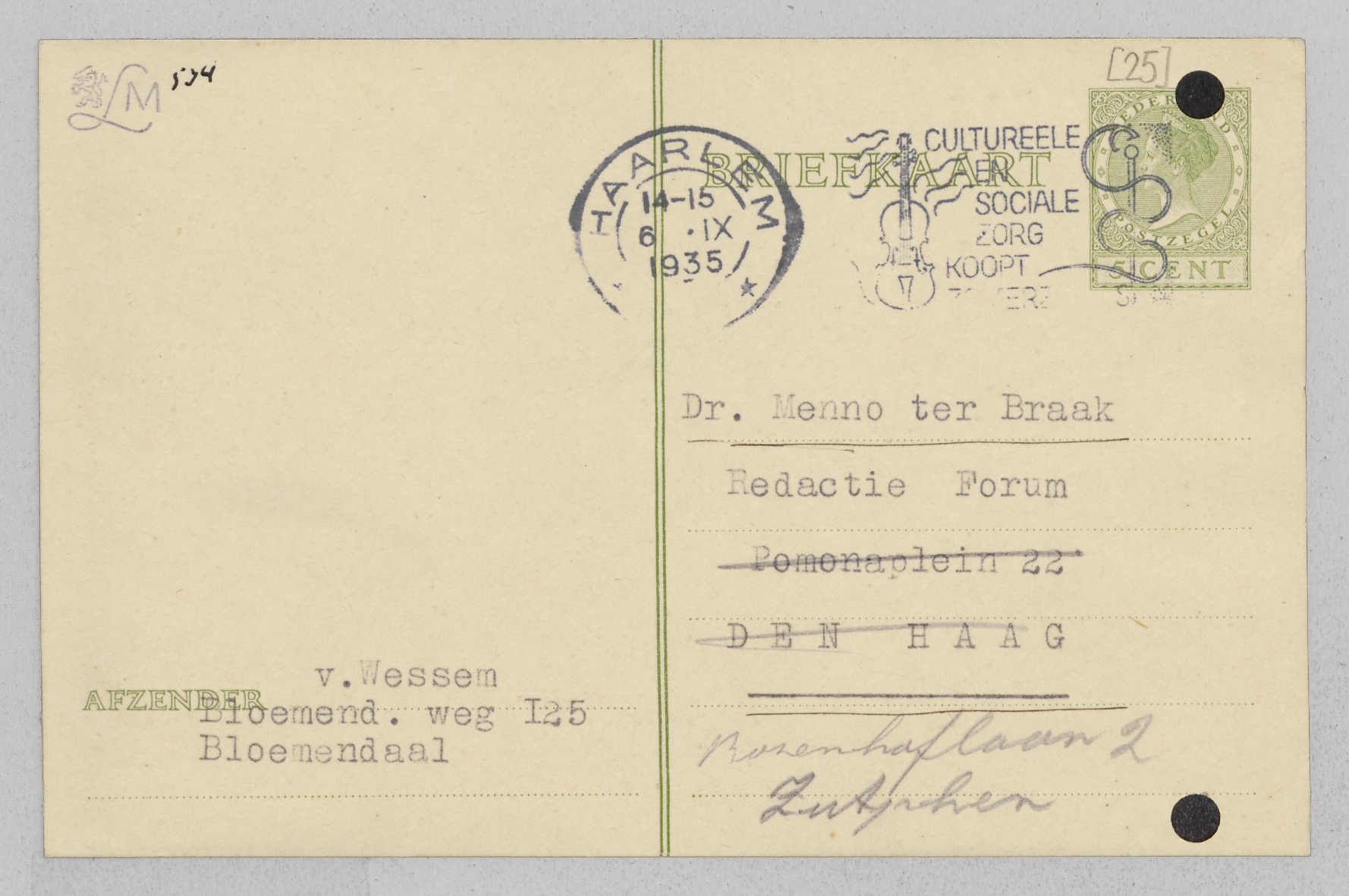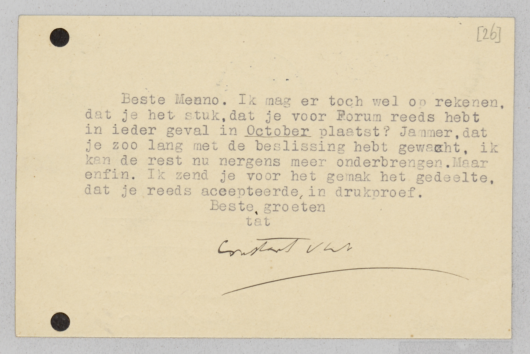 Ik mag er toch wel op rekenen, dat je het stuk, dat je voor Forum reeds hebt in ieder geval in October plaatst? Jammer, dat je zoo lang met de beslissing hebt gewacht, ik kan de rest nu nergens meer onderbrengen. Maar enfin. Ik zend je voor het gemak het gedeelte, dat je reeds accepteerde, in drukproef.