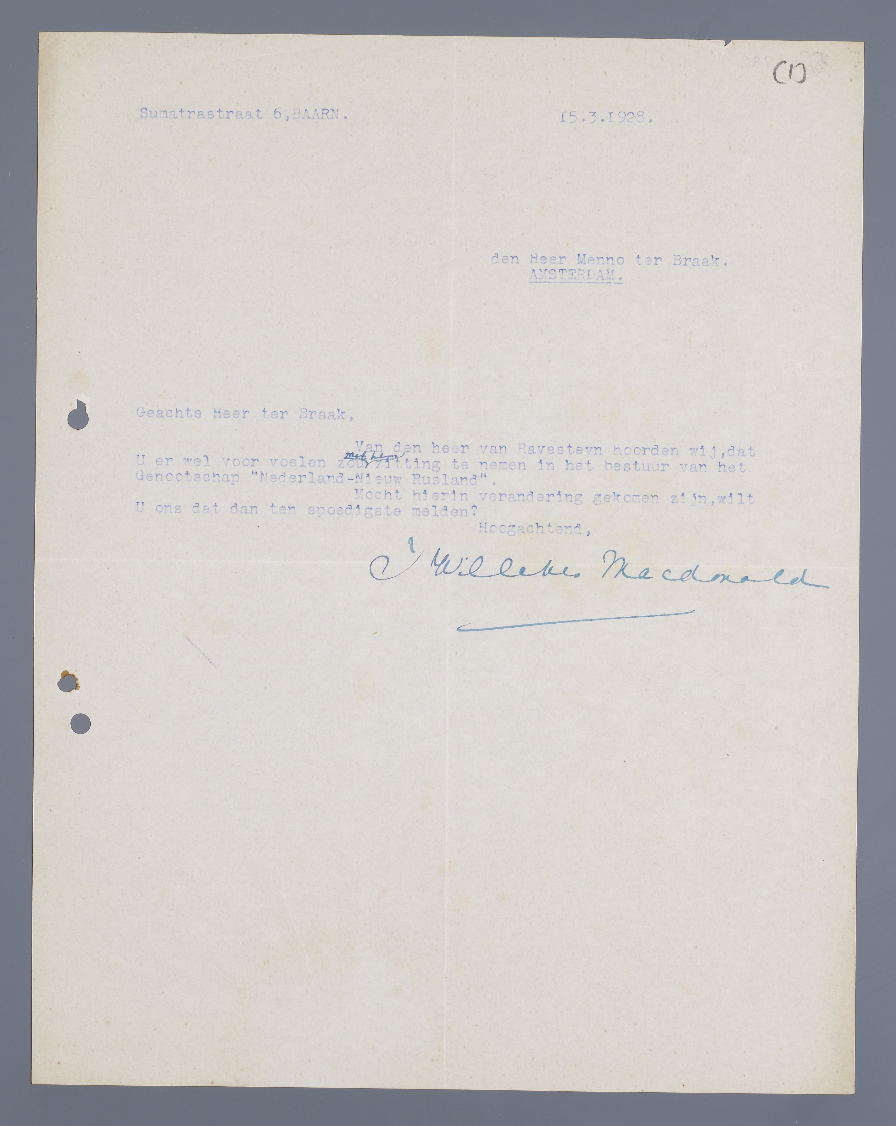 Van den heer van Ravesteyn hoorden wij, dat U er wel voor voelen zou met hem zitting te nemen in het bestuur van het ‘Genootschap Nederland-Rusland’.