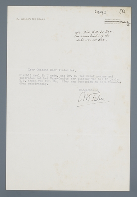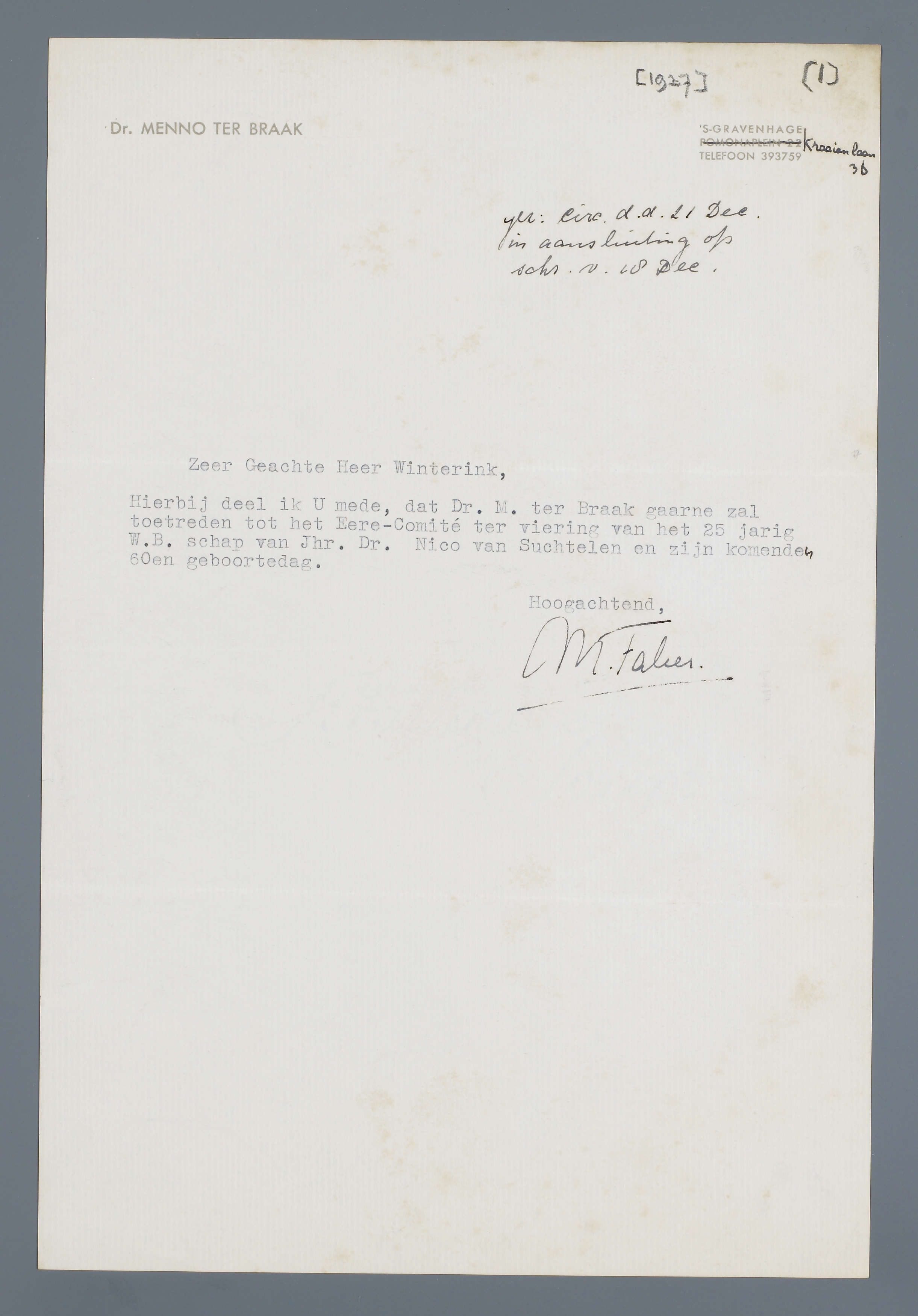 Hierbij deel ik U mede, dat Dr. M. ter Braak gaarne zal toetreden tot het Eere-Comité ter viering van het 25 jarig W.B. schap van Jhr. Dr. Nico van Suchtelen en zijn komenden 60en geboortedag.