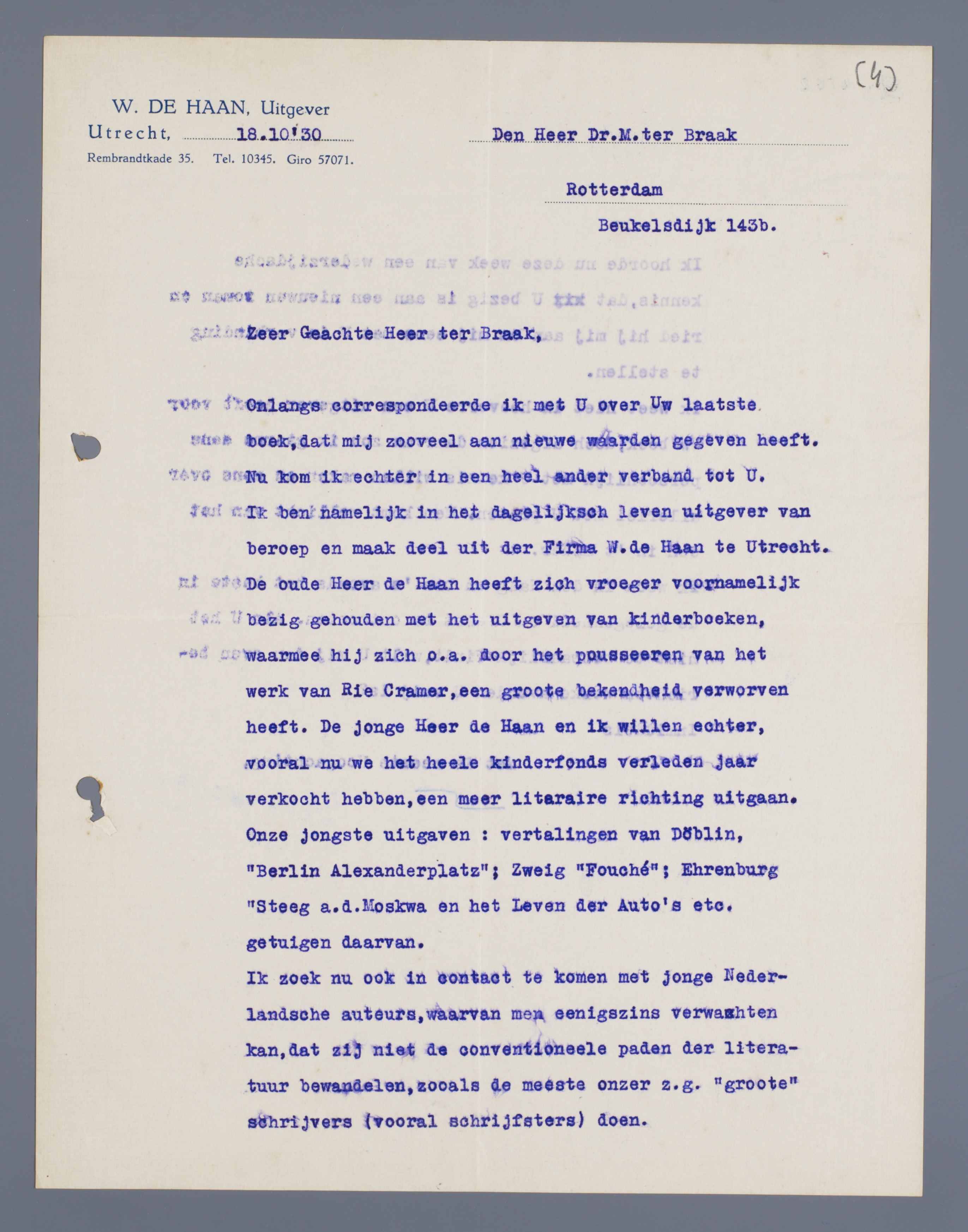 Onlangs correspondeerde ik met U over Uw laatste boek, dat mij zooveel aan nieuwe waarden gegeven heeft. Nu kom ik echter in een heel ander verband tot U. Ik ben namelijk in het dagelijksch leven uitgever van beroep en maak deel uit der Firma W. de Haan te Utrecht. De oude Heer de Haan heeft zich vroeger voornamelijk bezig gehouden met het uitgeven van kinderboeken, waarmee hij zich o.a. door het pousseeren van het werk van Rie Cramer, een groote bekendheid verworven heeft. De jonge Heer de Haan en ik willen echter, vooral nu we het heele kinderfonds verleden jaar verkocht hebben, een meer literaire richting uitgaan. Onze jongste uitgaven: vertalingen van Döblin, Berlin Alexanderplatz; Zweig Fouché; Ehrenburg Steeg a.d. Moskwa en het Leven der Auto's etc. getuigen daarvan.