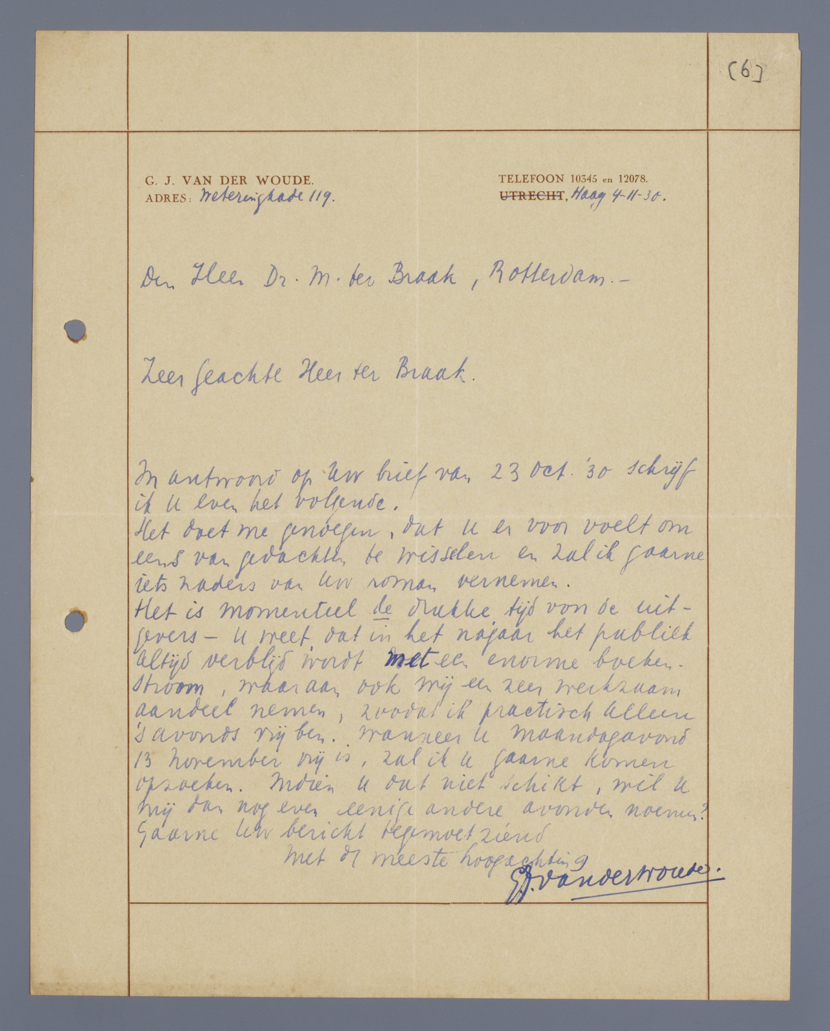 Het is momenteel de drukke tijd voor de uitgevers - U weet, dat in het najaar het publiek altijd verblijd wordt met een enorme boekenstroom, waaraan ook wij een zeer werkzaam aandeel nemen, zoodat ik practisch alleen 's avonds vrij ben. Wanneer U maandagavond 13 november vrij is, zal ik U gaarne komen opzoeken. Indien U dat niet schikt, wil U mij dan nog even eenige andere avonden noemen?