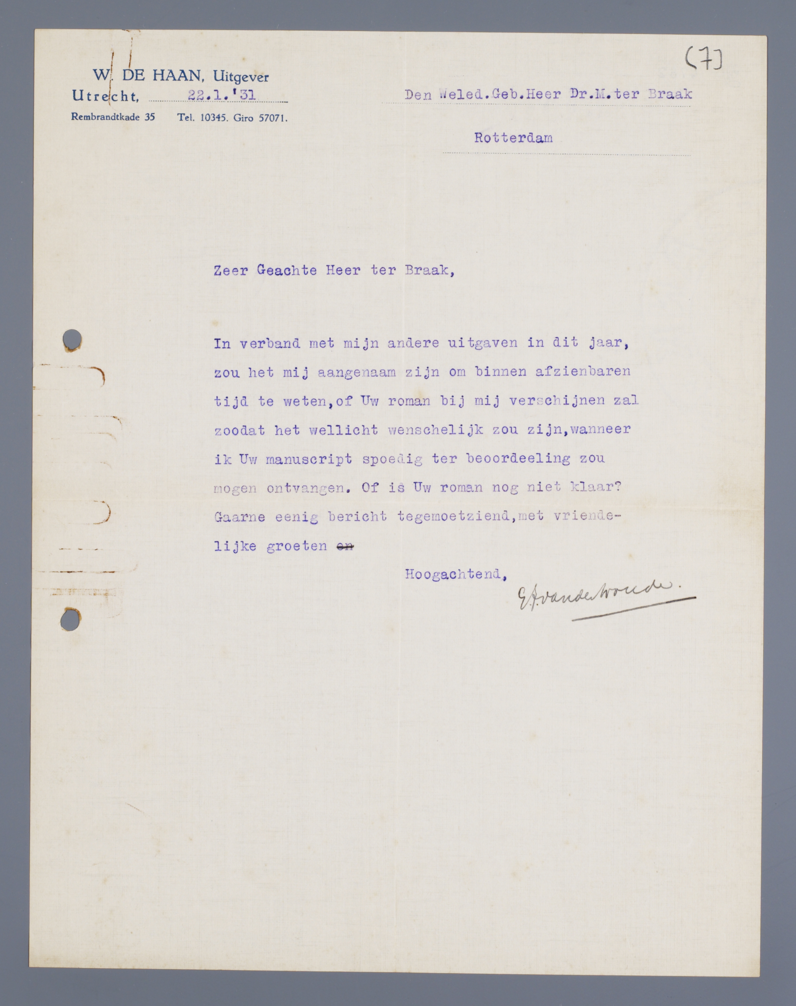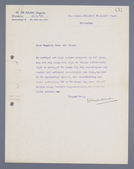 In verband met mijn andere uitgaven in dit jaar, zou het mij aangenaam zijn om binnen afzienbaren tijd te weten, of Uw roman bij mij verschijnen zal zoodat het wellicht wenschelijk zou zijn, wanneer ik Uw manuscript spoedig ter beoordeling zou mogen ontvangen. Of is Uw roman nog niet klaar? Gaarne eenig bericht tegemoetziend, met vriendelijke groeten