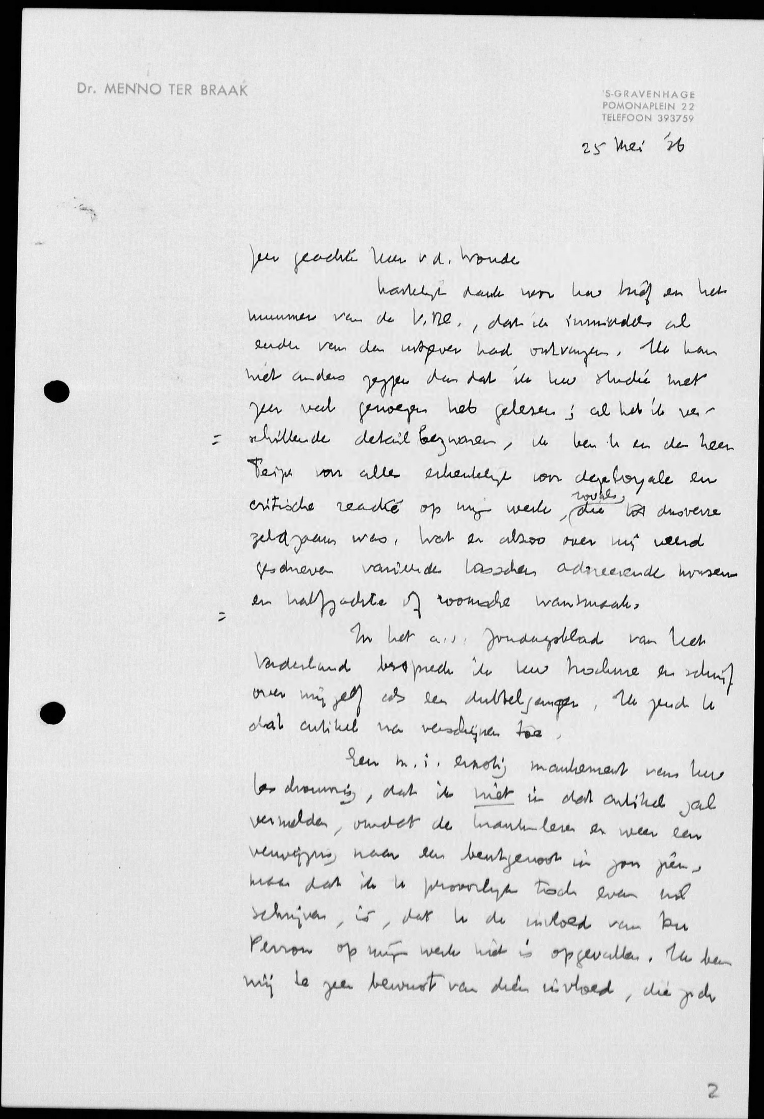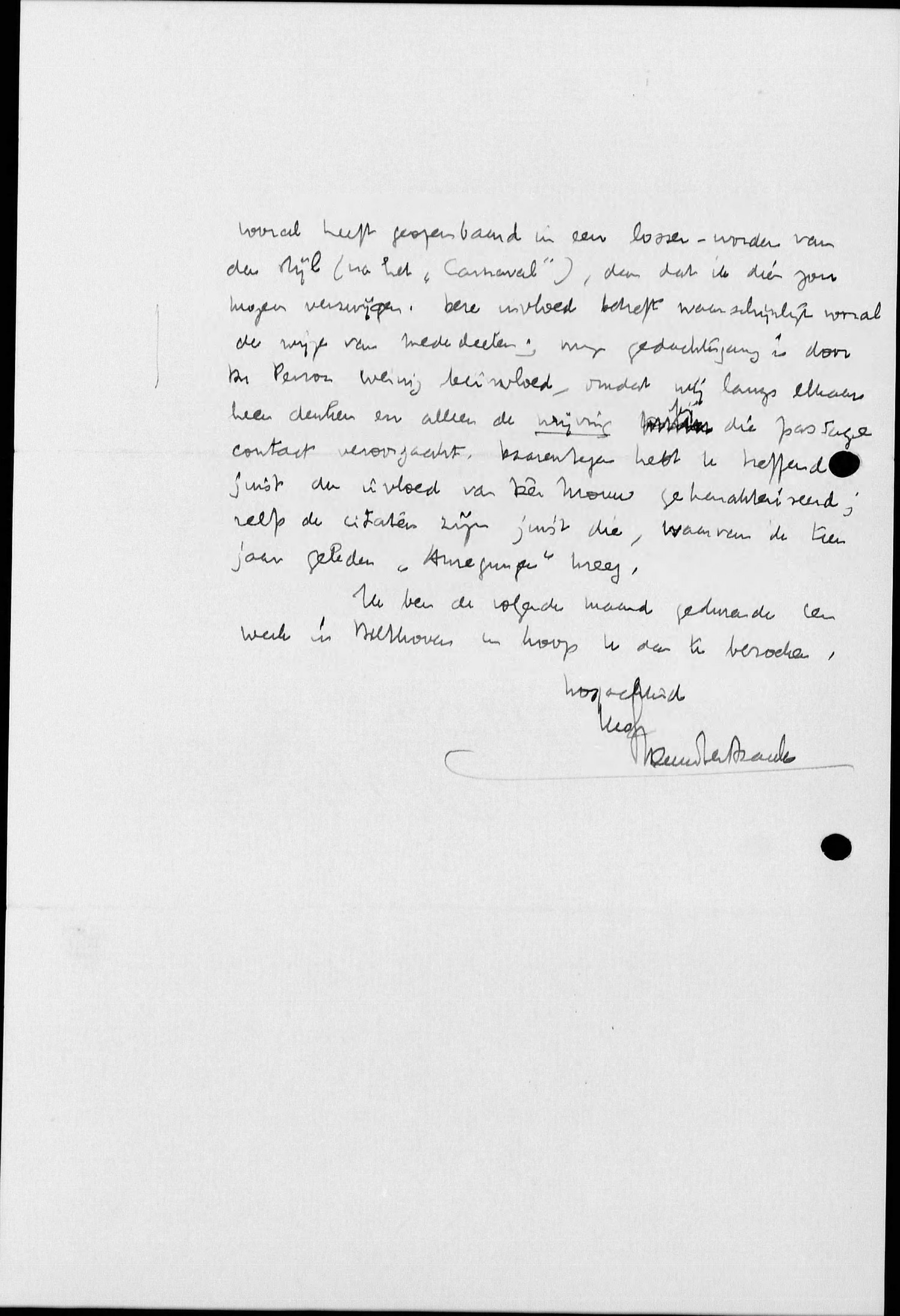 Hartelijk dank voor Uw brief en het nummer van de V.Bl., dat ik inmiddels al eerder van den uitgever had ontvangen. Ik kan niet anders zeggen dan dat ik Uw studie met zeer veel genoegen heb gelezen; al heb ik verschillende detail bezwaren, ik ben U en den heer Teipe voor alles erkentelijk voor deze loyale en critische reactie op mijn werk, zooals die tot dusverre zeldzaam was. Wat er alzoo over mij werd geschreven varieerde tusschen adoreerende nonsens en halfzachte of roomsche wansmaak.