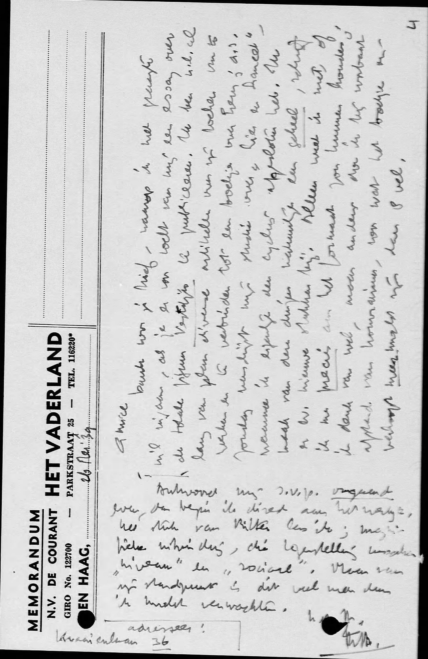 Dank voor je brief, waarop ik met graagte wil ingaan, als je er voor voelt van mij een essay over de totale figuur Vestdijk te publiceeren. Ik ben n.l. al lang van plan diverse artikelen over zijn boeken om te werken en te verbinden tot een boekje over hem; a.s. Zondag verschijnt mijn studie over ‘Lier en Lancet’, waarmee ik eigenlijk den cyclus afgesloten heb. Ik maak van deze dingen natuurlijk een geheel, schrijf er ev. nieuwe stukken bij. Alleen weet ik niet, of ik me precies aan het formaat zou kunnen houden; ik denk van wel, maar anders doe ik bij voorbaat afstand van honorarium, voor wat het boekje onverhoopt meer mocht zijn dan 8 vel.