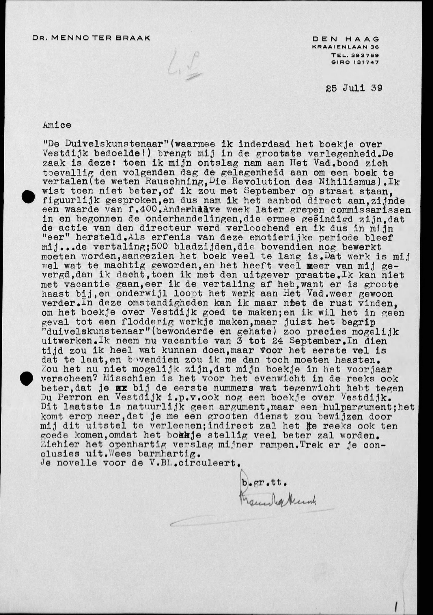 ‘De Duivelskunstenaar’ (waarmee ik inderdaad het boekje over Vestdijk bedoelde!) brengt mij in de grootste verlegenheid. De zaak is deze: toen ik mijn ontslag nam aan Het Vad. bood zich toevallig den volgenden dag de gelegenheid aan om een boek te vertalen (te weten Rauschning, Die Revolution des Nihilismus). Ik wist toen niet beter, of ik zou met September op straat staan, figuurlijk gesproken, en dus nam ik het aanbod direct aan, zijnde een waarde van f.400. Anderhalve week later grepen commissarissen in en begonnen de onderhandelingen, die ermee geëindigd zijn, dat de actie van den directeur werd verloochend en ik dus in mijn ‘eer’ hersteld. Als erfenis van deze emotierijke periode bleef mij… de vertaling; 500 bladzijden, die bovendien nog bewerkt moeten worden, aangezien het boek veel te lang is. Dat werk is mij wel wat te machtig geworden, en het heeft veel meer van mij gevergd, dan ik dacht, toen ik met den uitgever praatte. Ik kan niet met vacantie gaan, eer ik de vertaling af heb, want er is groote haast bij, en onderwijl loopt het werk aan Het Vad. weer gewoon verder. In deze omstandigheden kan ik maar niet de rust vinden, om het boekje over Vestdijk goed te maken; en ik wil het in geen geval tot een flodderig werkje maken, maar juist het begrip ‘duivelskunstenaar’ (bewonderde en gehate) zoo precies mogelijk uitwerken. Ik neem nu vacantie van 3 tot 24 September. In dien tijd zou ik heel wat kunnen doen, maar voor het eerste vel is dat te laat, en bovendien zou ik me dan toch moeten haasten. Zou het nu niet mogelijk zijn, dat mijn boekje in het voorjaar verscheen? Misschien is het voor het evenwicht in de reeks ook beter, dat je bij de eerste nummers wat tegenwicht hebt tegen Du Perron en Vestdijk i.p.v. ook nog een boekje over Vestdijk. Dit laatste is natuurlijk geen argument, maar een hulpargument; het komt erop neer, dat je me een grooten dienst zou bewijzen door mij dit uitstel te verleenen; indirect zal het je reeks ook ten goede komen, omdat het boekje stellig veel beter zal worden.